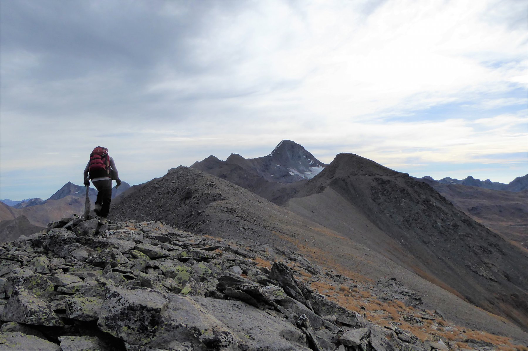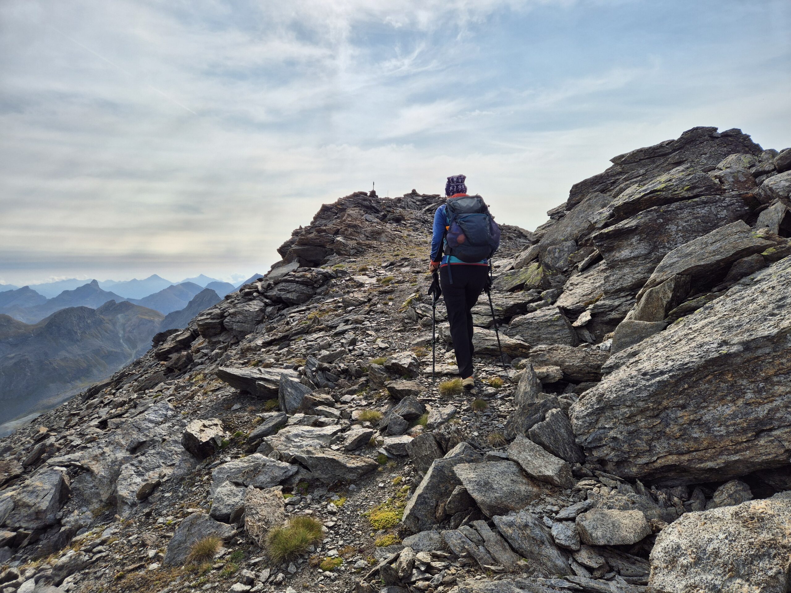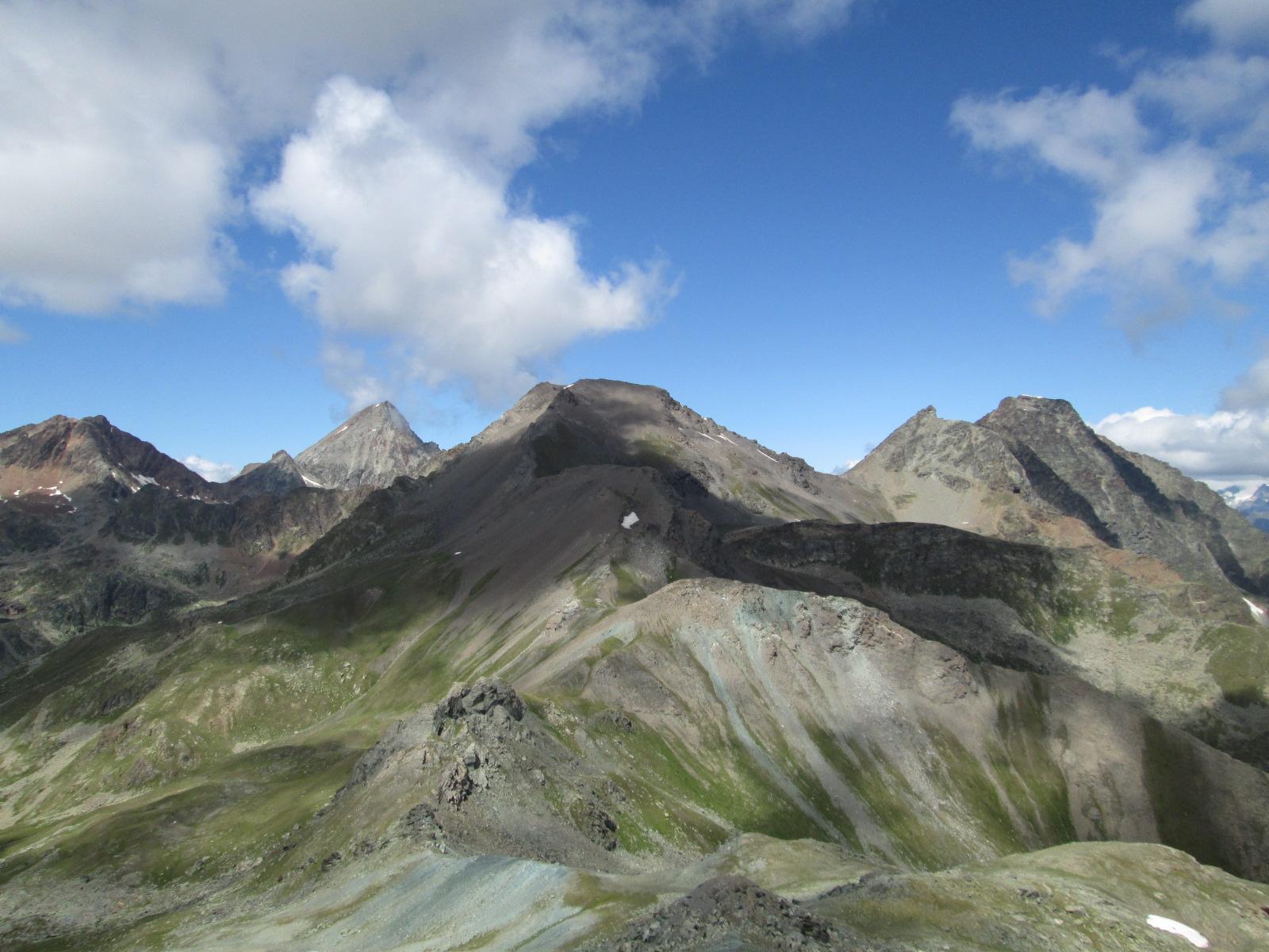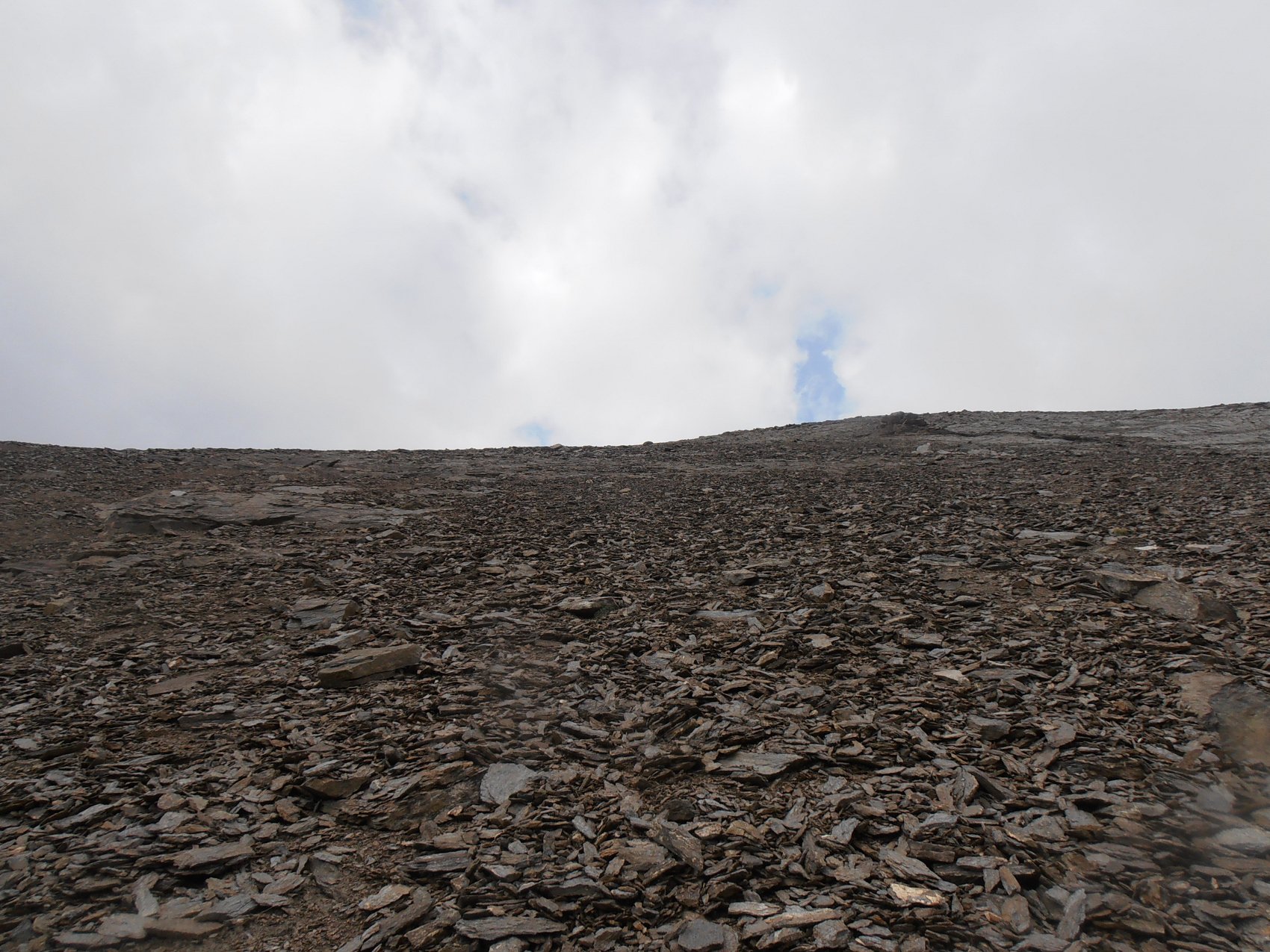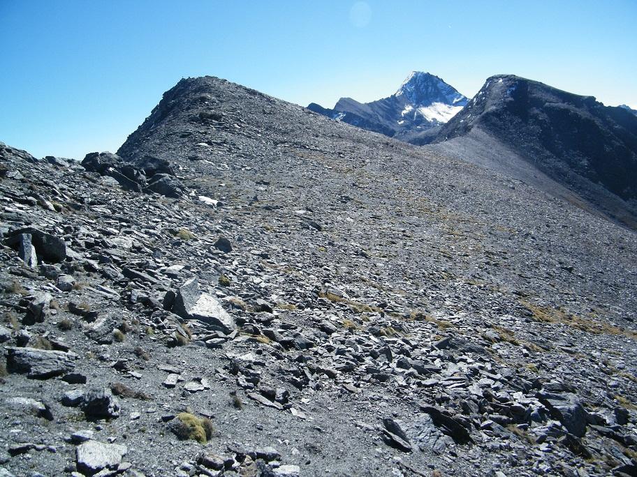 La cresta prosegue erbosa e detritica, si sale una rampa terrosa e ci si riporta sul filo. Si supera un tratto più ripido su terreno instabile (traccia di sentiero) uscendo su una spalletta a W della vetta.