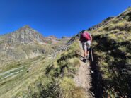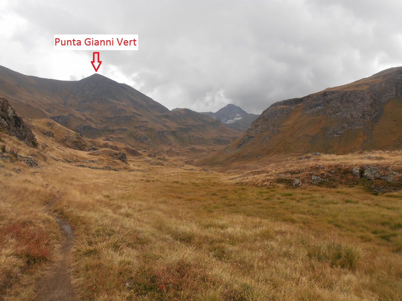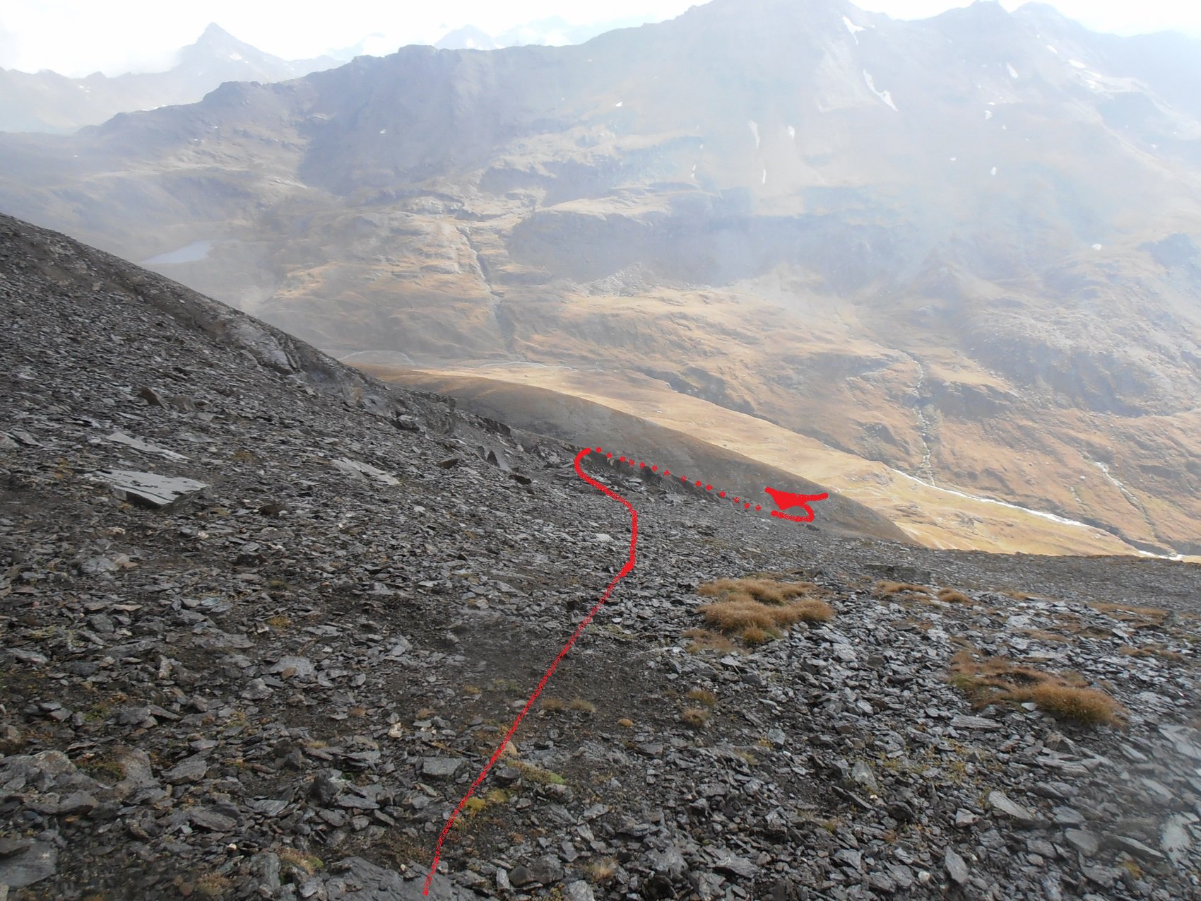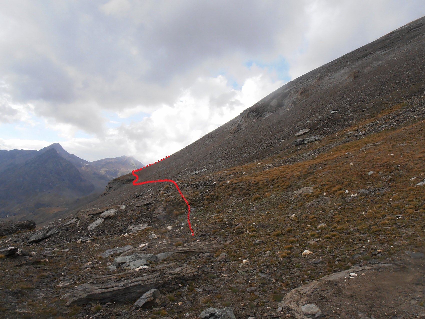 Si segue il bel sentiero che sale al colle di Saint Marcel 2916 m. Quindi si segue la cresta verso SE, evitando a sinistra il primo risalto roccioso.