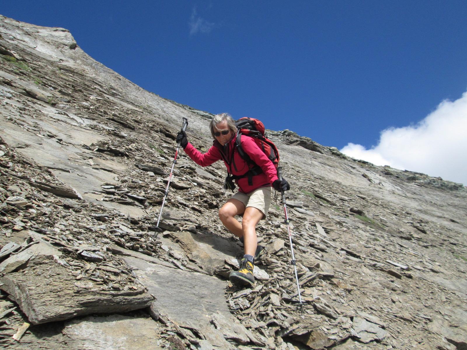 Salendo al Bivacco Muggia-Glarey dove abbiamo pernottato x salire l’indomani alla Tersiva, essendo partiti da Gimillian alle 9 ed avendo l’intera giornata a disposizione, abbiamo deciso di allungare un po’ il percorso e di raggiungere anche la Cima di Laval e la Gianni Vert…la salita non presenta problemi, fino al Colle di S. Marcel il sentiero è ben segnato e dopo il percorso è sempre evidente e privo di difficoltà. L’ultima rampa per raggiungere la Gianni Vert è ripida ma molto breve (circa 80 m di dislivello), non si fa nemmeno in tempo a sentire la fatica che è finita!!! Al momento nella prima parte della rampa c’è ancora una piccola lingua di neve compatta che agevola la salita, poi si prosegue su terriccio e sfasciumi fino ad uscire a pochi metri dall’ometto di vetta. Per la discesa, dovendo raggiungere il bivacco, volevamo evitare di tornare indietro per poi risalire, quindi abbiamo chiesto a due persone provvidenzialmente arrivate in cima al momento giusto, se era possibile scendere dal versante opposto. Grazie al loro consiglio, abbiamo proseguito ancora un po’ lungo la cresta superando la piccola elevazione successiva alla Gianni Vert, e scendendo poi su un pendio erboso che termina dopo poche decine di metri. Qui c’è l’unico tratto delicato della discesa, poiché occorre superare un breve tratto ripido e caratterizzato da placche lisce ricoperte da detriti e pietre mobili con anche qualche piccolo salto roccioso da aggirare…sono solo 50 metri di dislivello ma richiede molta attenzione nell’individuare i passaggi migliori e prudenza perché scivolare qui sarebbe tutt’altro che piacevole!!! Superato questo breve tratto in pochi minuti si atterra sul pianoro della Tete Doriere, e da qui in breve al bivacco.