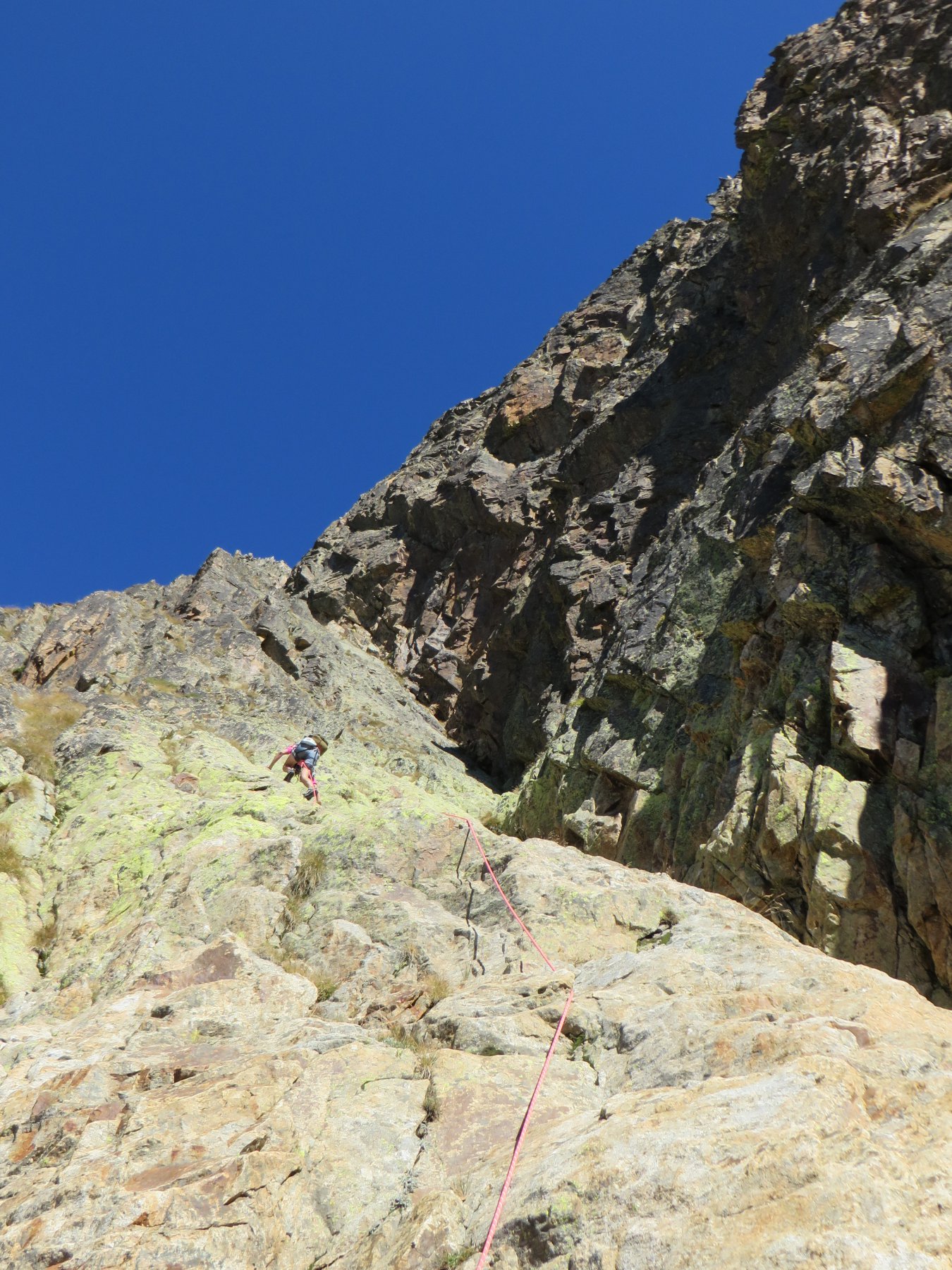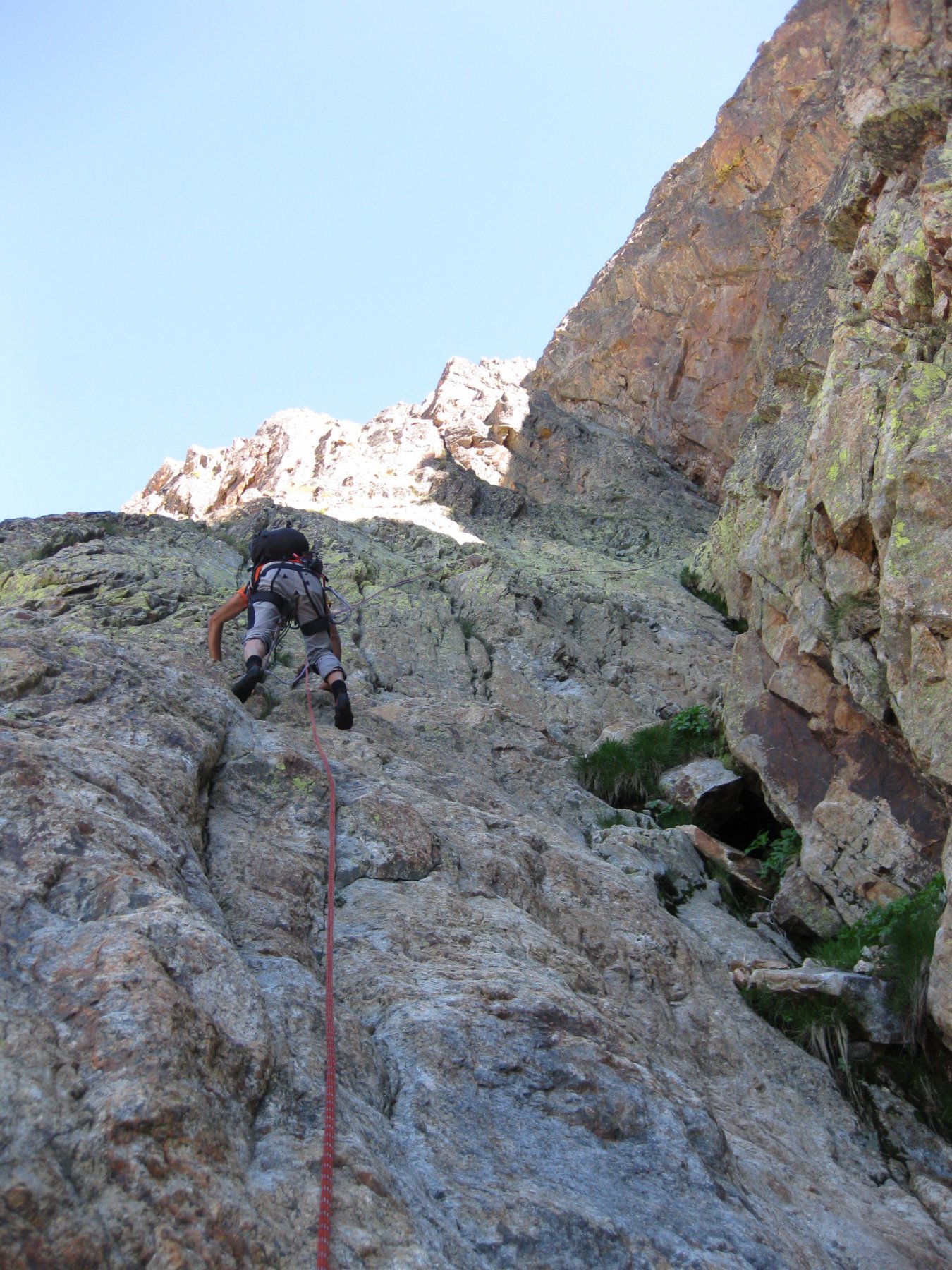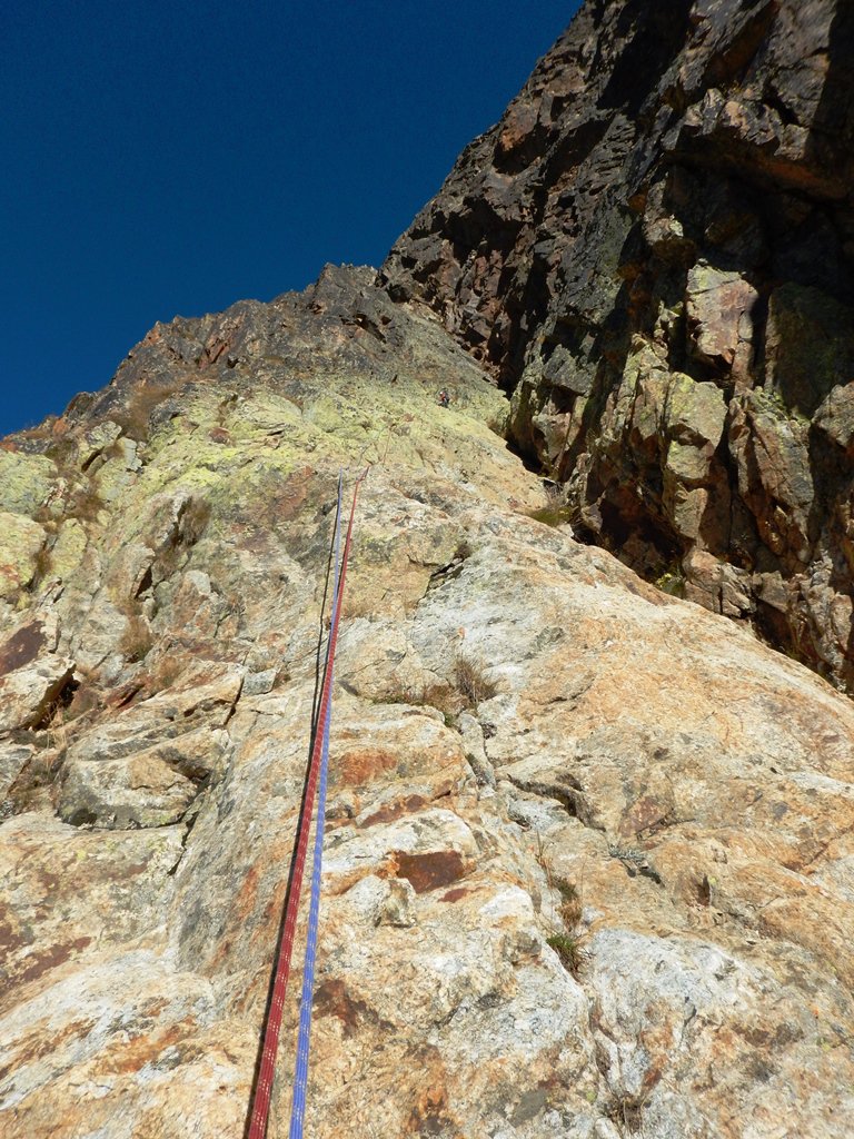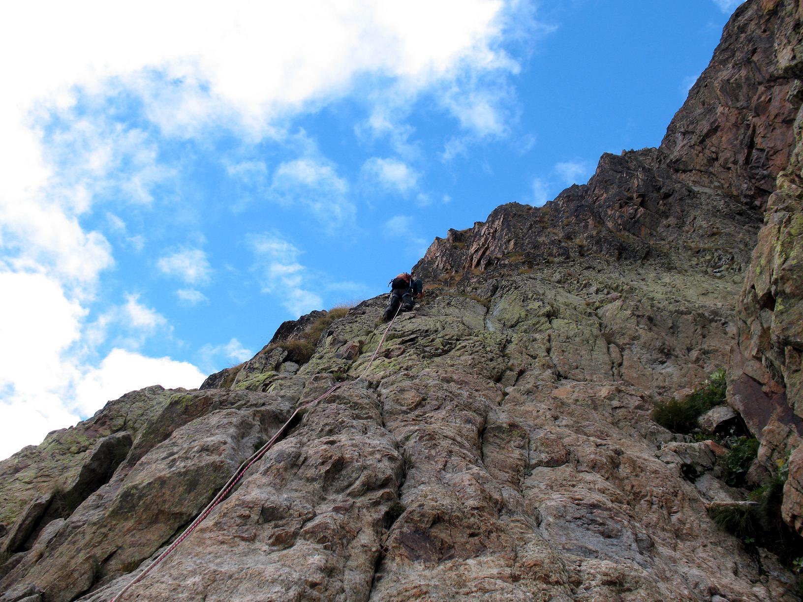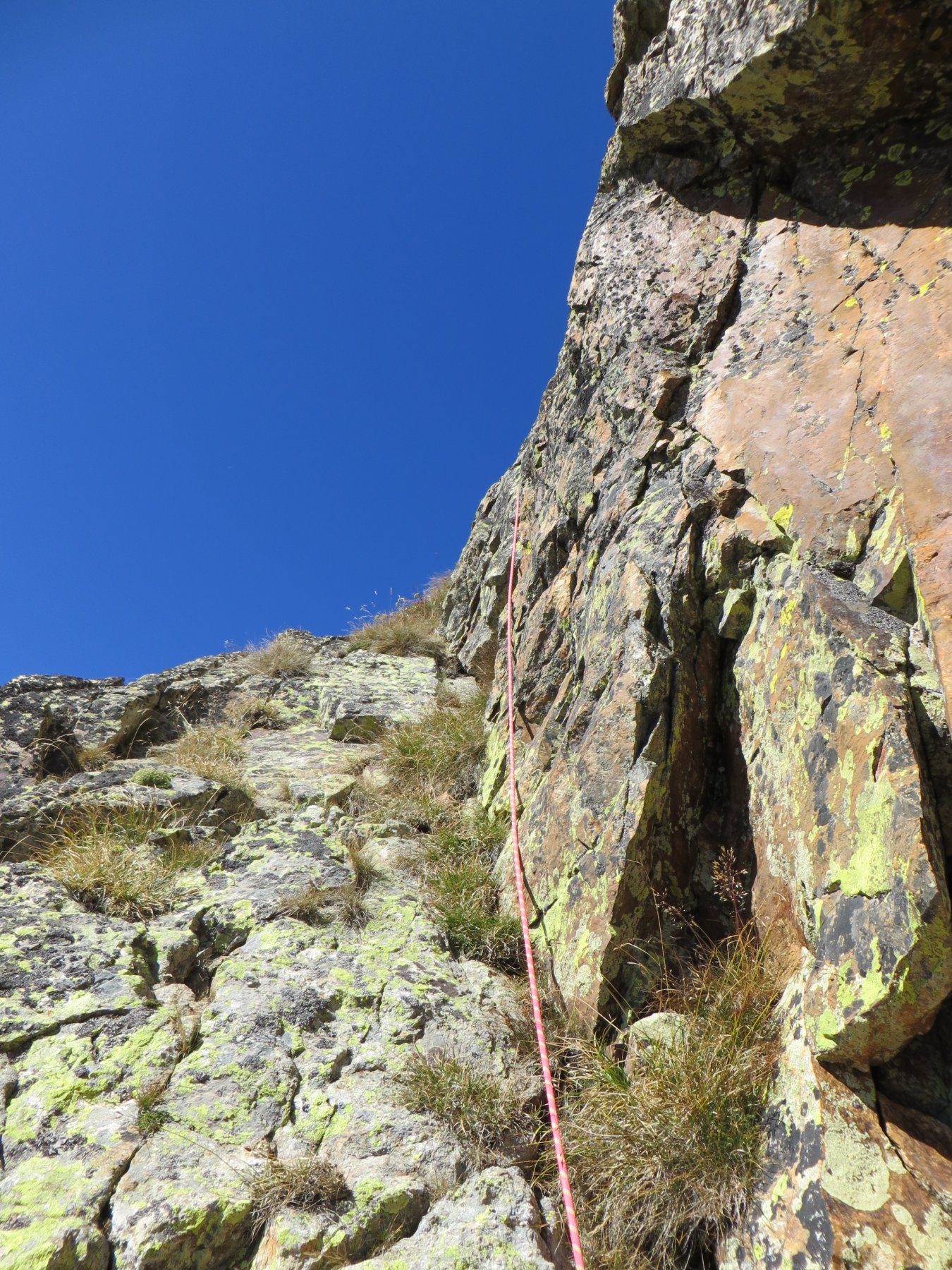 Si giunge così sotto un tratto più ripido che sale su una bella placca articolata (IV) tenendosi una decina di metri a sinistra del diedro canale, dopo una trentina di metri ci si sposta su una cengetta. Si prosegue poi per placche inclinate (III) e poi per rocce facili per una quarantina di metri fino ad arrivare all’ultimo risalto. Si segue infine una rampetta obliqua sulla sinistra su rocce instabili che porta alla cresta sommitale ed alla vetta della quota 2701.
