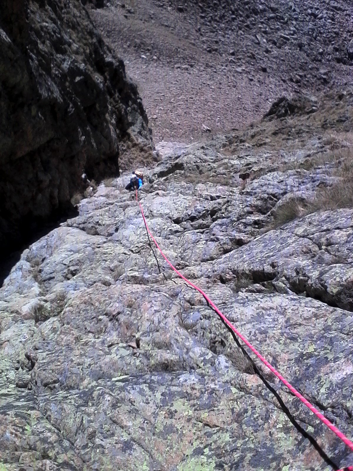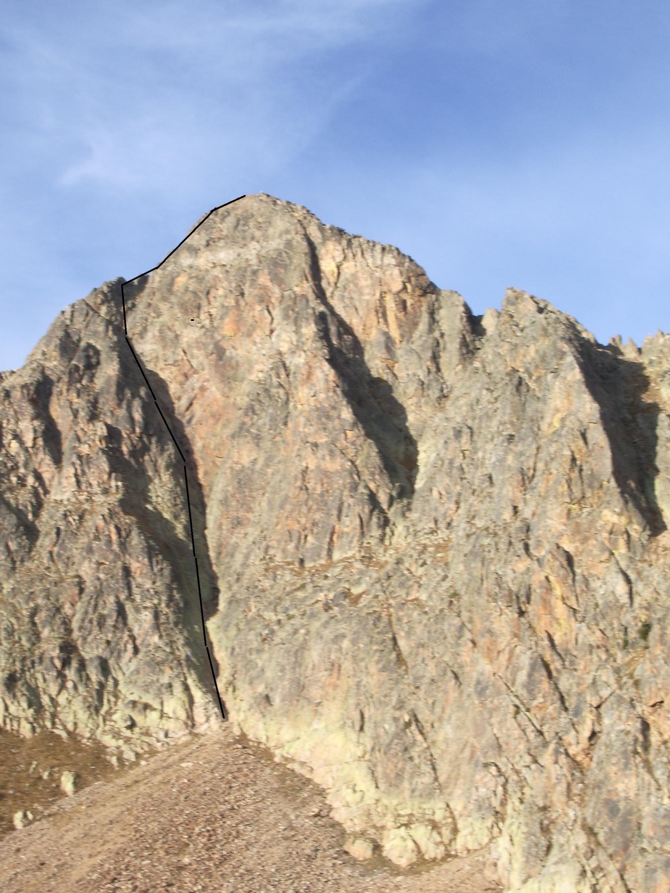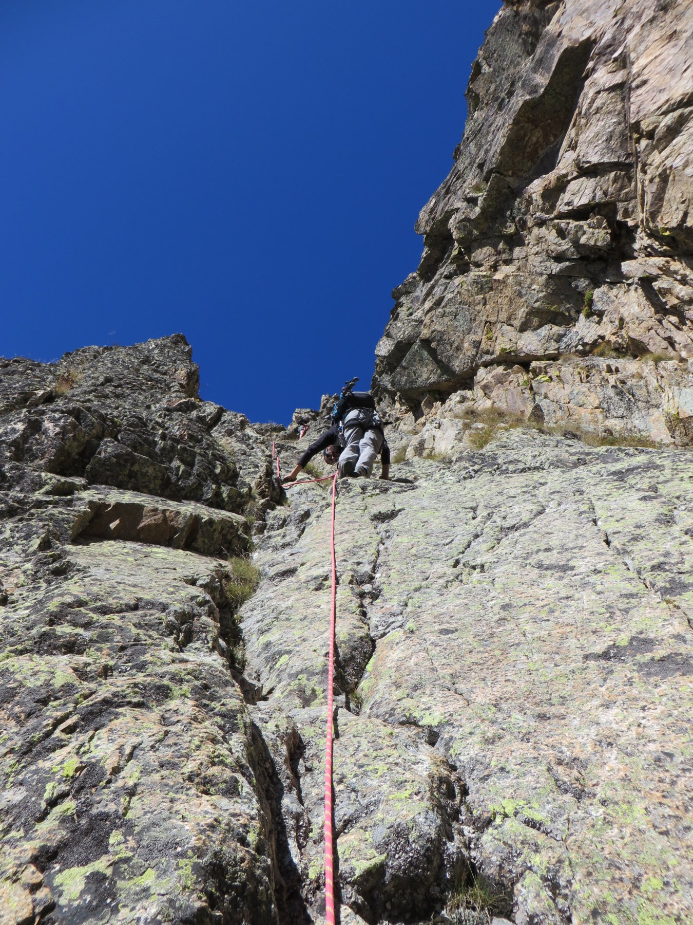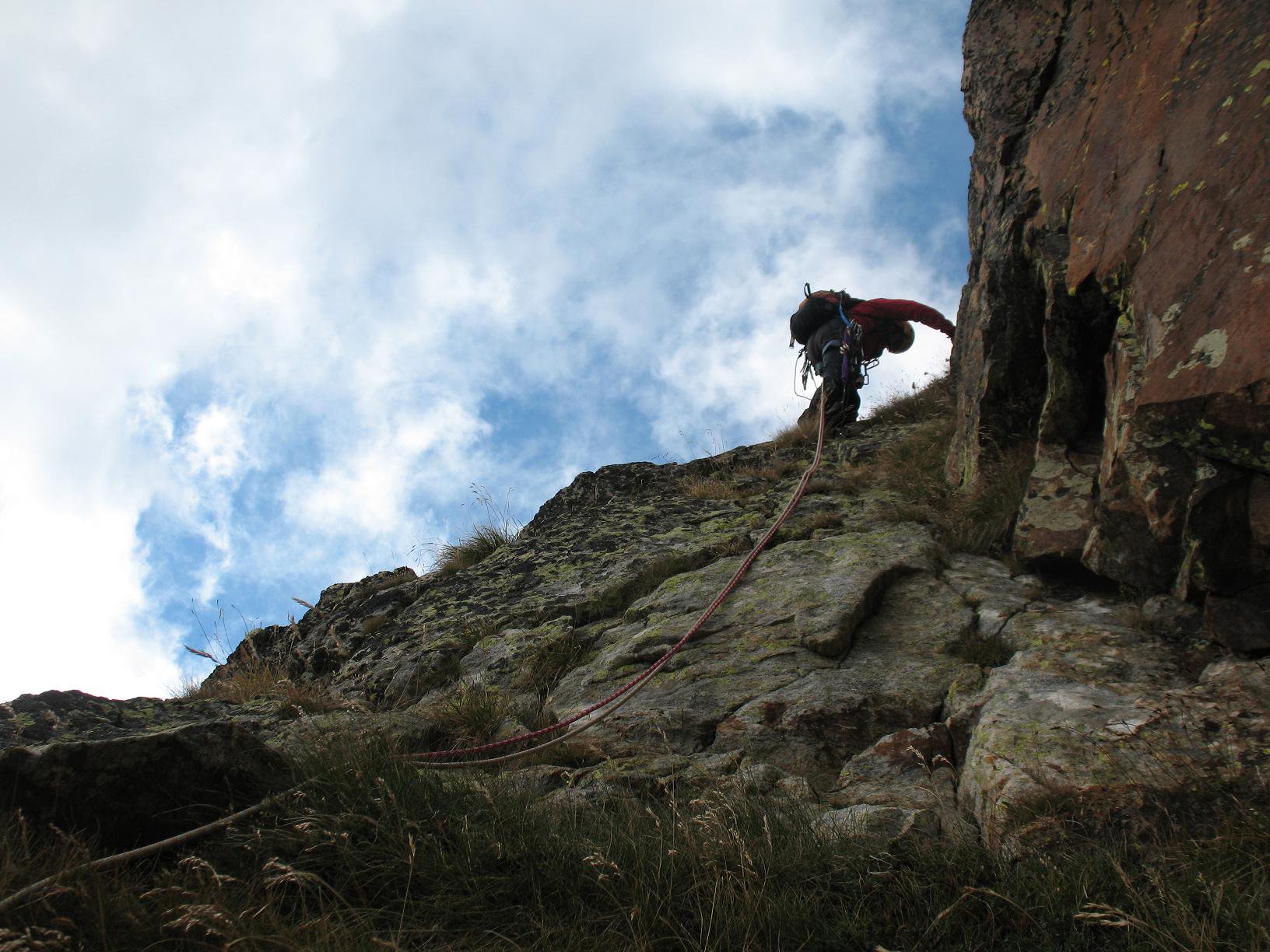 Si giunge così sotto un tratto più ripido che sale su una bella placca articolata (IV) tenendosi una decina di metri a sinistra del diedro canale, dopo una trentina di metri ci si sposta su una cengetta. Si prosegue poi per placche inclinate (III) e poi per rocce facili per una quarantina di metri fino ad arrivare all’ultimo risalto. Si segue infine una rampetta obliqua sulla sinistra su rocce instabili che porta alla cresta sommitale ed alla vetta della quota 2701.