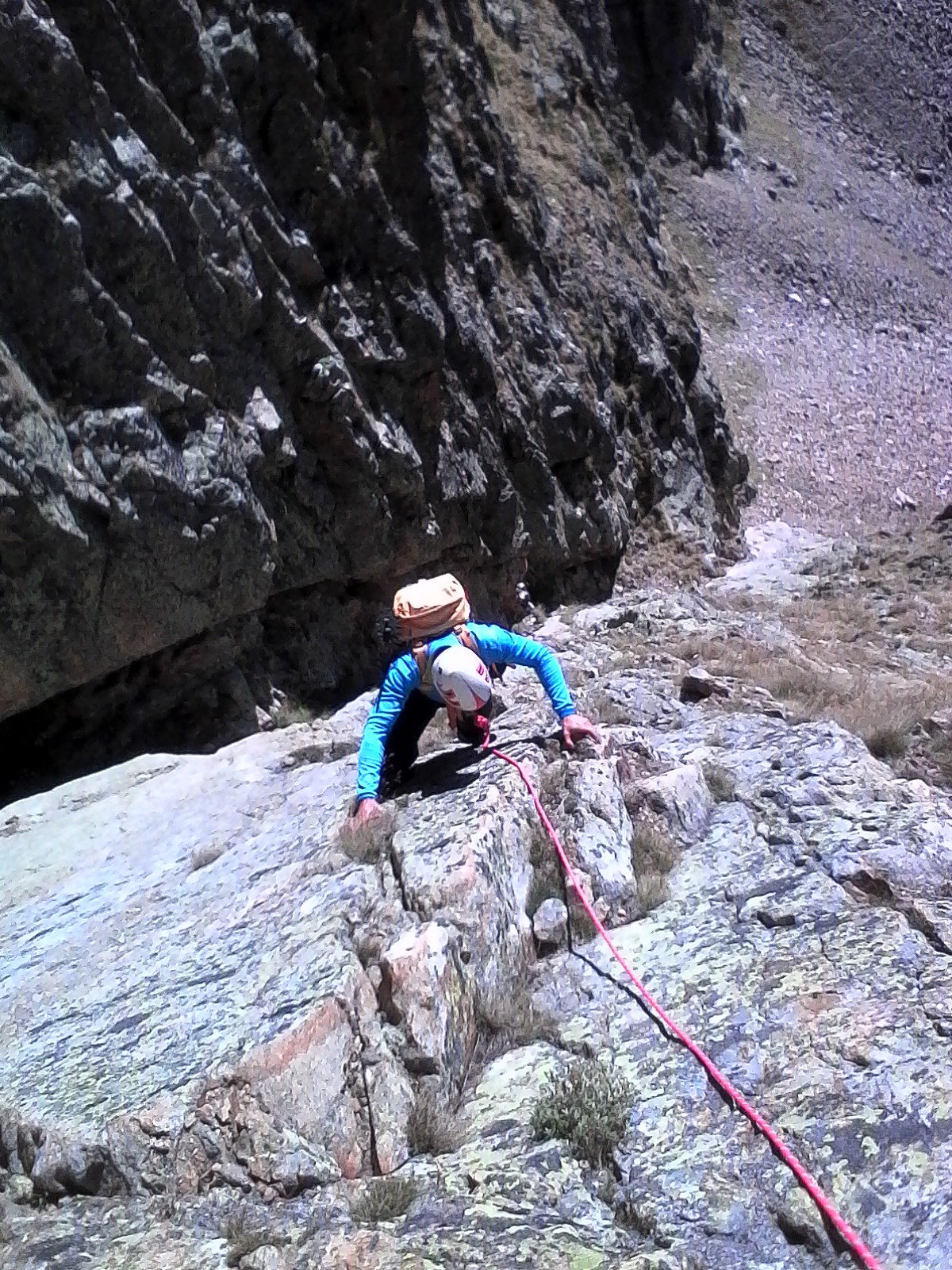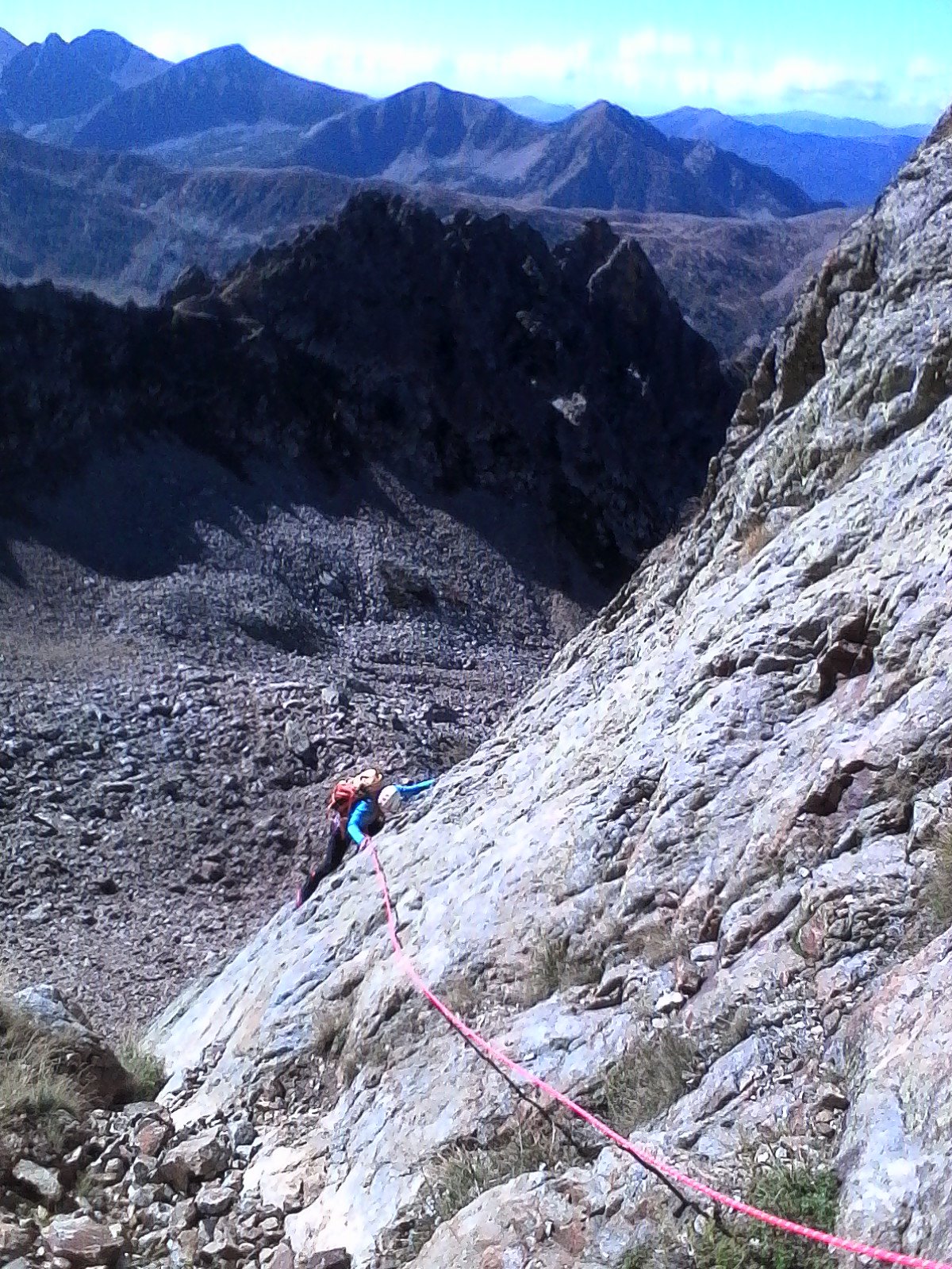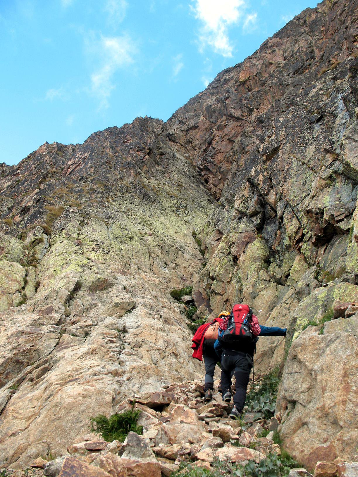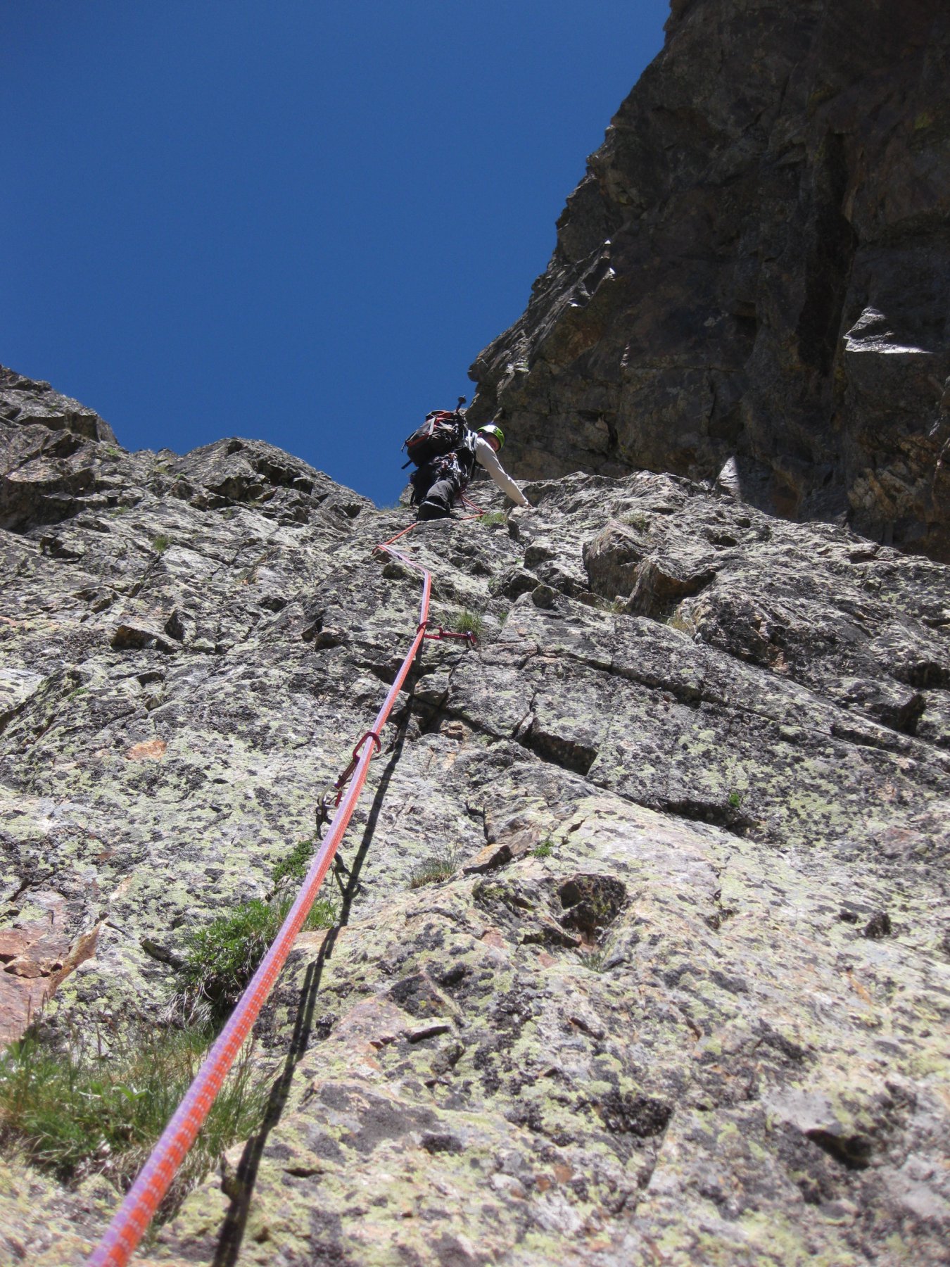 Si giunge così sotto un tratto più ripido che sale su una bella placca articolata (IV) tenendosi una decina di metri a sinistra del diedro canale, dopo una trentina di metri ci si sposta su una cengetta. Si prosegue poi per placche inclinate (III) e poi per rocce facili per una quarantina di metri fino ad arrivare all’ultimo risalto. Si segue infine una rampetta obliqua sulla sinistra su rocce instabili che porta alla cresta sommitale ed alla vetta della quota 2701.