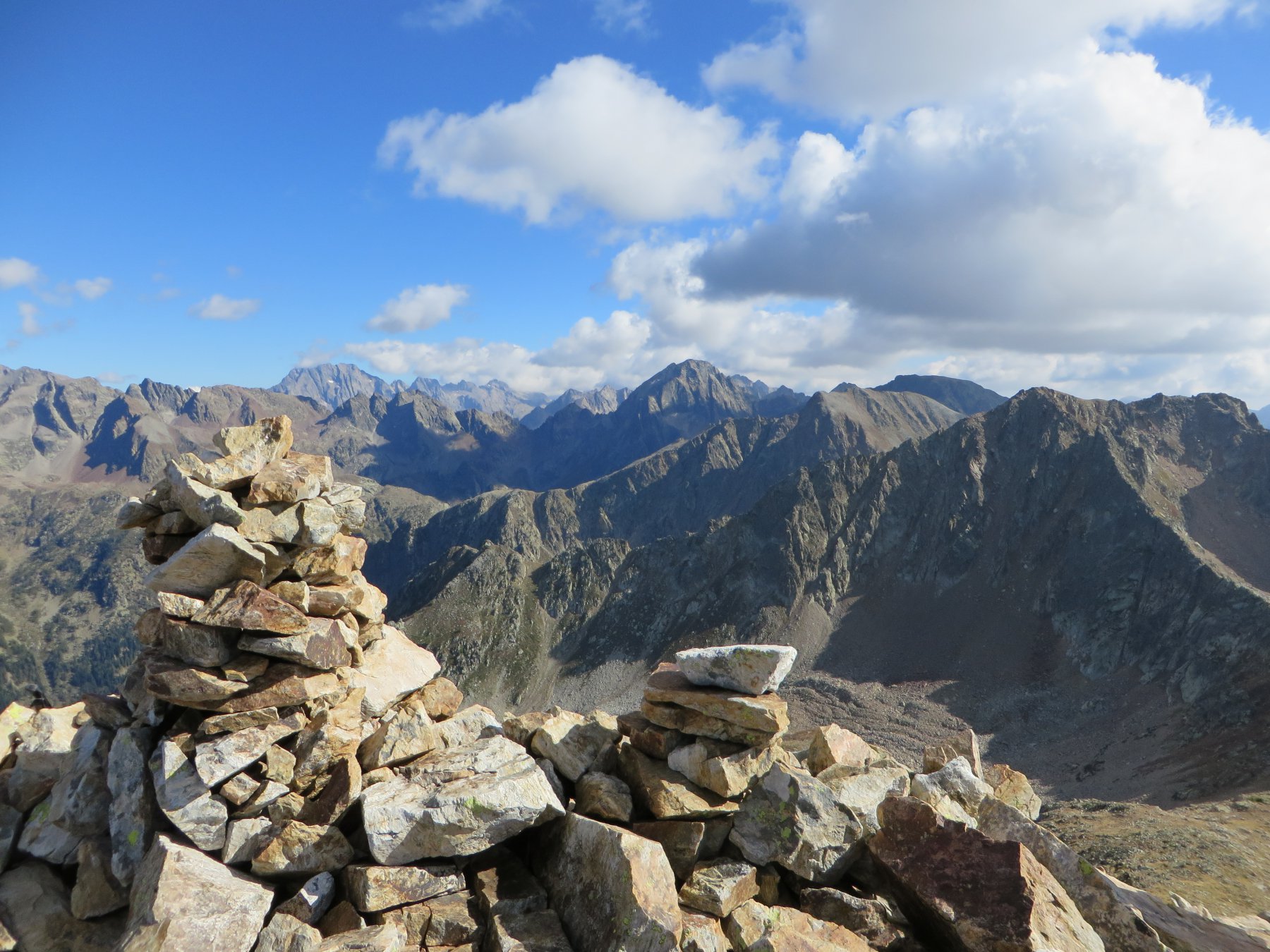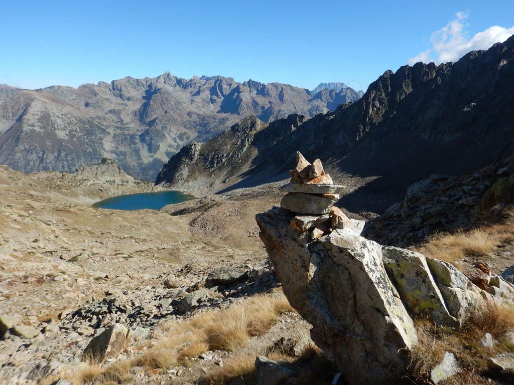 Discesa: per tracce si scende la pietraia che porta al colletto fra la quota e la vetta, dove seguendo gli ometti si piega a dx (Sud) in direzione del colle Aver. Raggiunto il passo si ritrova il sentiero dell’andata.