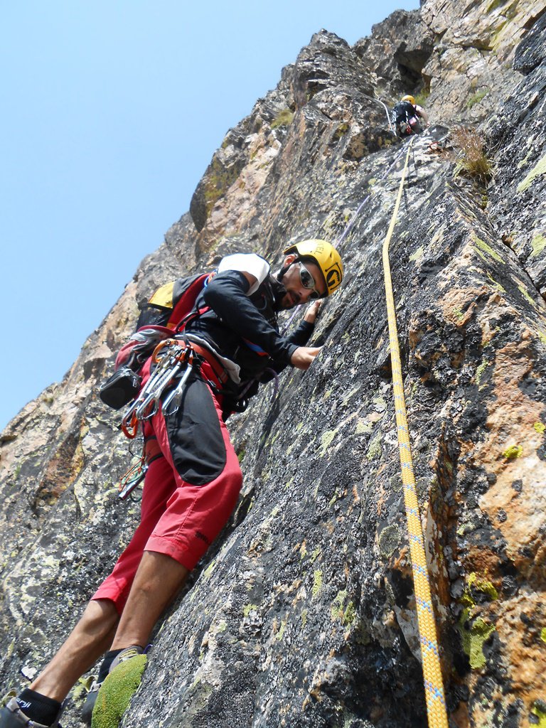 Salita solare in bell’ambiente di alta montagna, interessanti gli ultimi due tiri. Un pò di lichene e pietre instabili (essendo gli ultimi abbiamo scaricato un pò di roba e controllato il serraggio delle soste).