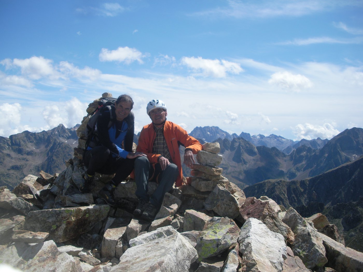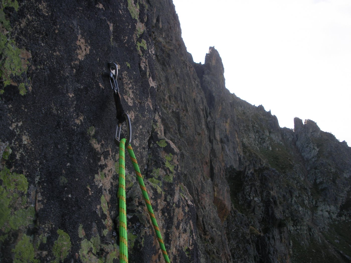 Bella linea verticale di roccia ottima. Qualcosa muove nella parte alta, ma ne questo ne il lichene presente in abbondanza da soli non costituiscono motivo sufficiente a spiegare il perche’ della cosi scarsa frequentazione. Chiodata con ottica moderna . Gli spit sono collocati dove effettivamente servono . Dove facile al limite per maggiore sicurezza si puo’ integrare con protezioni veloci, comunque non strettamente necessarie. Rispetta i criteri tipici delle salite d’alta montagna dove la chiodatura in genere e’ distante come e’ qui’ in effetti. Abbiamo seguito la linea iniziale a dx del diedro-canale con bel passo adrenalinico di V+ fino alla cengia. In questo caso una D+. Per il resto seguito la via originale dello sperone richiodata di recente. Faticoso il camino centrale con strozzatura al seguito. Una bella dulfer sul finale chiude una lunga serie di passaggi a volte atletici e in molteplici altri casii di pura aderenza. Comodo e breve l’accesso, arioso e rilassante l’ambiente tutt’attorno. Capatina di rito in vetta (con questa e’ ormai la terza) a scalata terminata. Meteo gradevole con spiccata tendenza al bello, in controtendena con le previsioni che davano temporali al pomeriggio. Al loro posto invece cieli progressivamente sempre piu’ sereni. Mica si puo’ sempre indovinare ogni volta..!