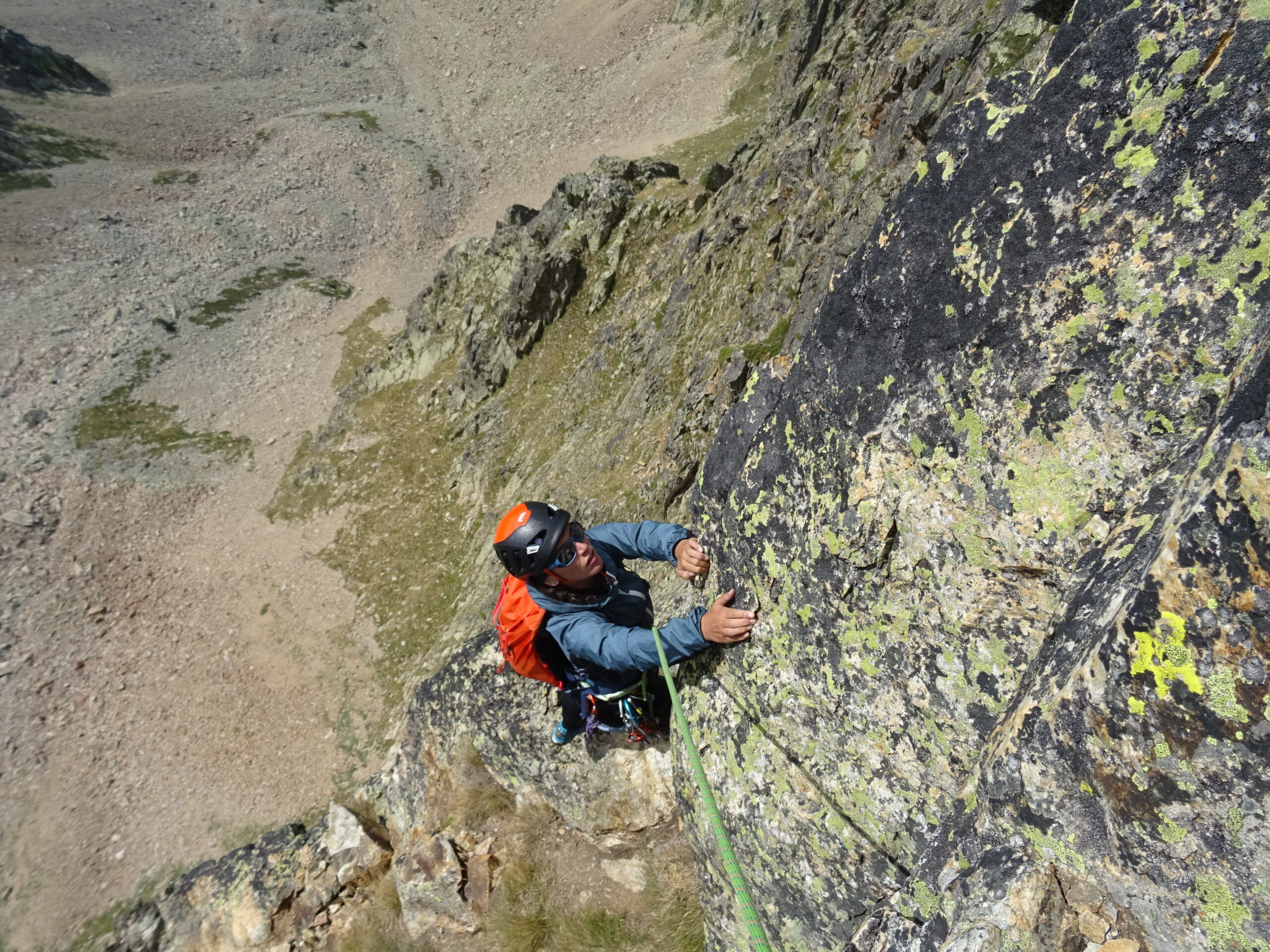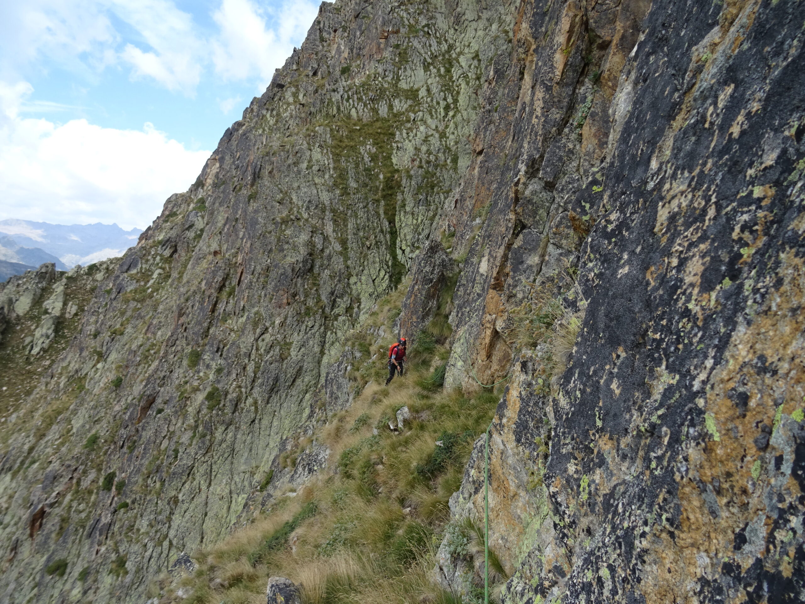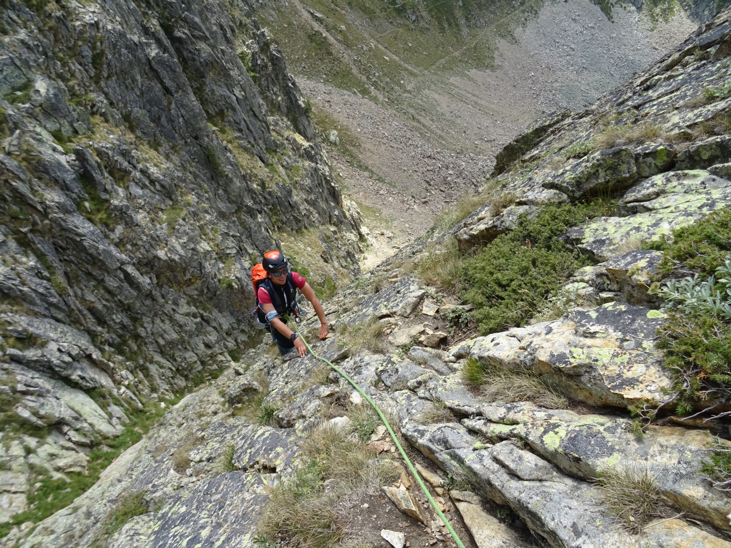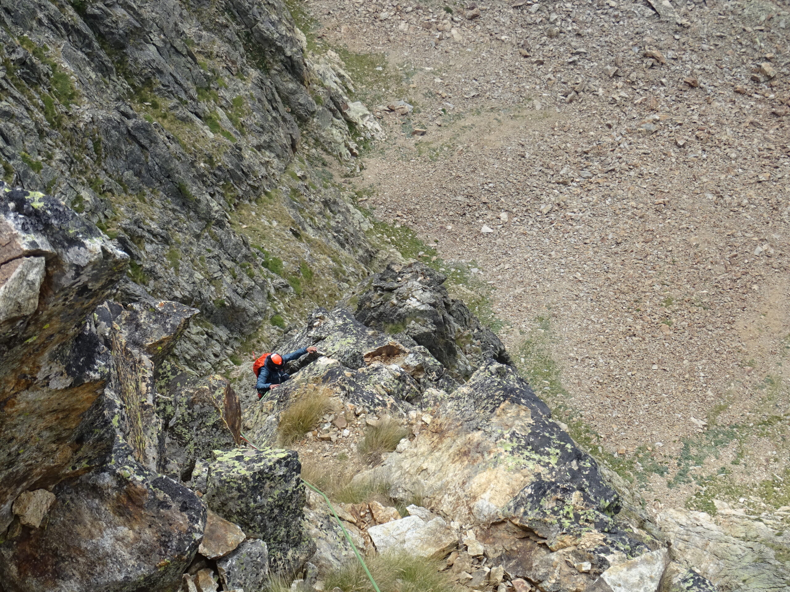 Avvicinamento veloce, fresco ed evidente. Abbiamo unito, salendo in conserva lunga protetta L1+L2: su L1 ho trovato un ch. (utile cordino per rinviarlo, altrimenti il buco è troppo piccolo) dopo il quale, obliquando 2m a dx si trovano 2 fix. Su L3 dopo il primo muretto spostarsi di nuovo a sx verso un caminetto, il fix non si vede bene da sotto. Attenzione a qualche masso instabile lungo L4. Ho sostato alla forcella dopo la placca scura di L4 (bel pietrone su cui mettere un cordino) perché i 2 francesi pasticcioni che avevamo davanti non avevano visto la sosta poco più sopra e si sono fermati lì: poco male, così facendo si evitano gli attriti. Ultimo tiro forse il più interessante della salita, attenzione solo alla roccia dopo il camino. Proseguito poi fino alla cima vera e propria per goderci il panorama in solitudine. Materiale utilizzato: corda da 60m, 4 friend medio-piccoli (forse più utili medio-grandi, tipo 0.75-2BD), 8 rinvii (di cui 3 allungabili). Saliti comodamente in scarpe da approach.