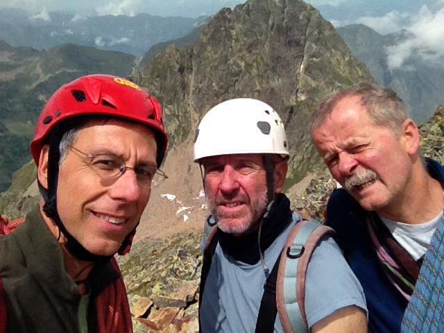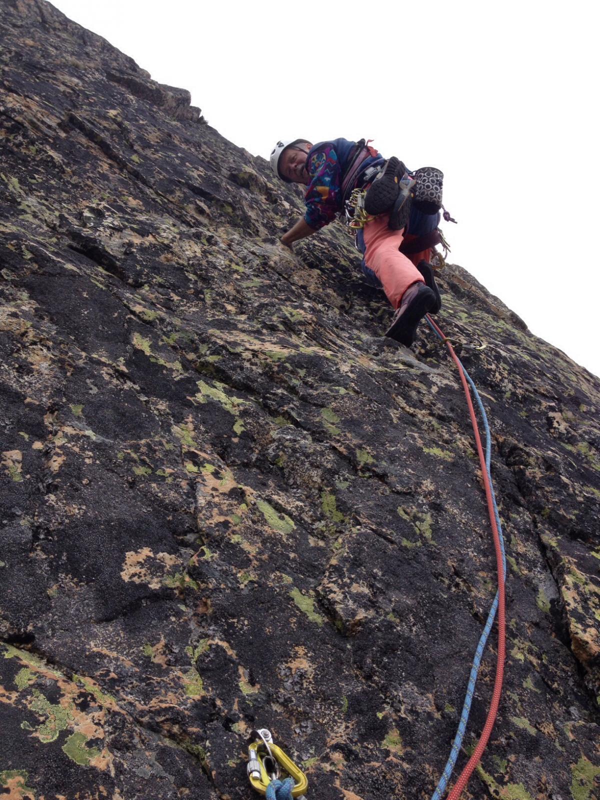 Per evitare il rischio di tiraggio eccessivo delle corde abbiamo diviso la quinta lunghezza in due, facendo sosta su fettuccia sulla cima del primo gendarme.