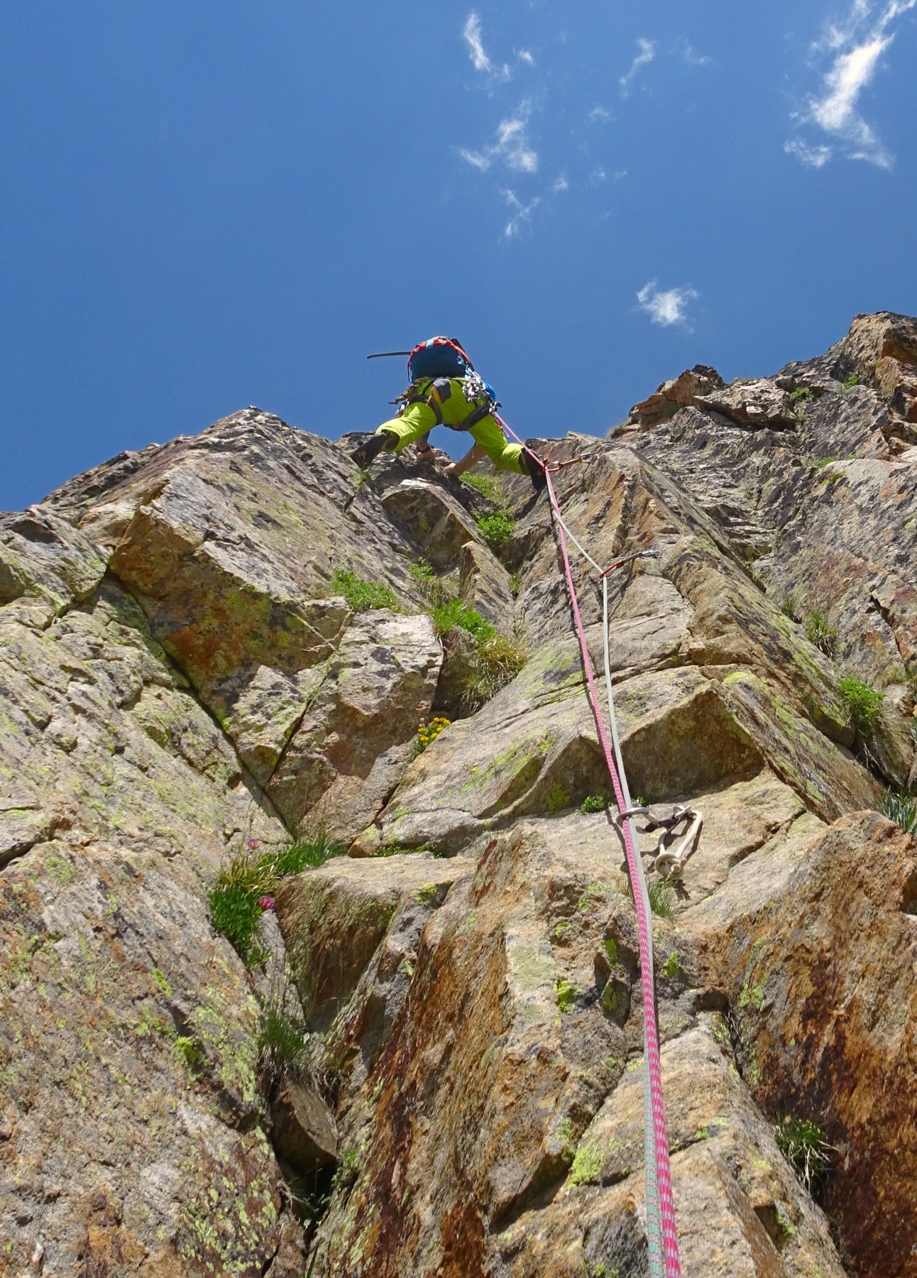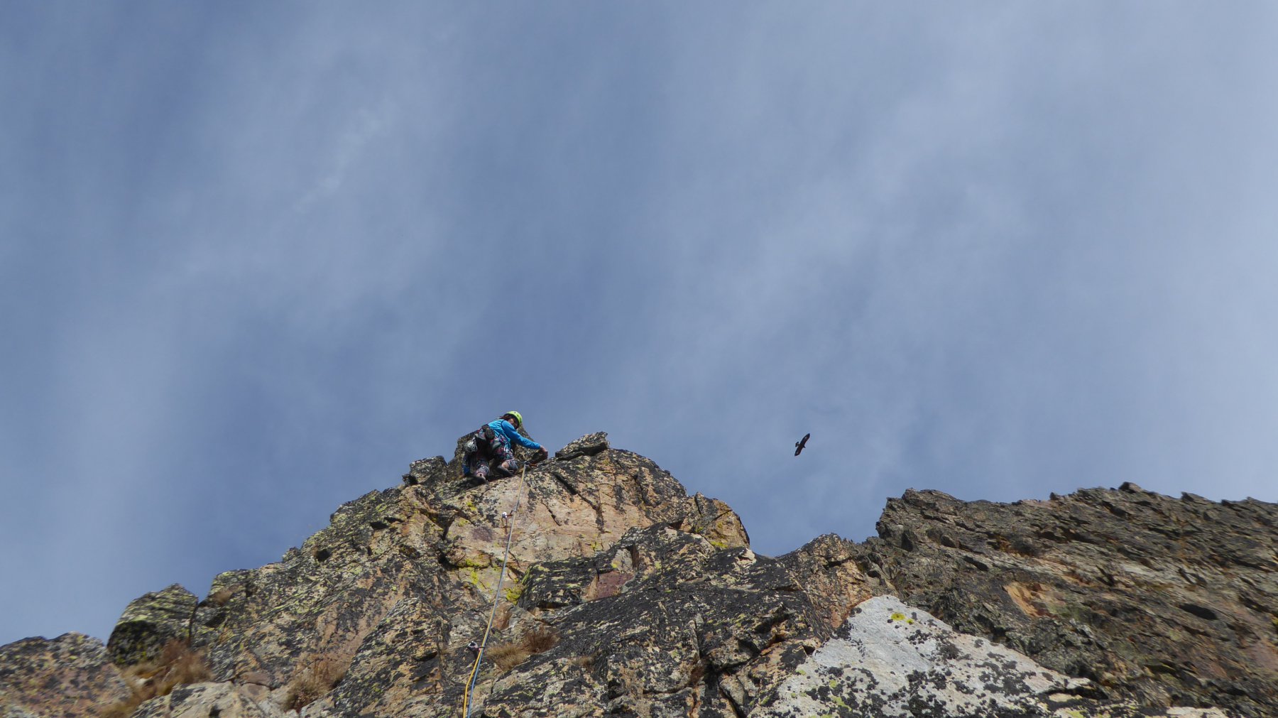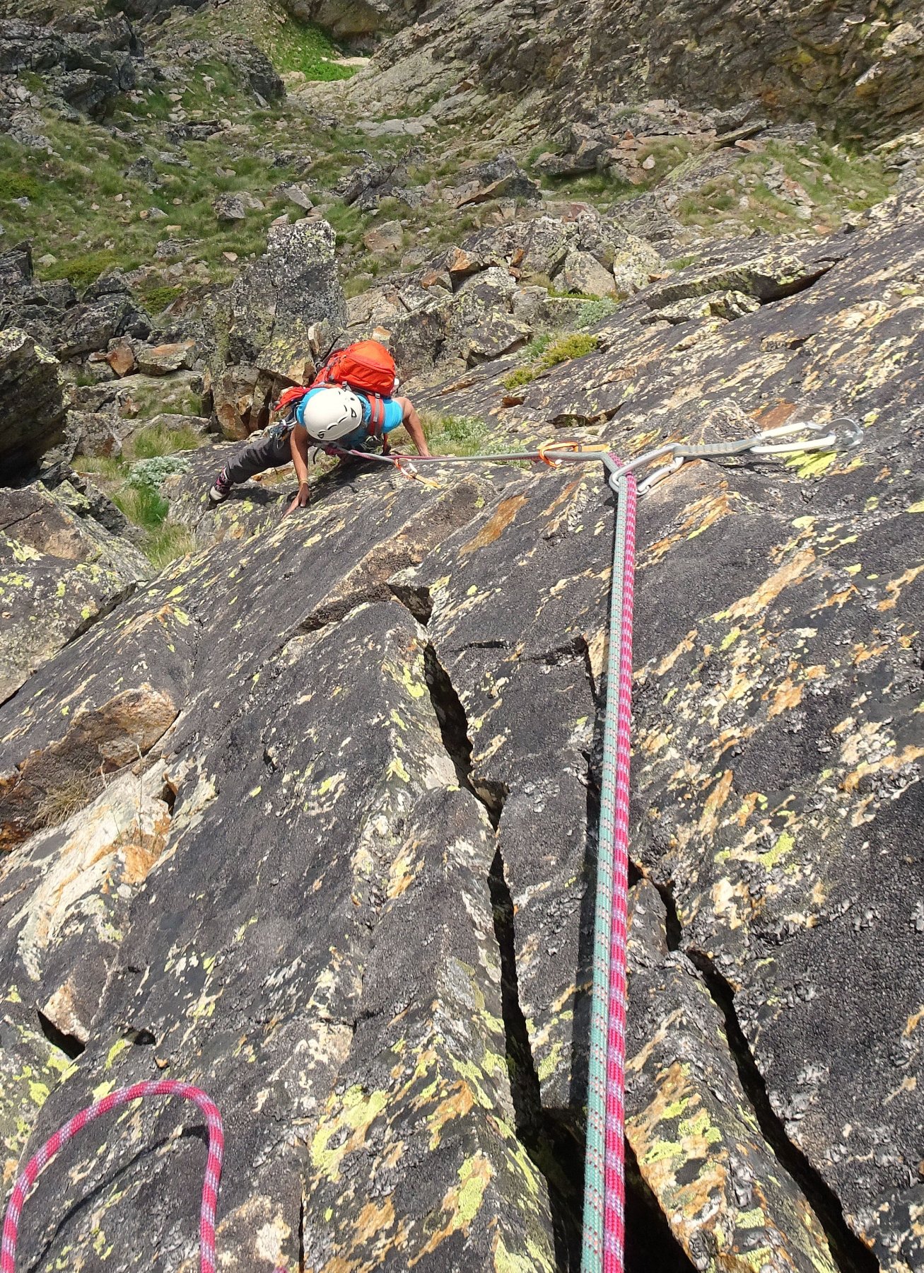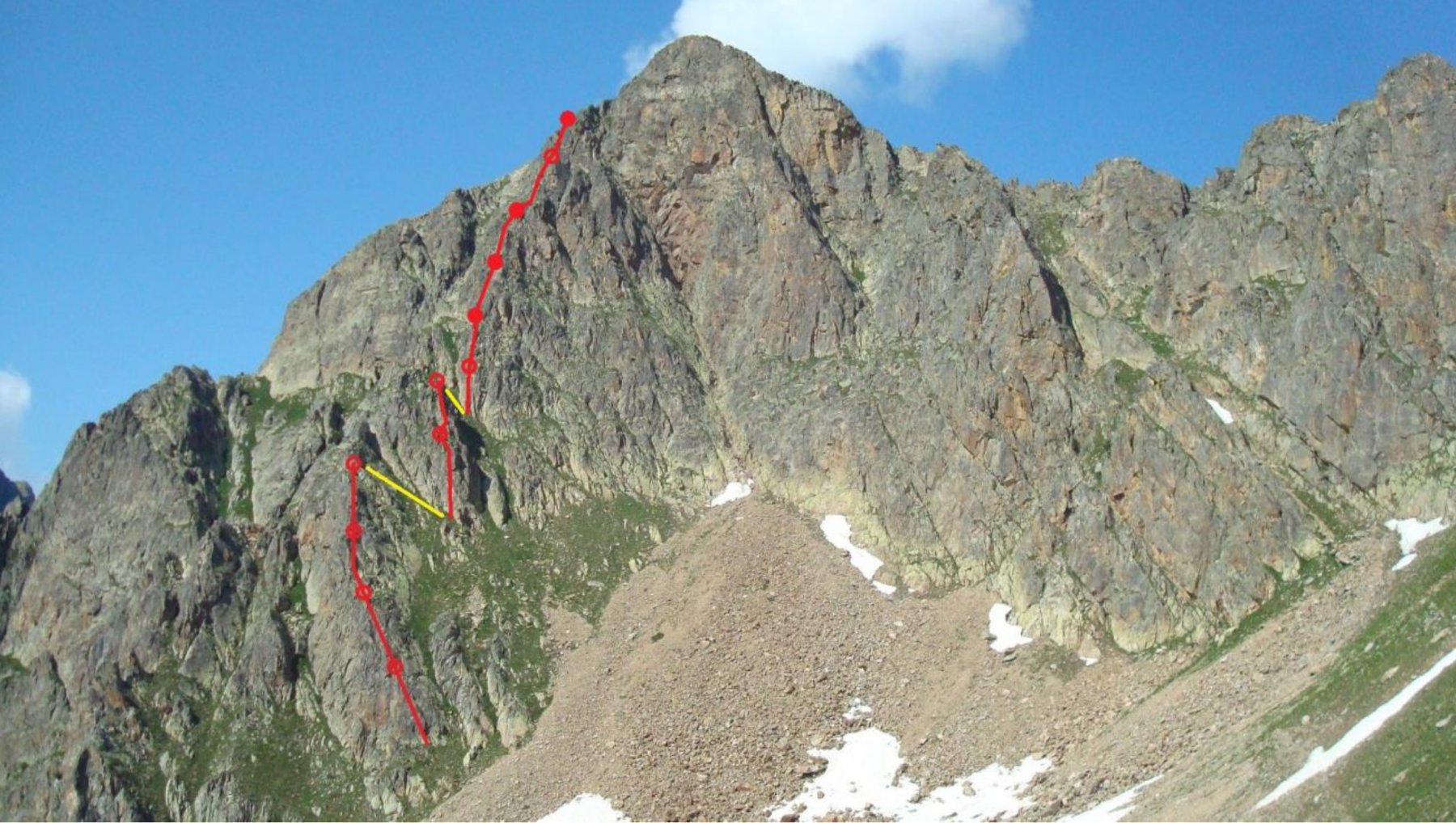 Se dalla fine si prosegue per cresta, non è attrezzato (molti blocchi pericolosi). Dall’ultima sosta uscire a sx poi per prati e roccette si va in punta.