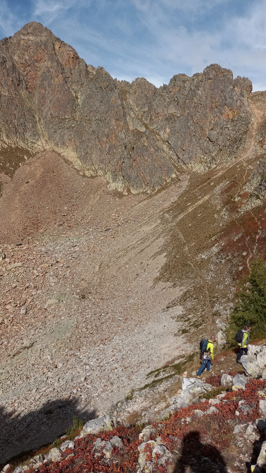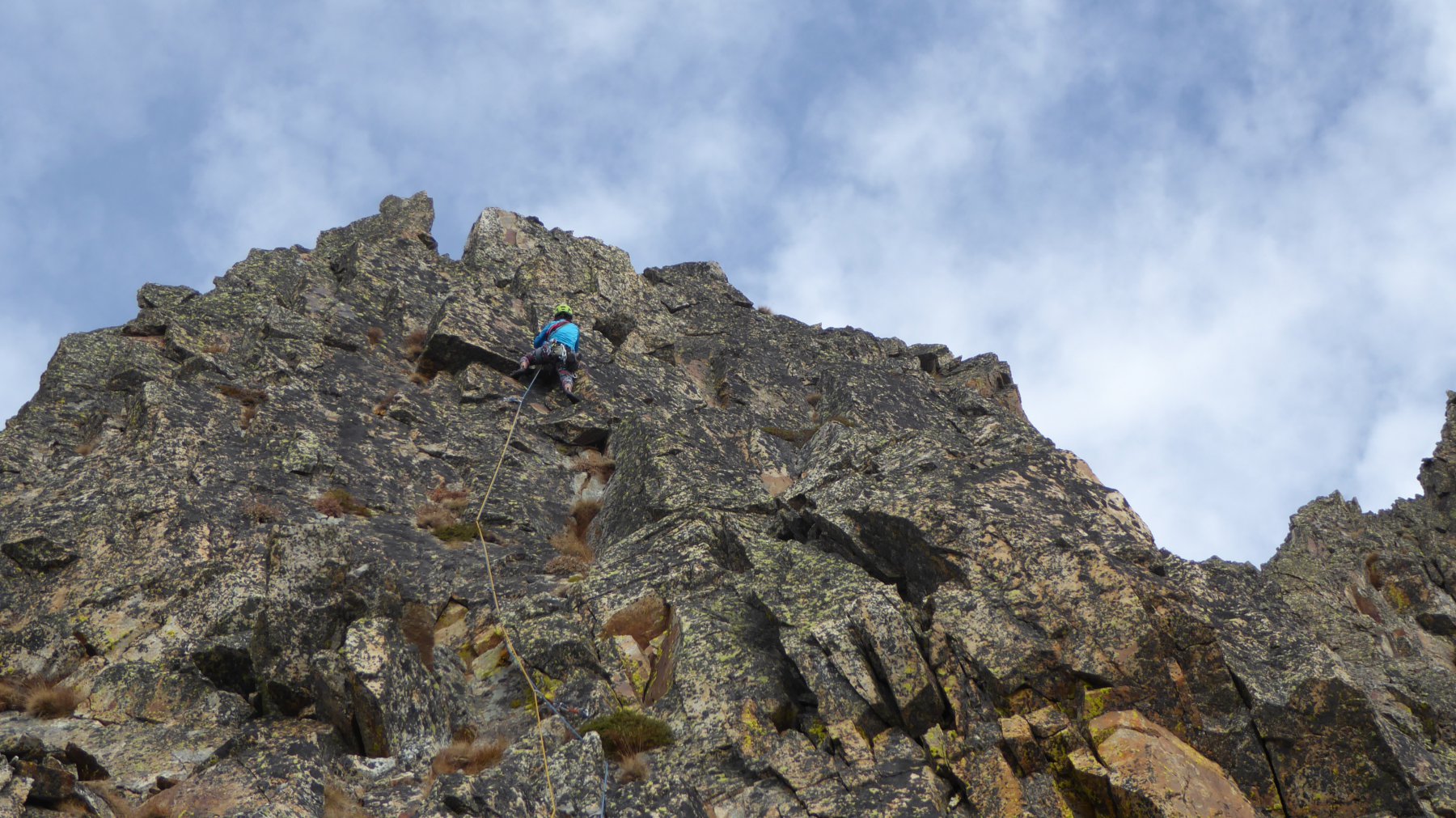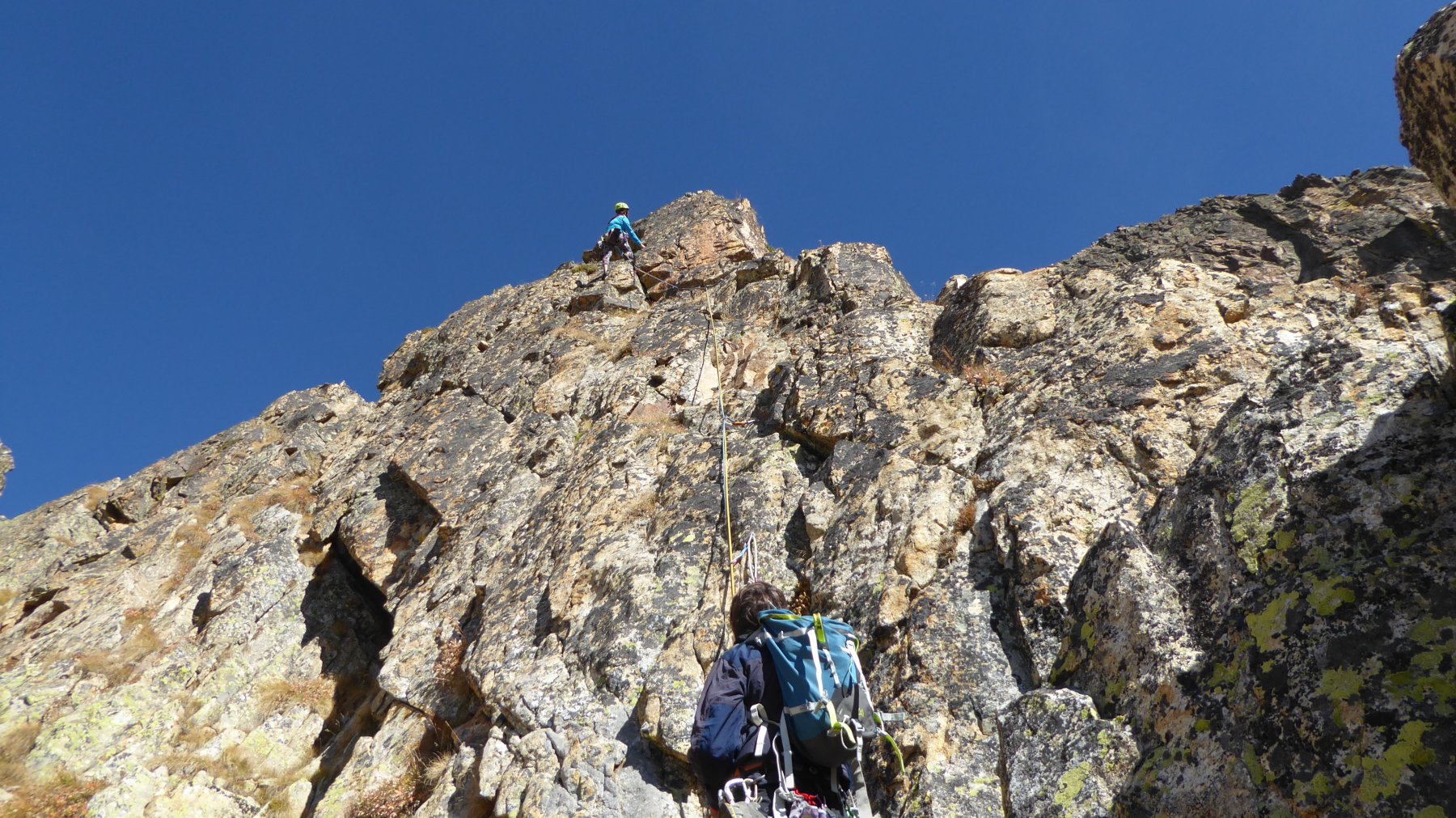Se dalla fine si prosegue per cresta, non è attrezzato (molti blocchi pericolosi). Dall’ultima sosta uscire a sx poi per prati e roccette si va in punta.