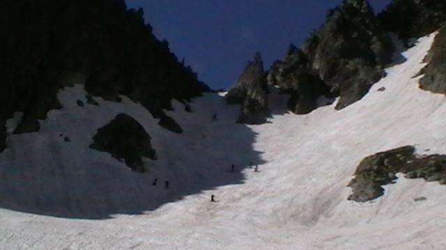 La neve è praticamente estiva, non cambia granchè con il passare delle ore, rimane compatta e sufficientemente scorrevole. Nel canale al mattino neve più dura, utili i coltelli. Tranne un breve tratto scoperto dietro il colletto ci sono ancora millemetri abbondanti sciabili.