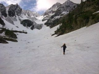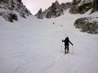 Partiti dall’auto alle 9.30, con sette gradi e meteo bello, anche se le nuvole correvano veloci. Sotto verde acceso, sopra paesaggio patagonico, con tutte le cime imbiancate. Dall’ultimo pianoro in su 10 cm di farina pesante, ma che in discesa ci ha regalato una sciata indimenticabile, dato che oggi è il primo giorno d’estate.. Arrivati solo al colle, anche perchè le rocce per andare in cima erano tutte verglassate e tirava un vento fortissimo. In salita portato gli sci per 20 minuti, mentre scendendo per 10 minuti (90 mt. di dislivello). Forse per mio nonno che faceva scialpinismo nel 1930 era una cosa normale, ma per me è stato un 21 giugno speciale.. Per una settimana non cambia nulla. La neve più bella qui che ieri alla ghigliè, perchè più liscia.