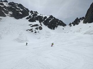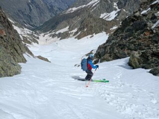 Condizioni super, solo nella prima parte di discesa abbianmo incontrato neve tipo ovatta, per il resto neve primaverile molto bella fino in fondo, anche il canalino è sciabilissimo come non mai, per salire il canalino abbiamo usato i ramponi.
