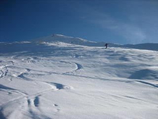 Abbiamo battuto la traccia anche se in parte era ancora visibile quella vecchia, in basso ci sono 15- 20 cm di neve più su aumentano un pò.. A scendere bisogna fare molta attenzione alla prima parte, infatti i primi metri abbiamo preferito farli a piedi.. Poi ci sono alcuni tratti molto belli con 30-40 cm di farina e non si toccano pietre.. Il fondo è di nuovo scarso sotto le grange Chabaud e qualche pietra si tocca…