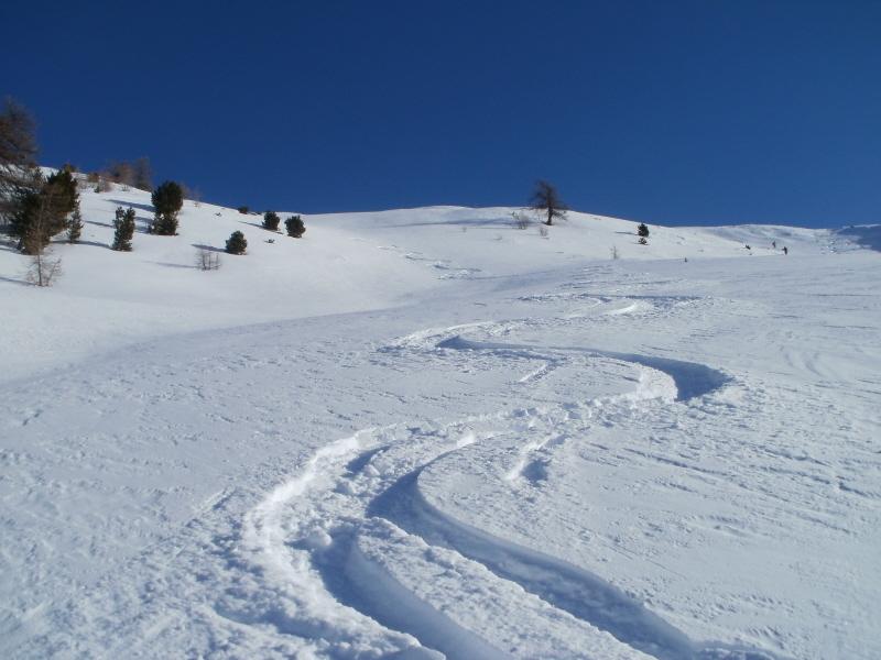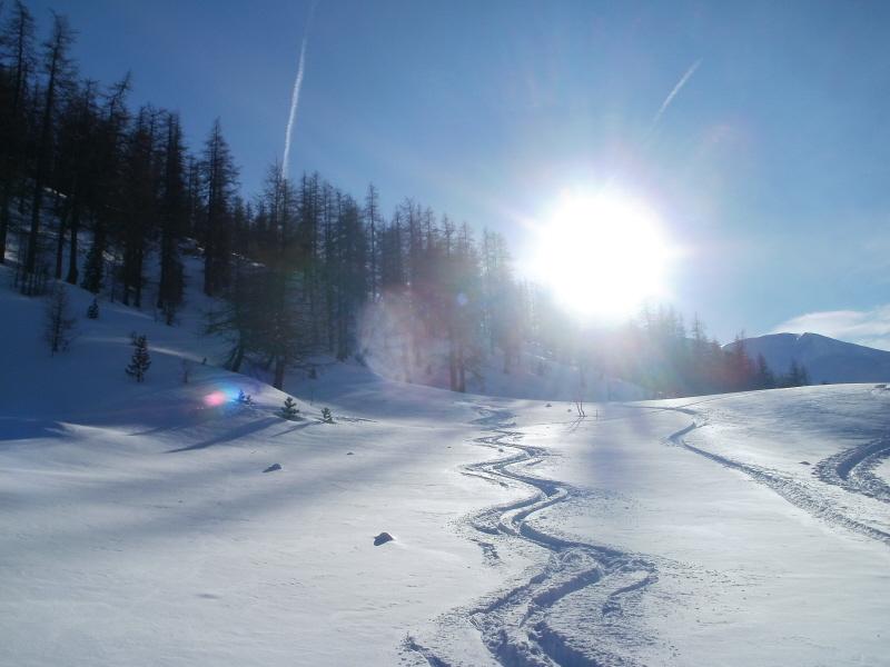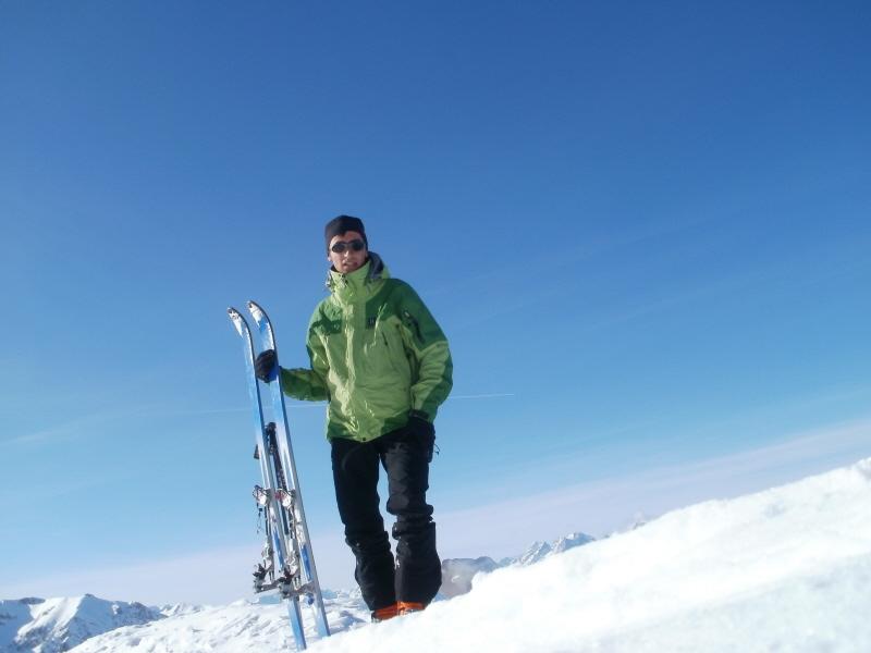Dalle grange Chabaud e fino a poco sotto la vetta la neve è tutta farinosa. In basso si toccano molte pietre, meglio passare dalla stradina che sale a zig-zag, in alto poco sotto la cima è ventata con neve farinosa in alcuni punti. Giornata stupenda, con Eugenio che si è fermato poco sotto la vetta.