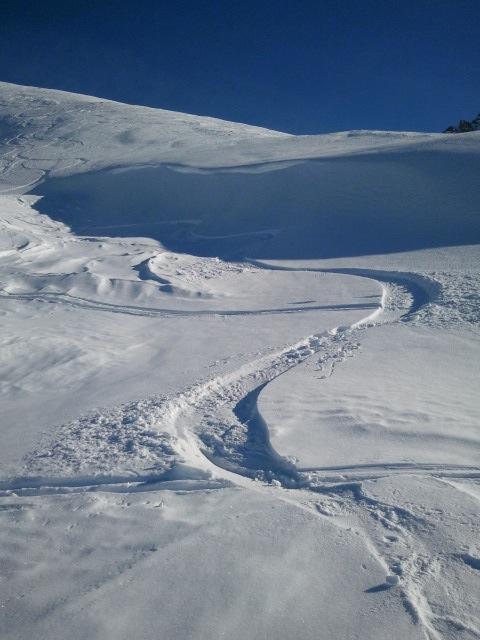 in una giornata di rialzi termici importanti la valle di thures rimane piuttosto riparata e mi regala una discesa spettacolare dalla cima fino alle baite chabaud prima su neve polverosa (mantenendo la sx orografica dalla vetta) poi su farina leggermente appesantita ma sciabilissima e crosticina sottile, dopo le baite è pura sopravvivenza ma ne vale comunque la pena