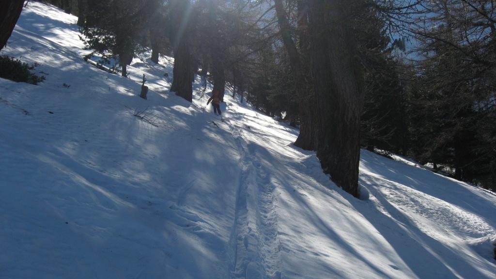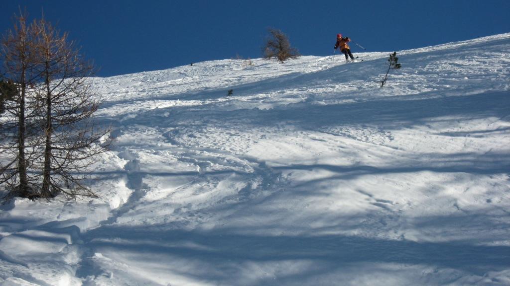 Park. a Thures, alle 9,00 circa -4°,bellissima giornata nitida.Soliti 20 min di stradina gelata sino a Ruilles sia all’andata che ritorno(qualcuno ci arrivava in auto…). Dal ponte bella salita con ottima traccia sino in punta.Il vento di venerdì ha probabilmente spostato un po di neve sin sotto la punta, lasciando pelato solo una decina di metri di vetta.I primi 150 m. di discesa sono su ogni tipo di neve, crosta portante, non portante, ventata, polvere, ecc…! poi pero’….per 500m neve super, polverosa e verso sin. spazi intonsi, poi riportandosi a dx nel bosco ancora bellissima sino a grange Chabod. Da qui e’ praticamente una pista e fra stradina e pendii all’ombra si scia ancora ottimamente. Nel complesso ottima scelta! brava Cri e W&A 4wd.