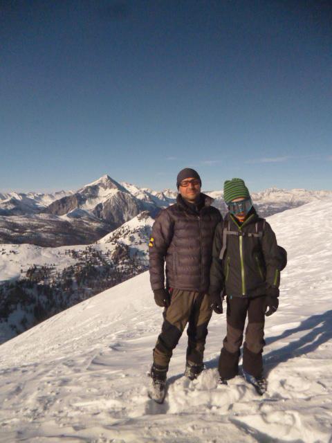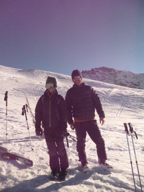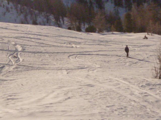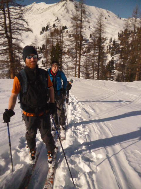 partiti un leggermete tardi; alle 14 mancavano ancora 120 mt alla vetta; considerata l’ora (per noi max 14,30 rientro obbligatorio) e le condizioni della neve decidiamo di fermarci crosta non portante in alto poi buona un pò umida ma fresca e divertente