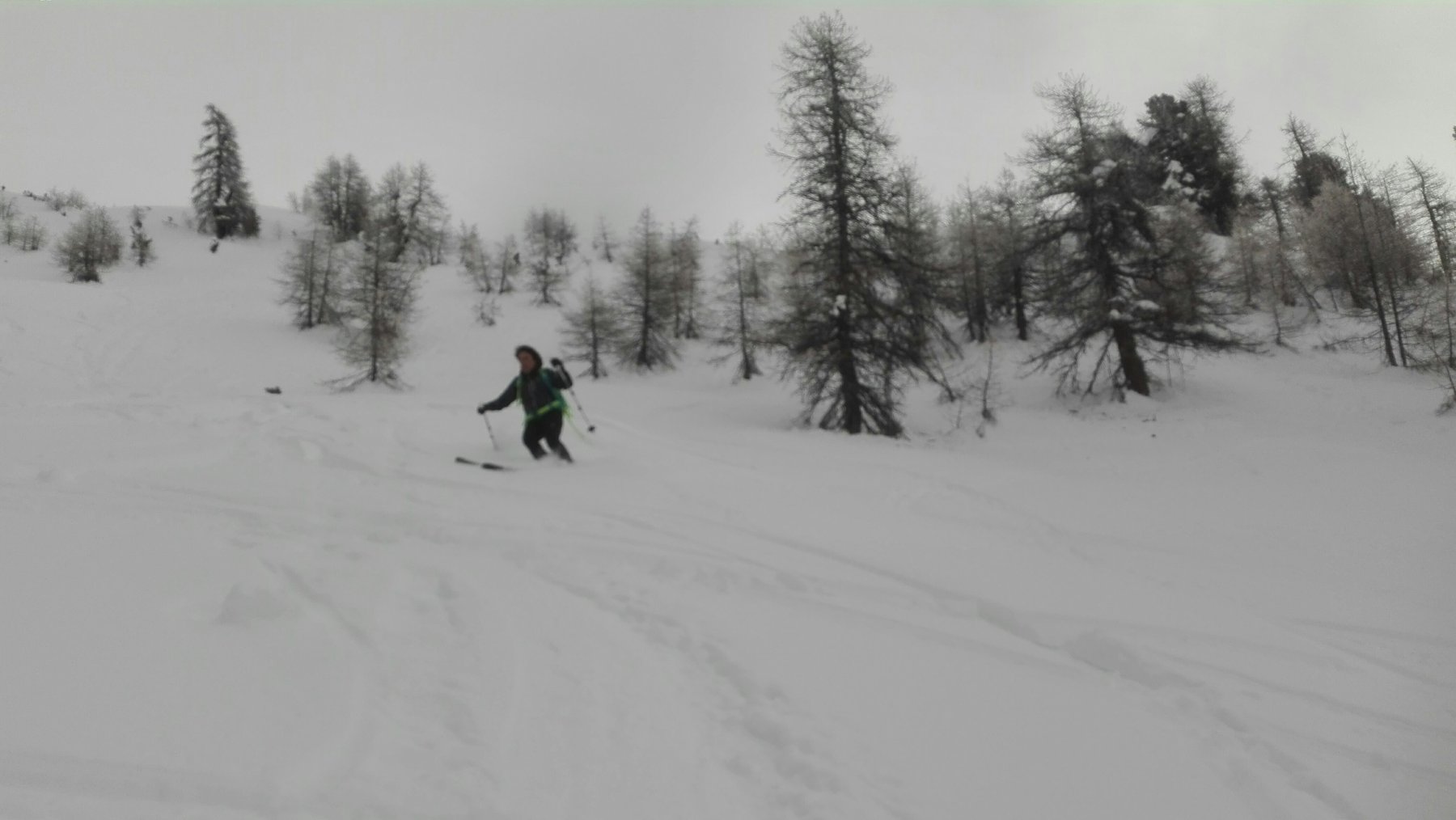 Ottima traccia in salita, in punta residui di nebbia ma scendendo ottima visibilità. Anche noi scesi x circa 200 m sul versante Dorlier su farina super e spazi ancora da ricamare, poi scavalcata la dorsale a sinistra giù per il ripido valloncello su farina un po più umida ma sciabilissima. Parte bassa ottima fra pistone e pendii di trasformata.