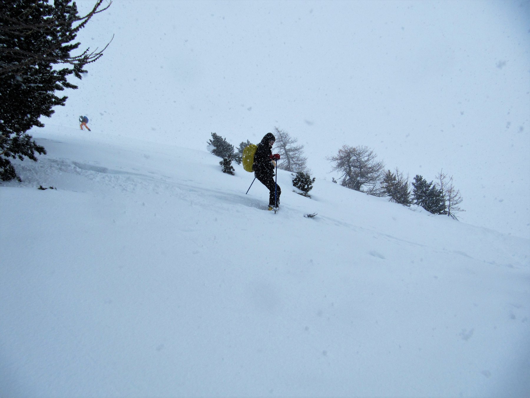 Partiti da Bousson per fare la traversata della Fournier sotto una fine ma fitta nevicata e una quindicina di cm di fresca; arrivati al pianoro dove parte la traccia per il Giassez decidiamo di cambiare il programma causa visibilità pessima verso la Fournier e neve da battere con 40 cm di farina non proprio canadese…., seguiamo allora traccia per il Giassez nel lariceto con nevicata che si intensifica e spessore al suolo oltre i 50 cm con alcune zone di accumulo con lastroni di superficie e spazi vuoti sotto il medesimo o placche ventate ricoperte da neve che partiva sotto gli sci che ci hanno fatto desistere una volta usciti dal bosco di continuare, a nostro avviso la condizione non era del tutto sicura ed inoltre la visibilità peggiorava velocemente. Discesa sotto una nevicata sempre più fitta e umida con neve un po lenta ma con uno spettacolare bosco innevato finalmente nel modo giusto. Stradina di rientro abbastanza scorrevole.