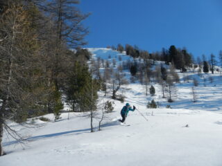 Dalle Grange Chabaud la neve diventa bella e i pendii del monte Giassez presentano neve polverosa su fondo portante, però la discesa dalle Grange Chabaud a Ruilles richiede molta attenzione per evitare danni alle solette.