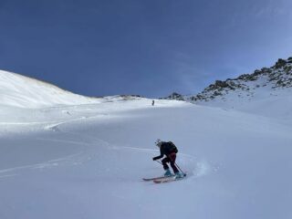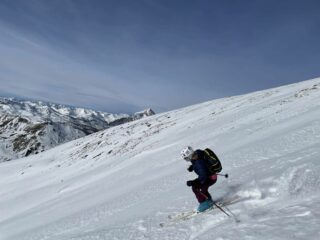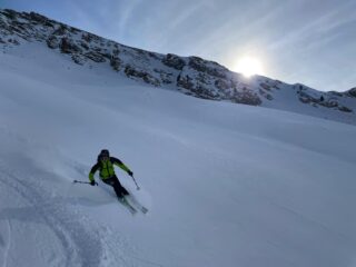 Confidando nel trovare meno tracce anzichè scendere dall’itinerario di salita siamo saliti sulla cima di destra, ancora innevata, per poi scendere nel vallone che separa il Giassez dalla Dorlier. La scelta si è rivelata più che mai corretta perchè dopo pochi metri scalettati nell’erba abbiamo trovato una neve meravigliosa ancora tutta da tracciare! Ci siamo poi ricongiunti con le tracce per la Dormillouse scendendo il boschetto a dx del canale ormai ridotto a pista incredibilmente quasi vergine anch’esso!