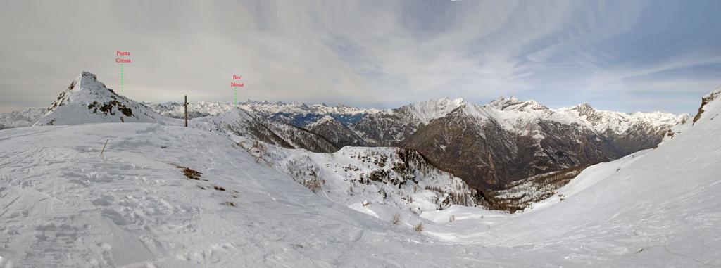 Partenza da S. Margherita, calzato gli sci alla borgata Granges, la strada interpoderale fino alla borgata prima del ponte è pulita. Di lì in poi ottima farina, con un finale leggermente ventata sotto il colle; giornata bella, ma con la perturbazione in arrivo nel pomeriggio. Bella discesa, un pò di portage sulla strada, neve trasformata negli ultimi prati. Un saluto agli Evergreen in formazione ridotta che andavano alla Punta Cressa ed ai due transfughi che invece sono venuti al col Giassit con noi.