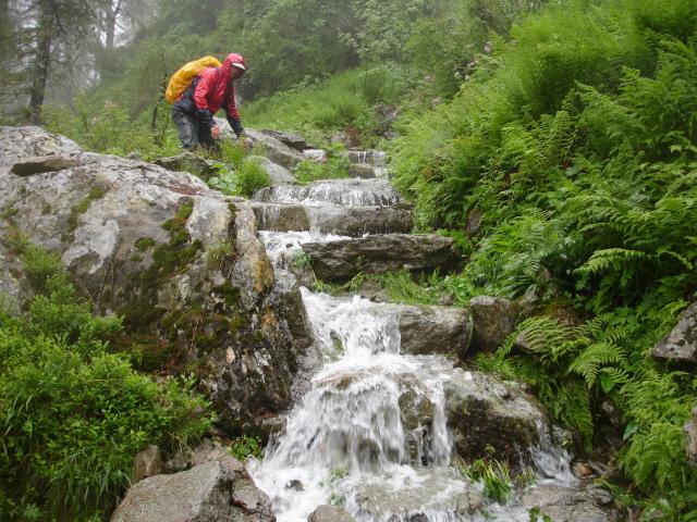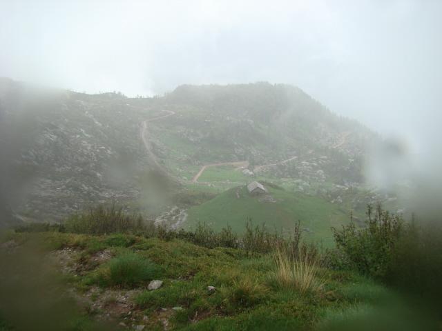 La poderale è lunga poco più di 6km e (a parte l’impatto ambientale) e sicuramente un percorso molto facile per salire alla dorsale del colle Giassit una “T” se non fosse per lo sviluppo. Il sentiero di discesa (AVn.1) è ben evidente e ben segnalato (recente) e non riveste difficoltà oggettive (a parte un po’ di attenzione se come oggi piove copiosamente).