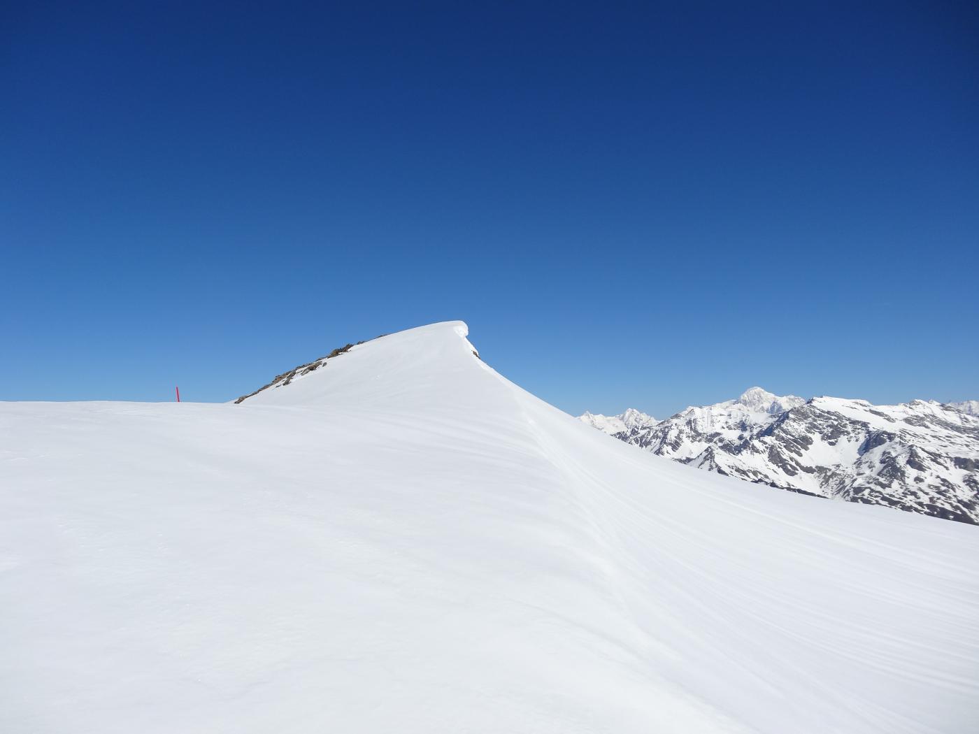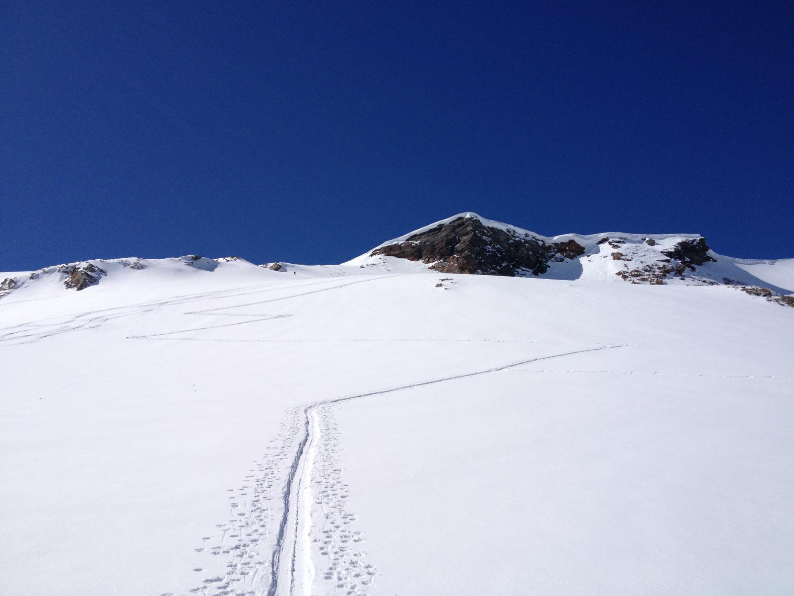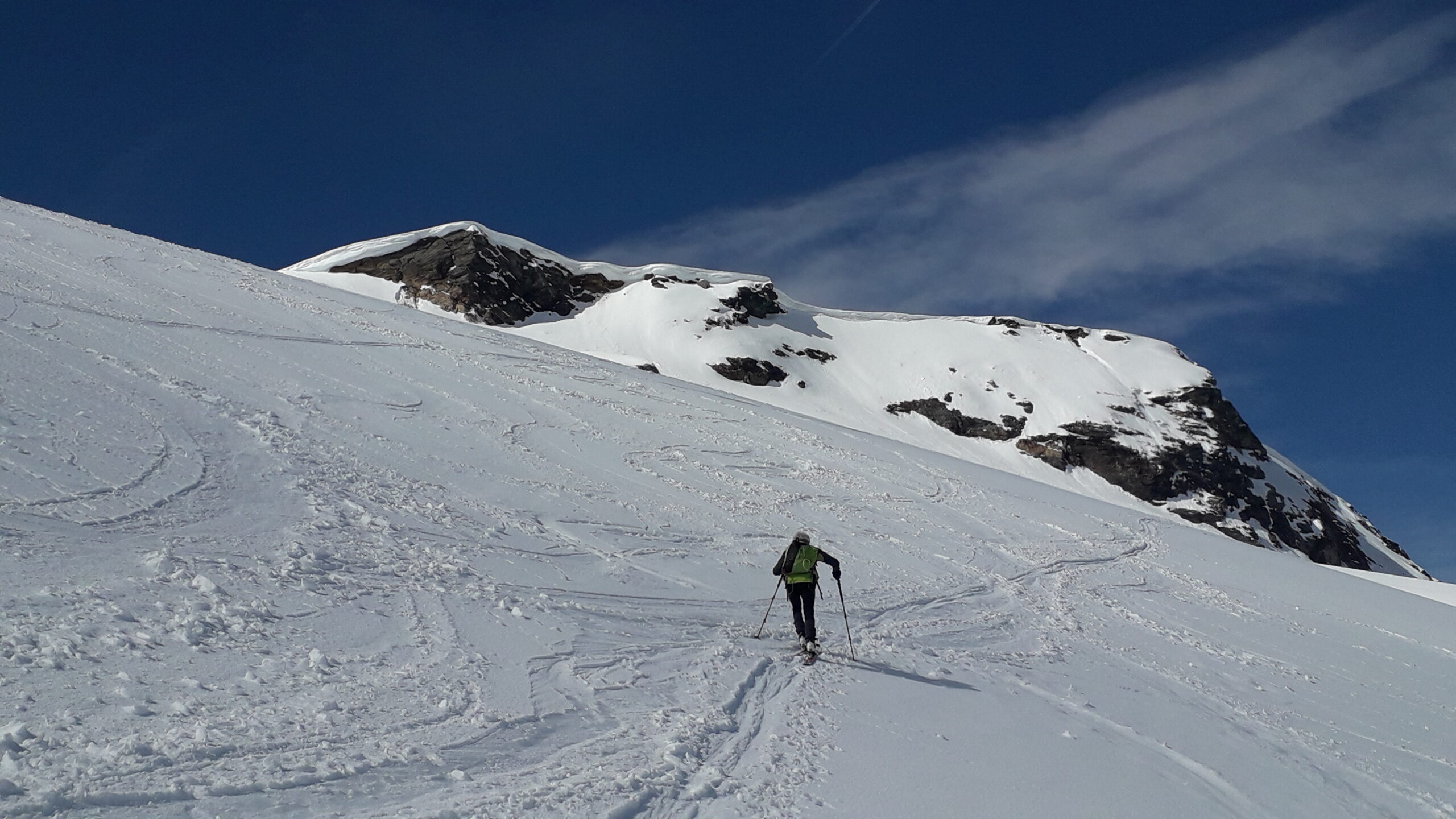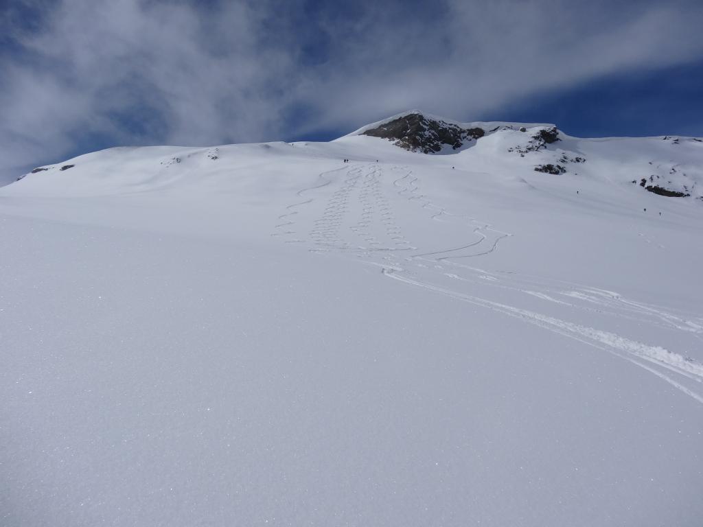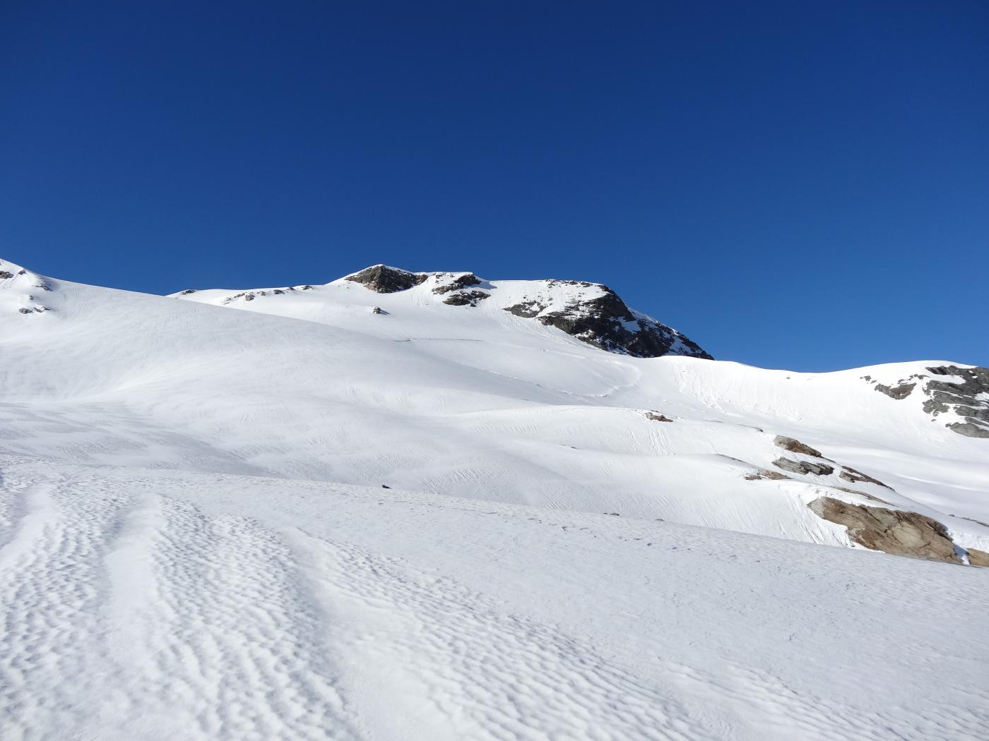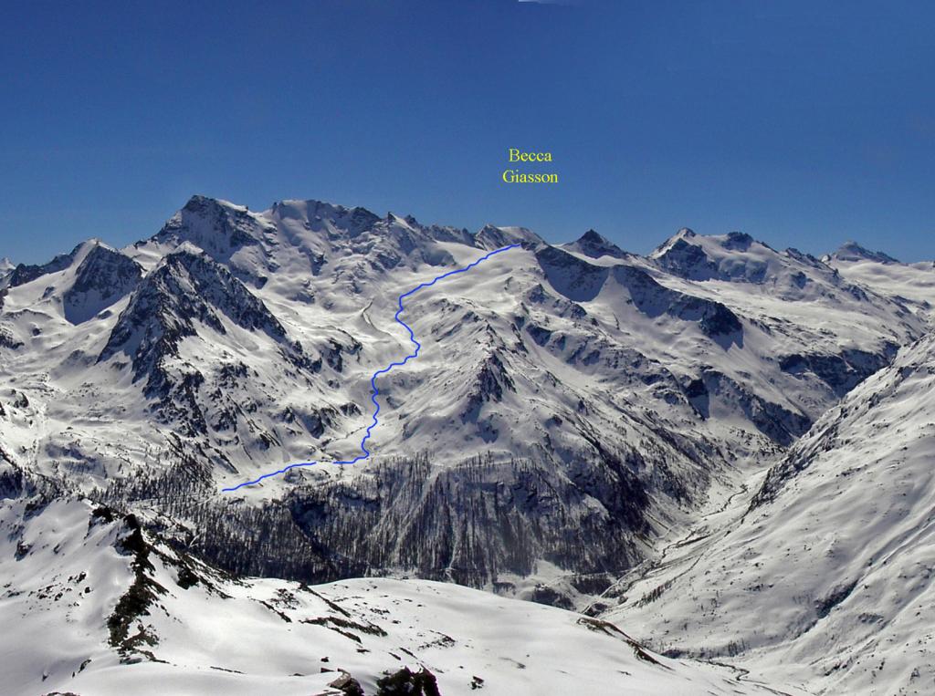 Superati questi dossi ci si sposta comodamente a destra per un ampio pendio, e quindi una nuova risalita più ripida ora verso sinistra conduce al dolce pendio che precede il Colle Giasson. Poco prima del colle ci si sposta a destra, e si prosegue con un traverso un po’ scomodo per giungere alla dorsale a breve distanza dalla cima. In alternativa dal colle è possibile seguire direttamente la dorsale nevosa che è facilmente percorribile fino in cima, contraddistinta da un paletto (attenzione alle cornici sul versante del vallone di salita).