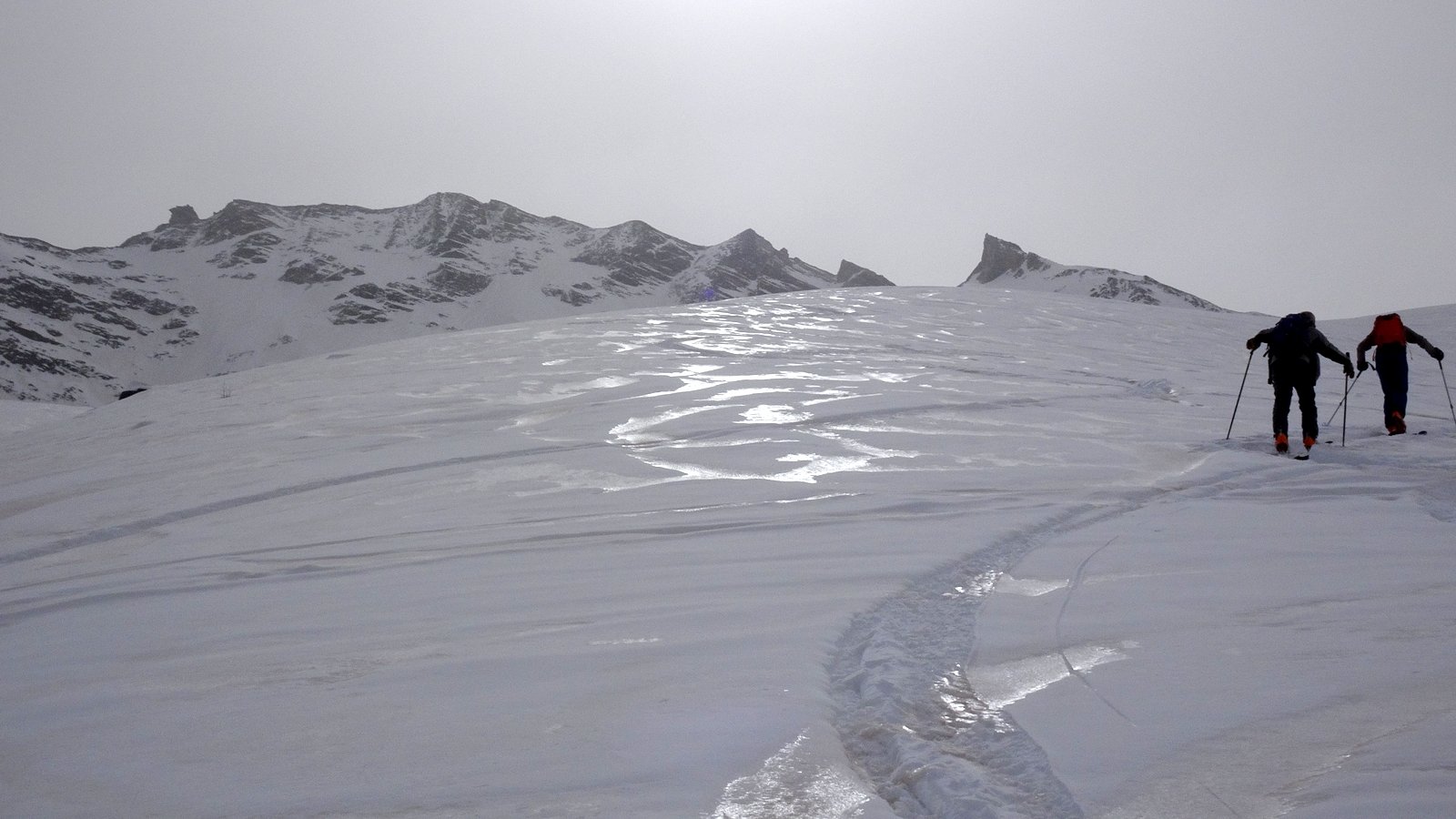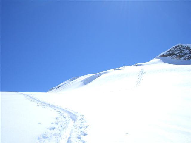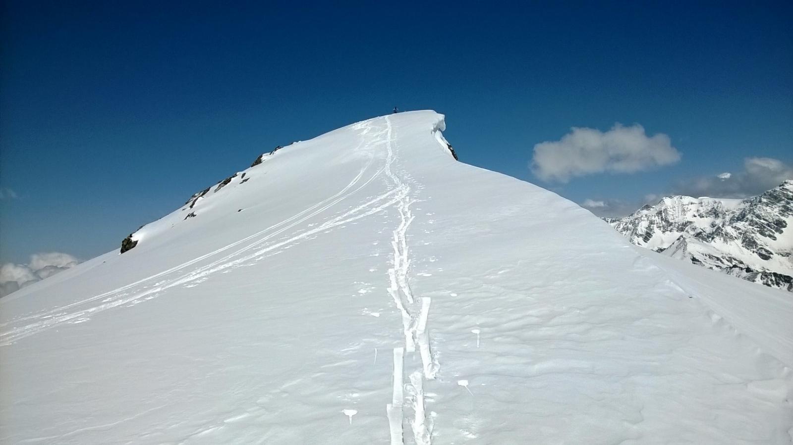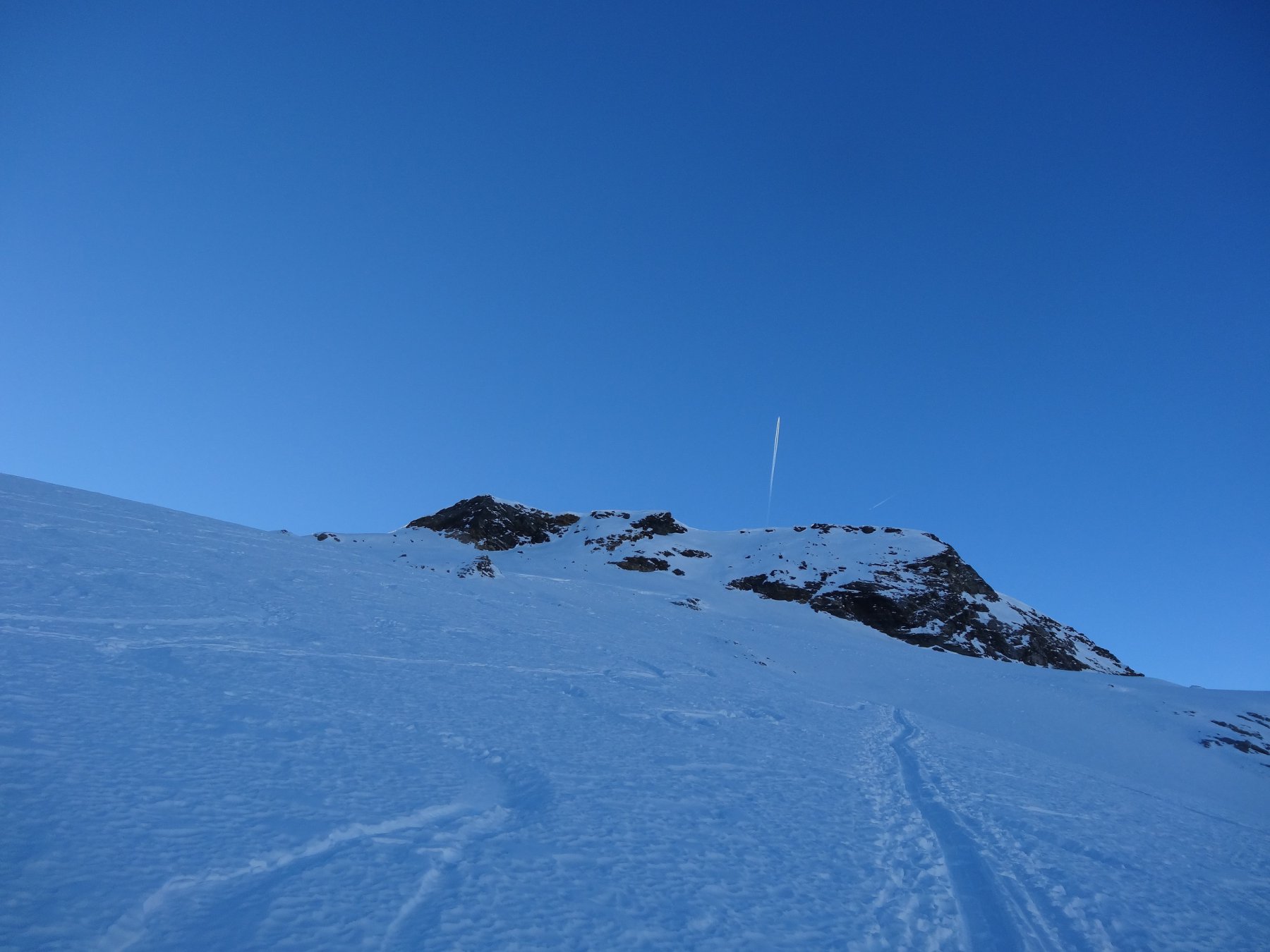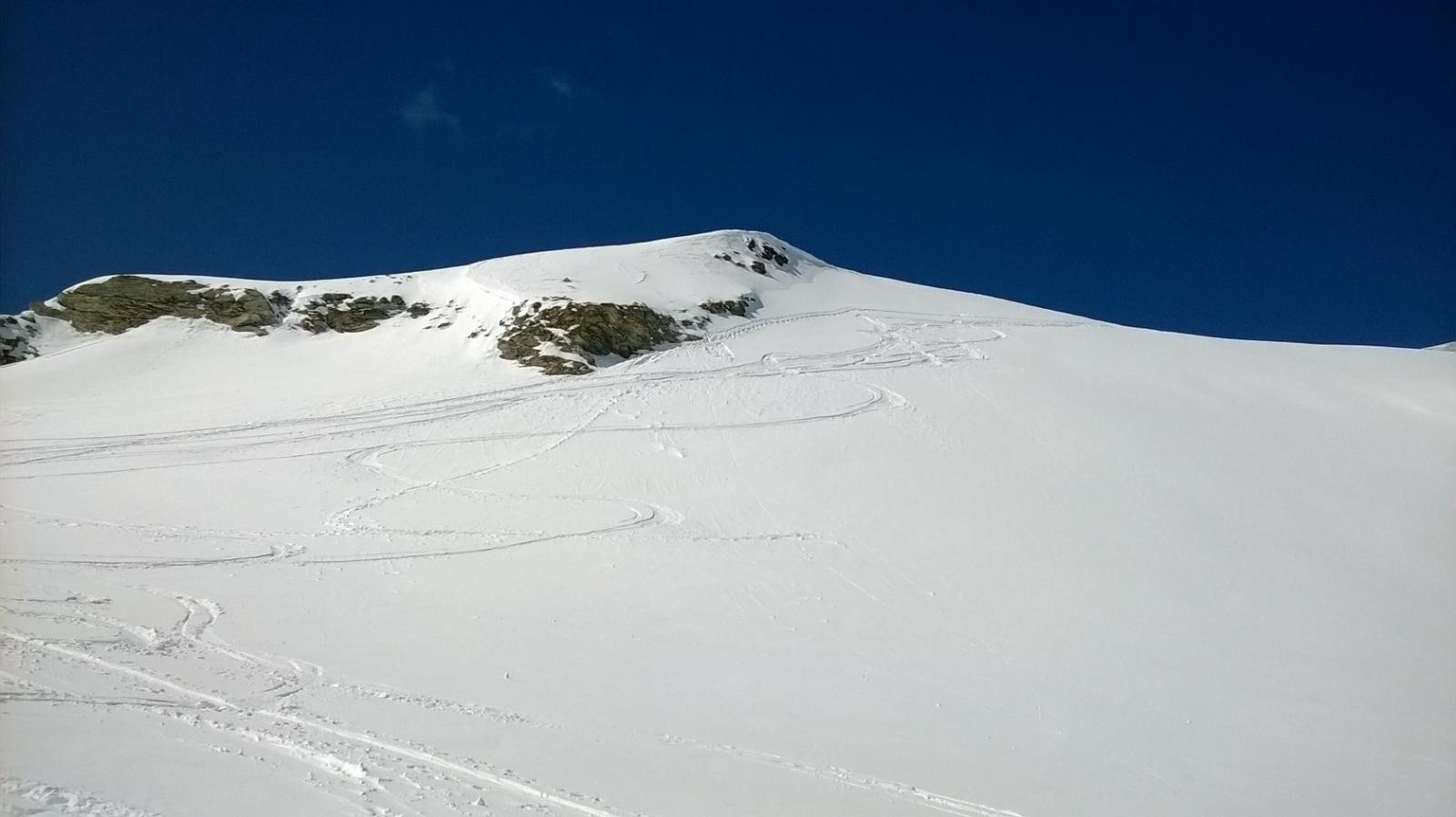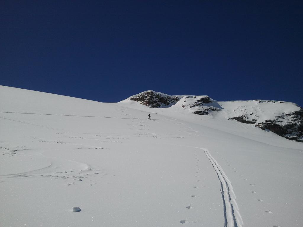 Superati questi dossi ci si sposta comodamente a destra per un ampio pendio, e quindi una nuova risalita più ripida ora verso sinistra conduce al dolce pendio che precede il Colle Giasson. Poco prima del colle ci si sposta a destra, e si prosegue con un traverso un po’ scomodo per giungere alla dorsale a breve distanza dalla cima. In alternativa dal colle è possibile seguire direttamente la dorsale nevosa che è facilmente percorribile fino in cima, contraddistinta da un paletto (attenzione alle cornici sul versante del vallone di salita).
