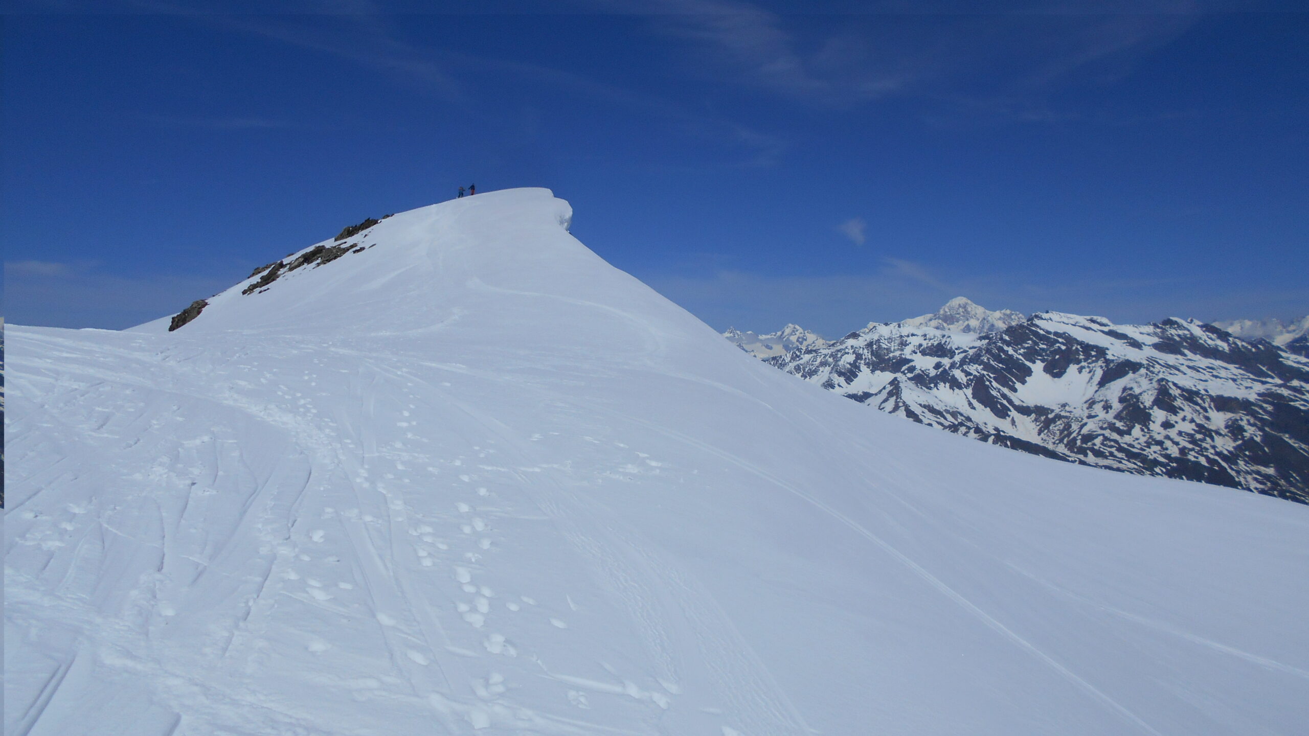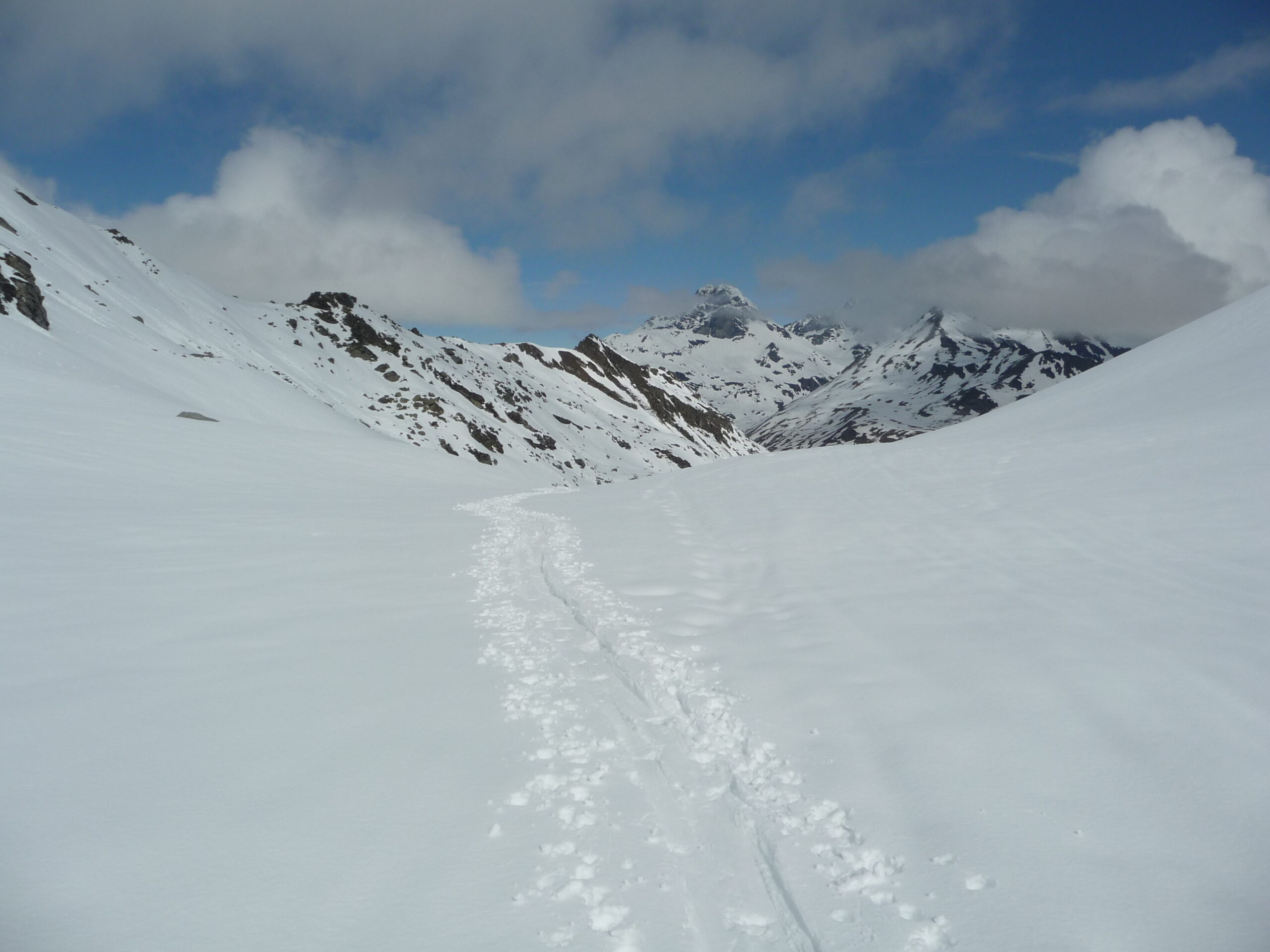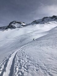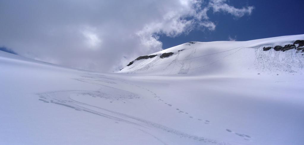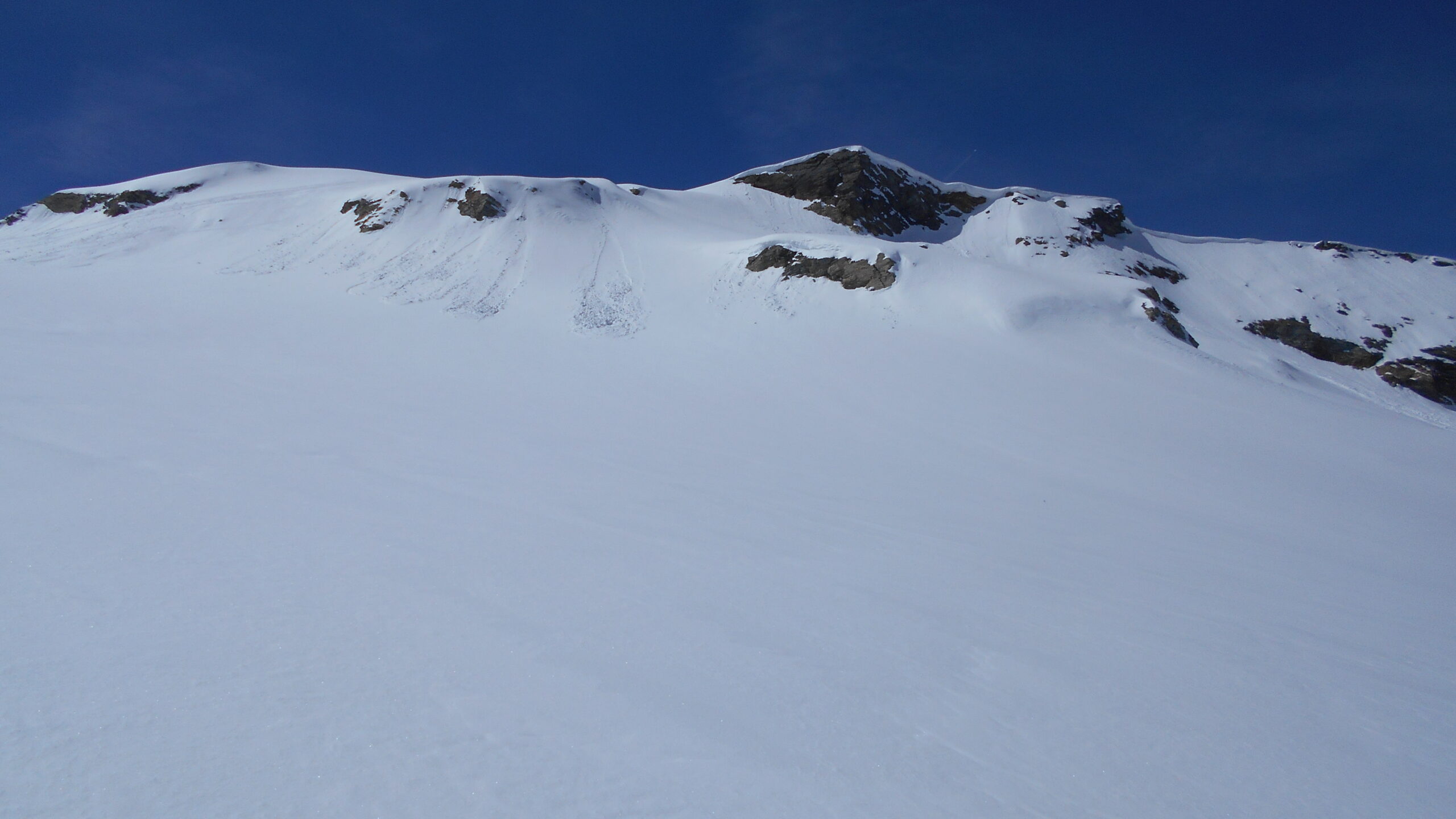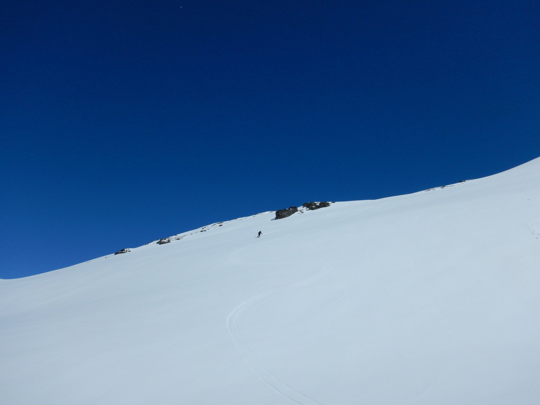 Superati questi dossi ci si sposta comodamente a destra per un ampio pendio, e quindi una nuova risalita più ripida ora verso sinistra conduce al dolce pendio che precede il Colle Giasson. Poco prima del colle ci si sposta a destra, e si prosegue con un traverso un po’ scomodo per giungere alla dorsale a breve distanza dalla cima. In alternativa dal colle è possibile seguire direttamente la dorsale nevosa che è facilmente percorribile fino in cima, contraddistinta da un paletto (attenzione alle cornici sul versante del vallone di salita).
