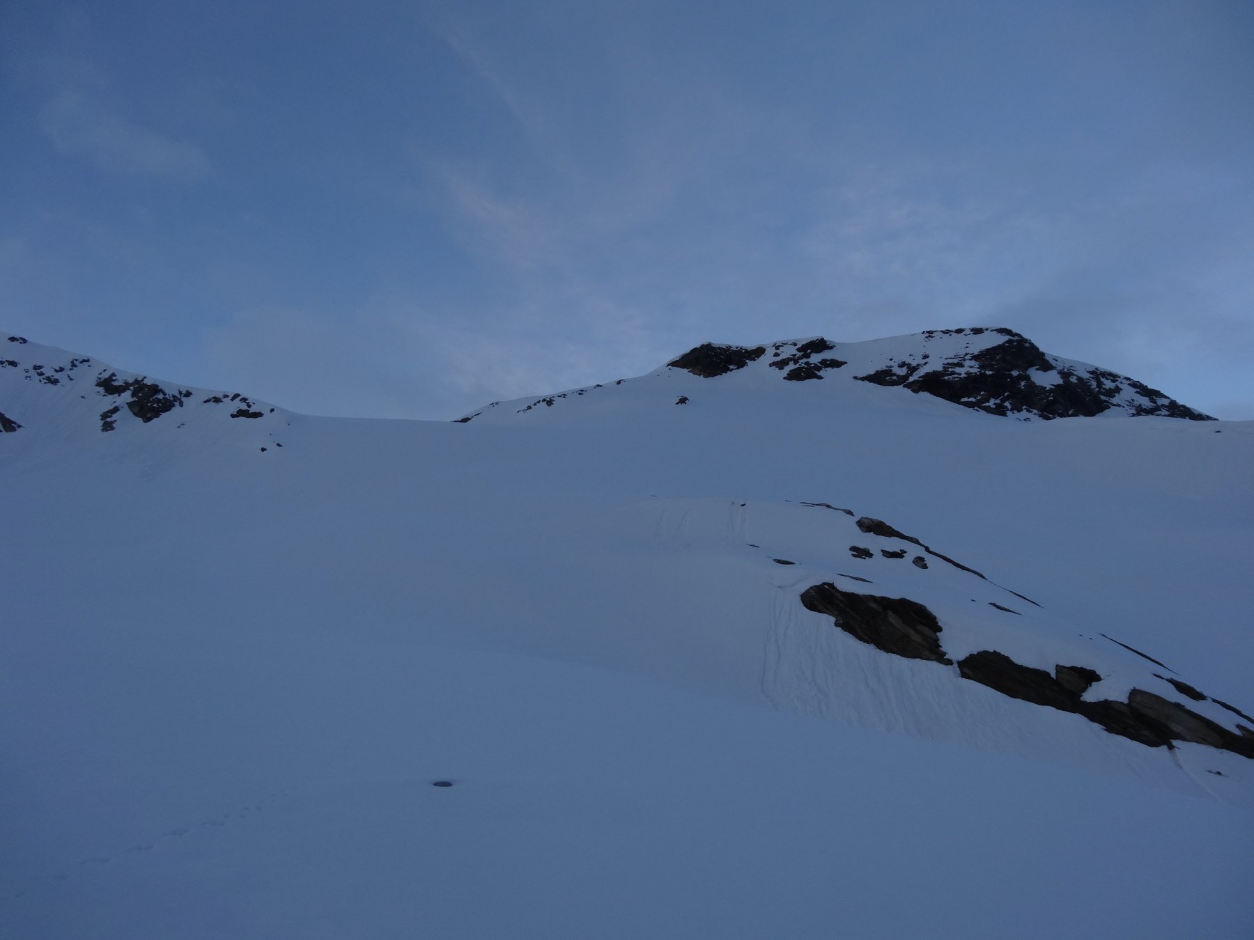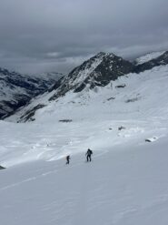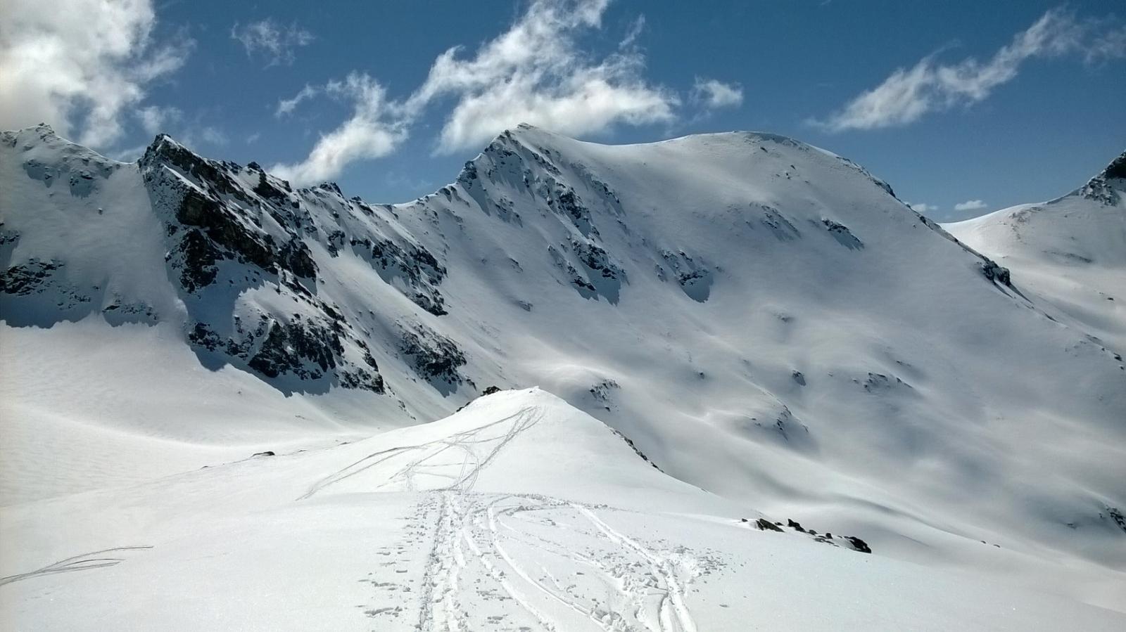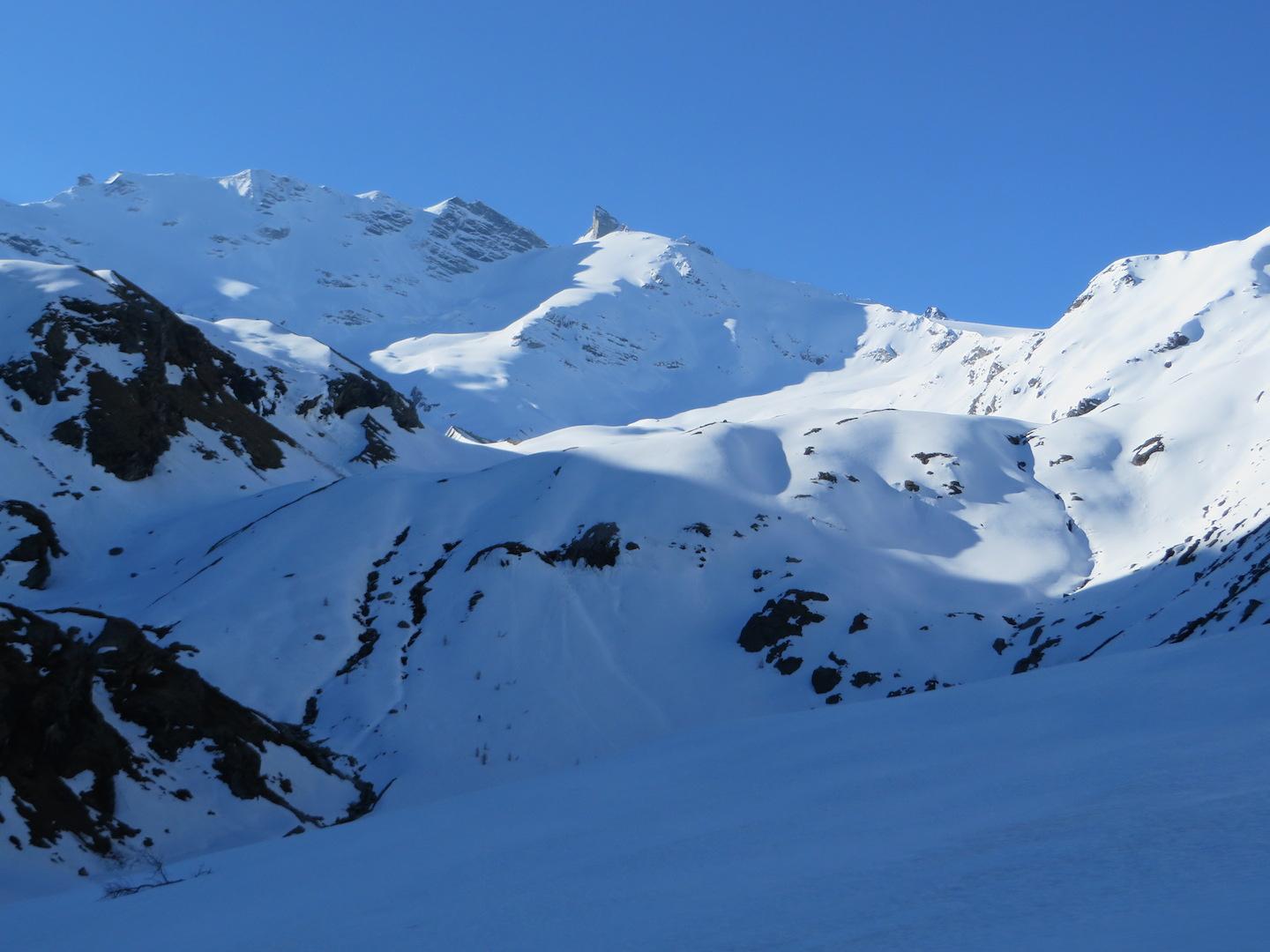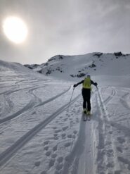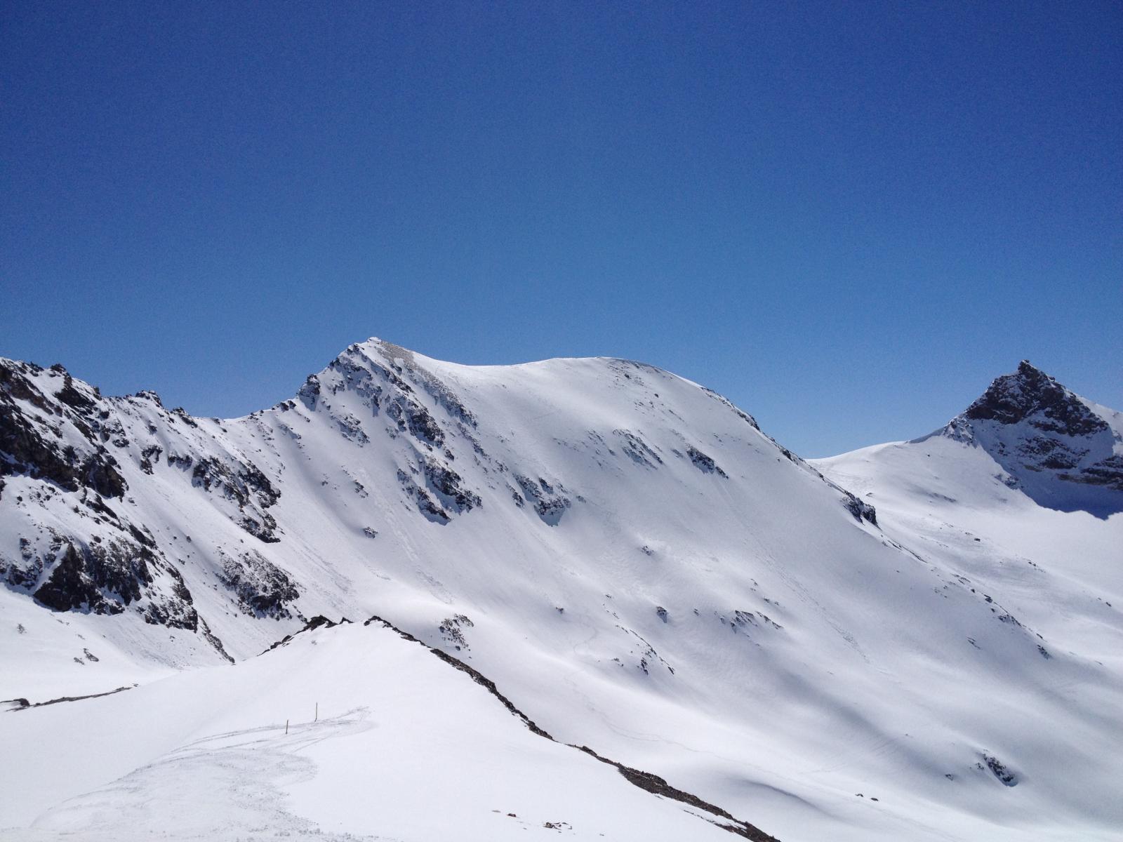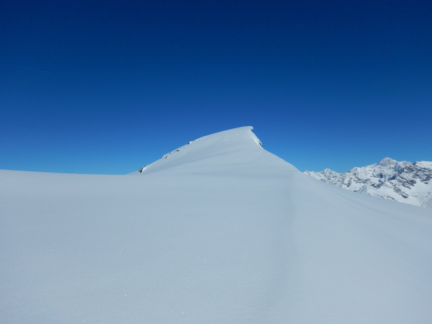Superati questi dossi ci si sposta comodamente a destra per un ampio pendio, e quindi una nuova risalita più ripida ora verso sinistra conduce al dolce pendio che precede il Colle Giasson. Poco prima del colle ci si sposta a destra, e si prosegue con un traverso un po’ scomodo per giungere alla dorsale a breve distanza dalla cima. In alternativa dal colle è possibile seguire direttamente la dorsale nevosa che è facilmente percorribile fino in cima, contraddistinta da un paletto (attenzione alle cornici sul versante del vallone di salita).