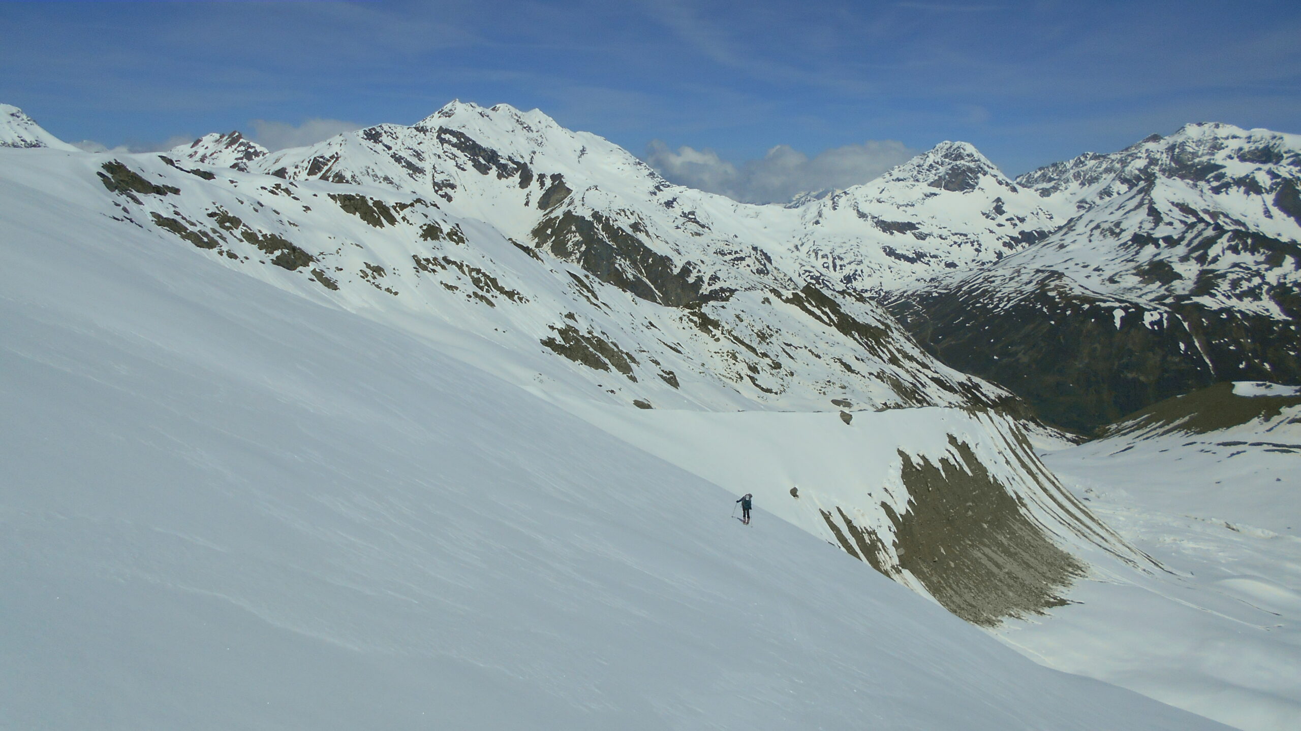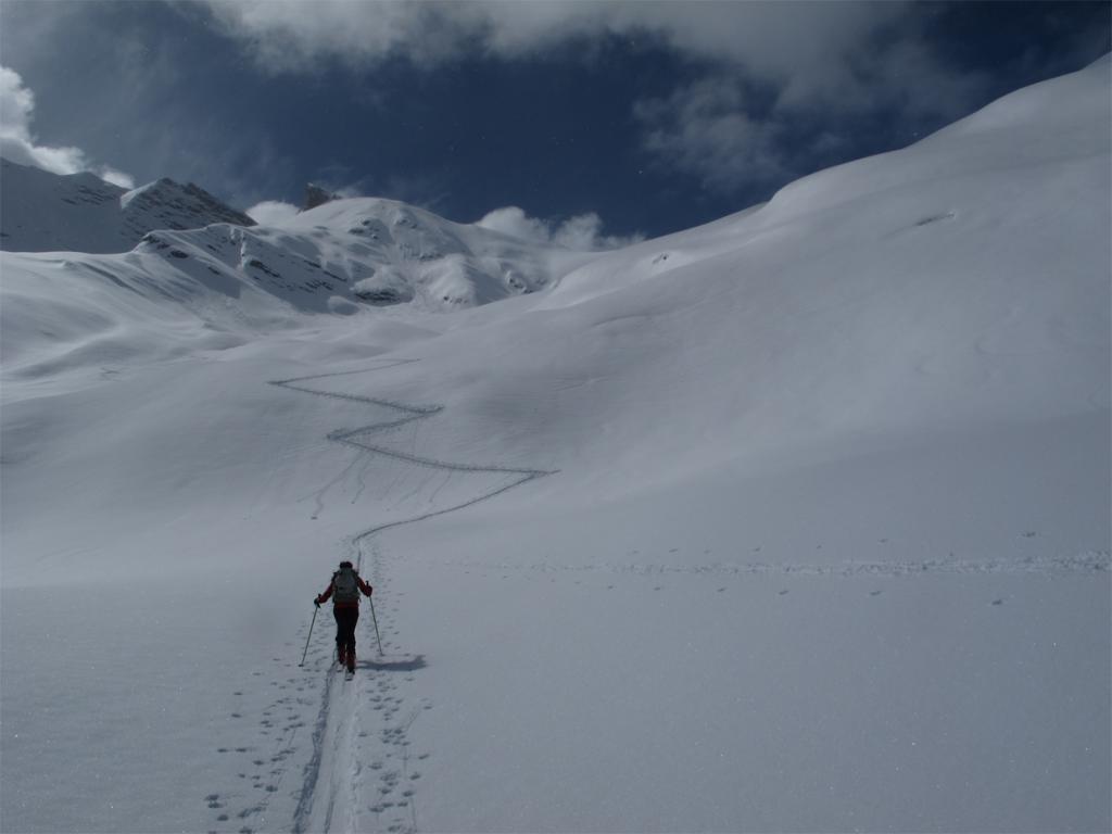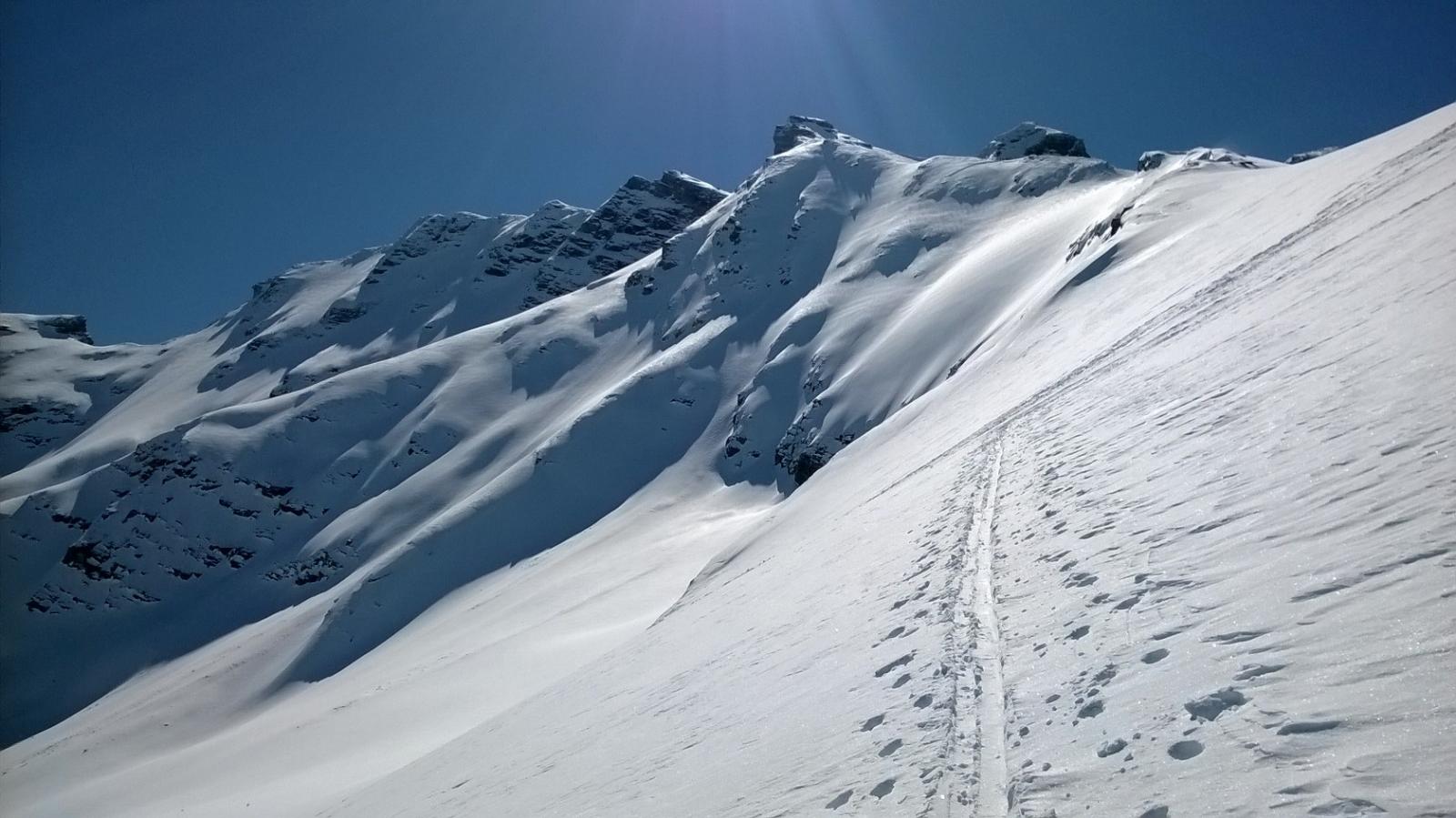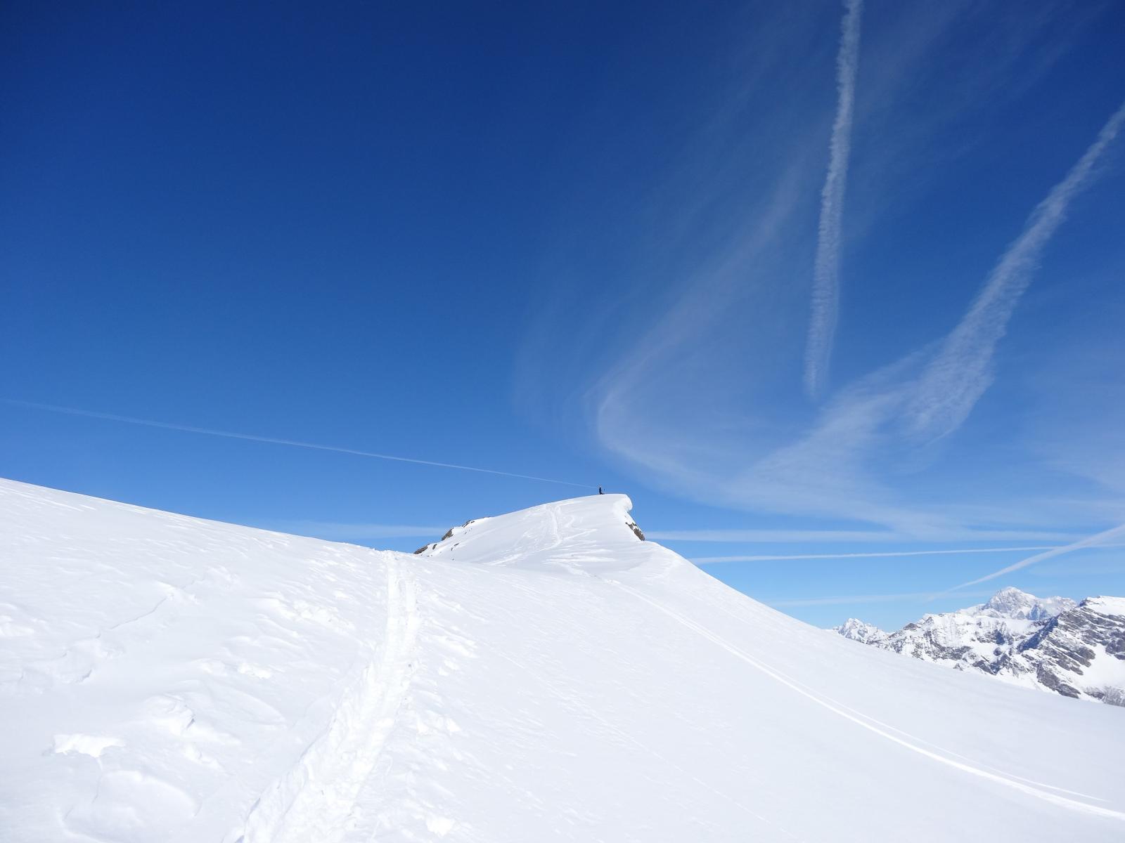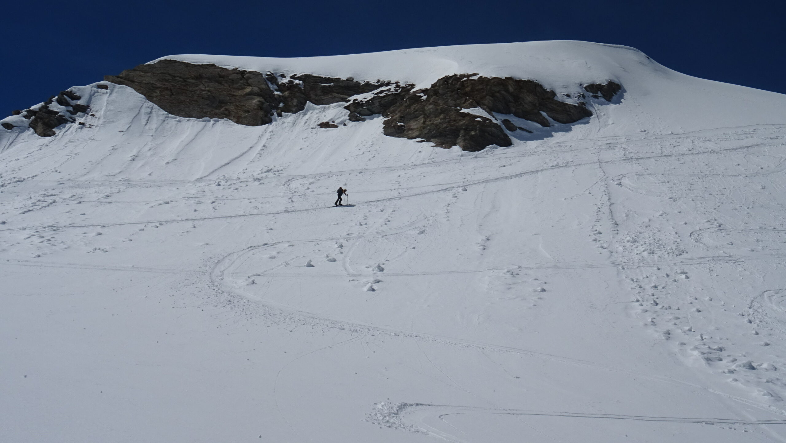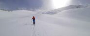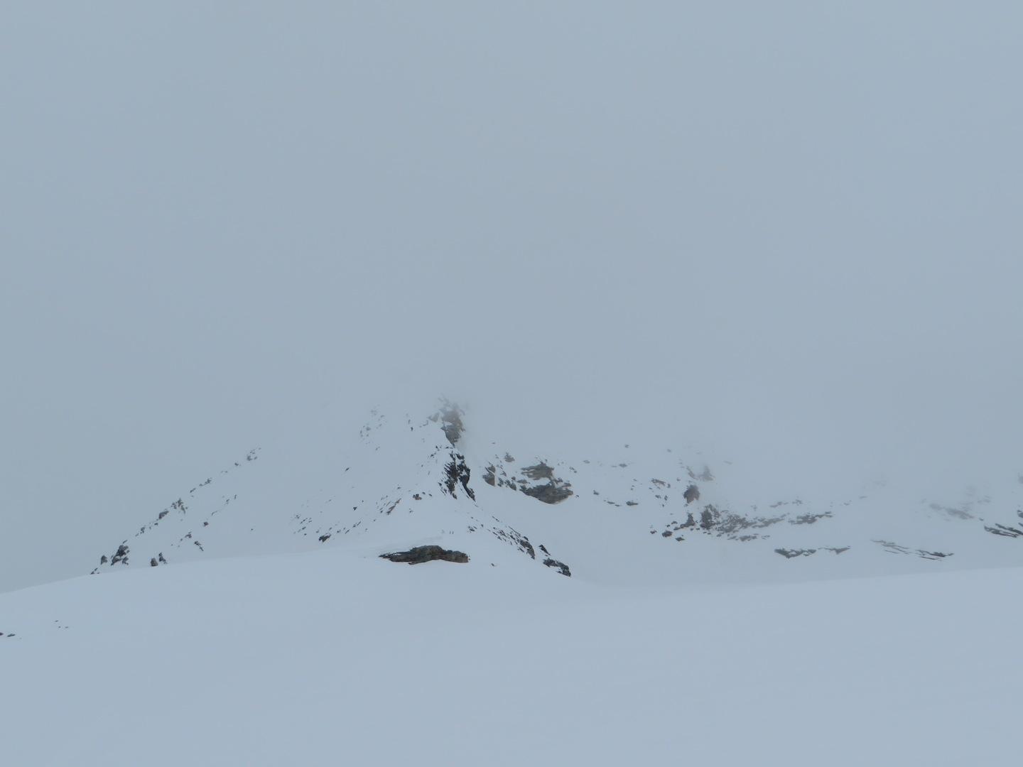 Superati questi dossi ci si sposta comodamente a destra per un ampio pendio, e quindi una nuova risalita più ripida ora verso sinistra conduce al dolce pendio che precede il Colle Giasson. Poco prima del colle ci si sposta a destra, e si prosegue con un traverso un po’ scomodo per giungere alla dorsale a breve distanza dalla cima. In alternativa dal colle è possibile seguire direttamente la dorsale nevosa che è facilmente percorribile fino in cima, contraddistinta da un paletto (attenzione alle cornici sul versante del vallone di salita).