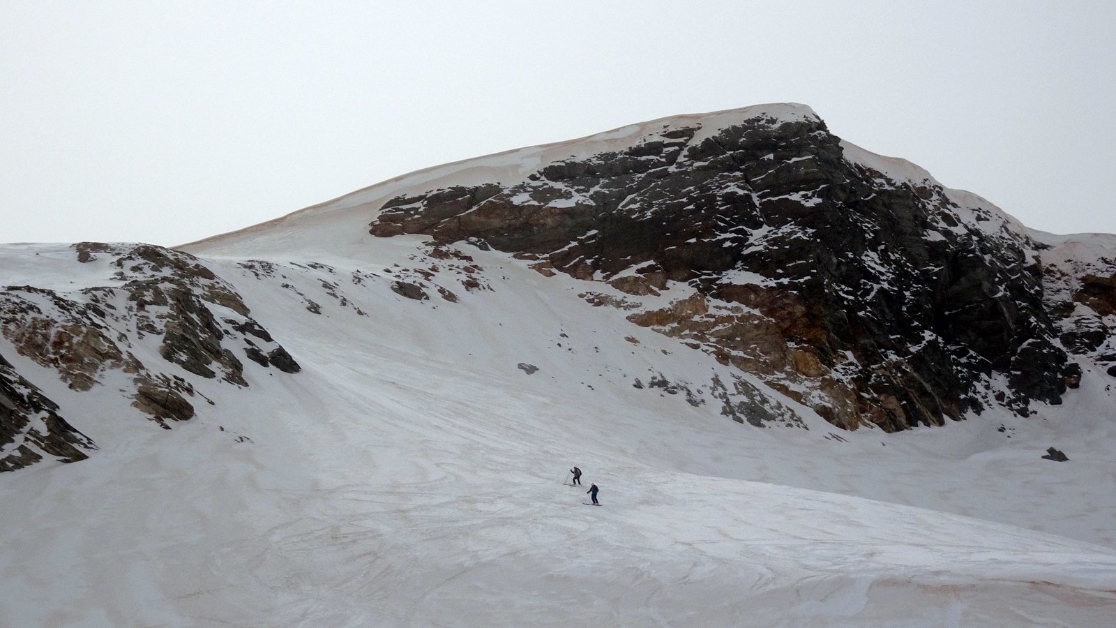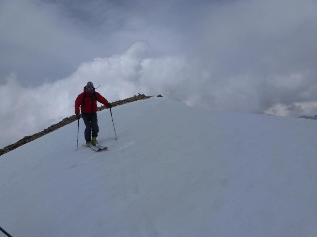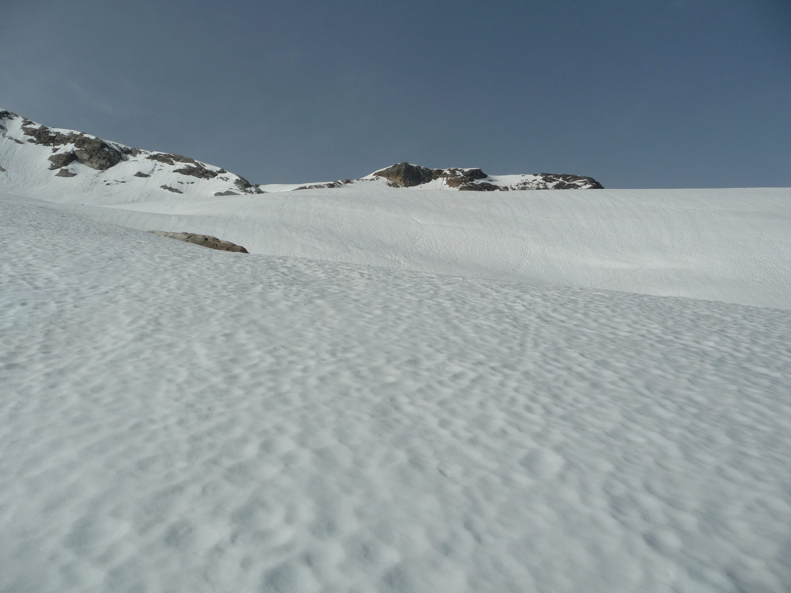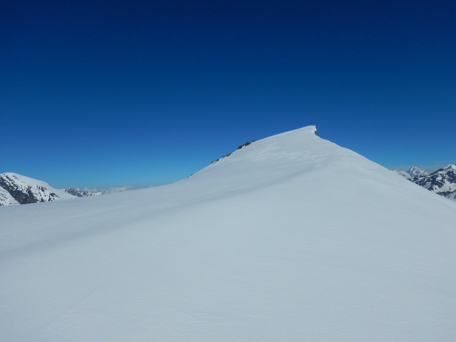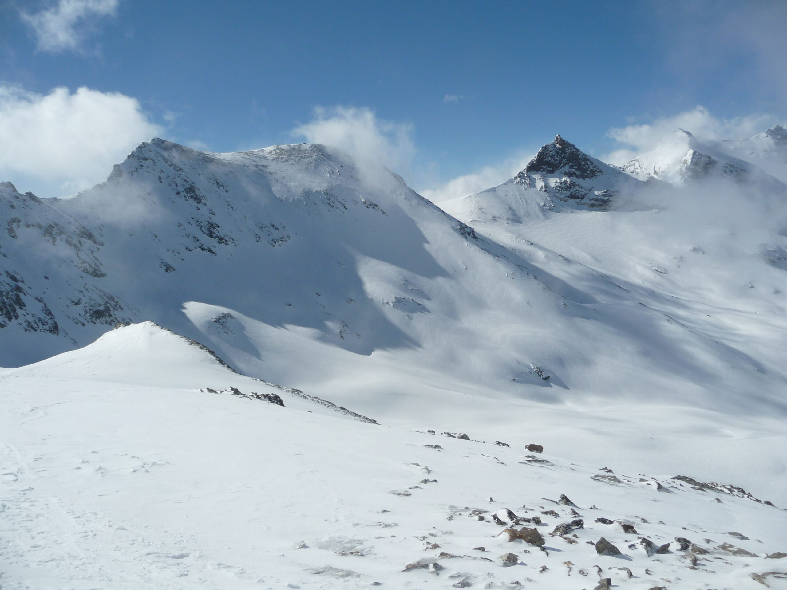 Superati questi dossi ci si sposta comodamente a destra per un ampio pendio, e quindi una nuova risalita più ripida ora verso sinistra conduce al dolce pendio che precede il Colle Giasson. Poco prima del colle ci si sposta a destra, e si prosegue con un traverso un po’ scomodo per giungere alla dorsale a breve distanza dalla cima. In alternativa dal colle è possibile seguire direttamente la dorsale nevosa che è facilmente percorribile fino in cima, contraddistinta da un paletto (attenzione alle cornici sul versante del vallone di salita).
