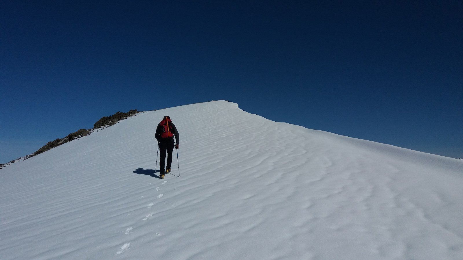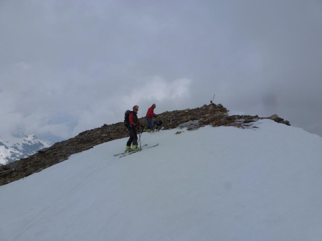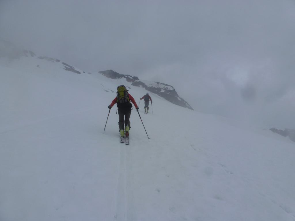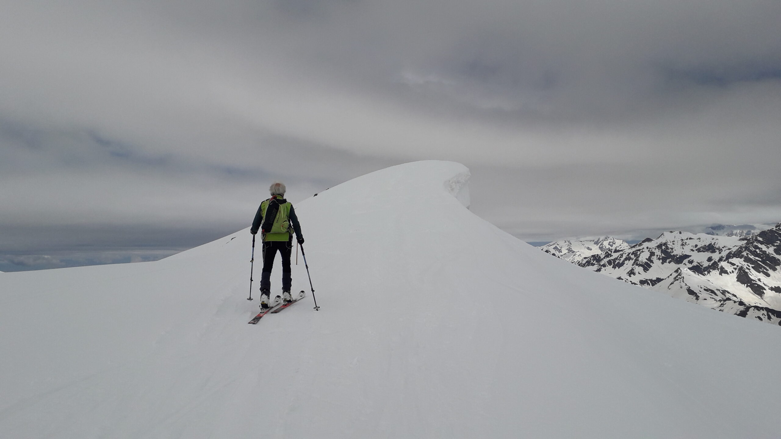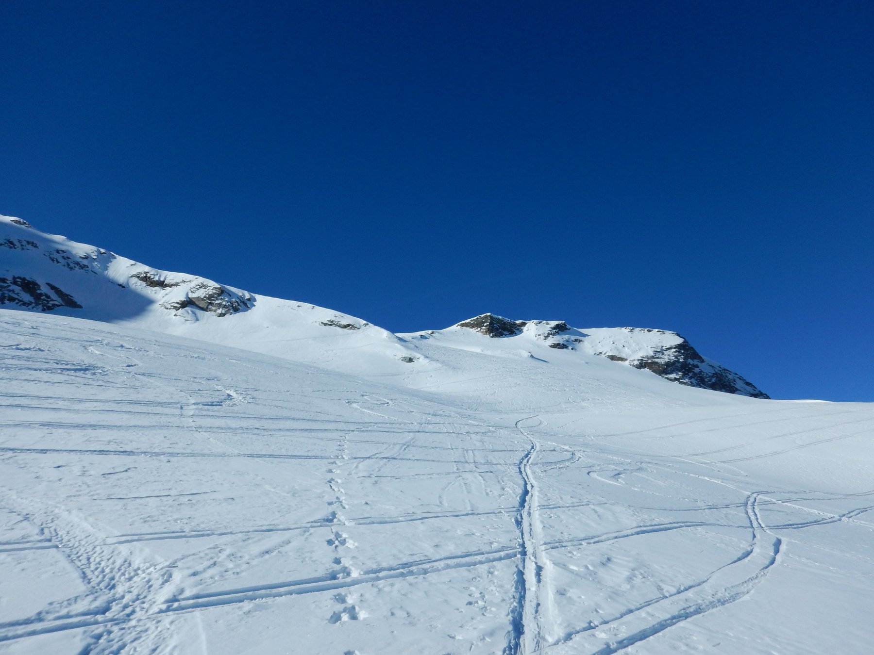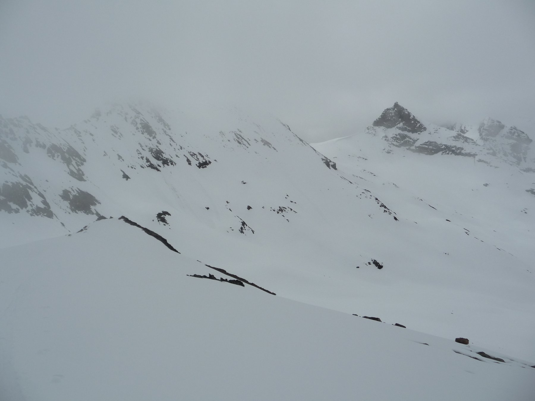 Superati questi dossi ci si sposta comodamente a destra per un ampio pendio, e quindi una nuova risalita più ripida ora verso sinistra conduce al dolce pendio che precede il Colle Giasson. Poco prima del colle ci si sposta a destra, e si prosegue con un traverso un po’ scomodo per giungere alla dorsale a breve distanza dalla cima. In alternativa dal colle è possibile seguire direttamente la dorsale nevosa che è facilmente percorribile fino in cima, contraddistinta da un paletto (attenzione alle cornici sul versante del vallone di salita).