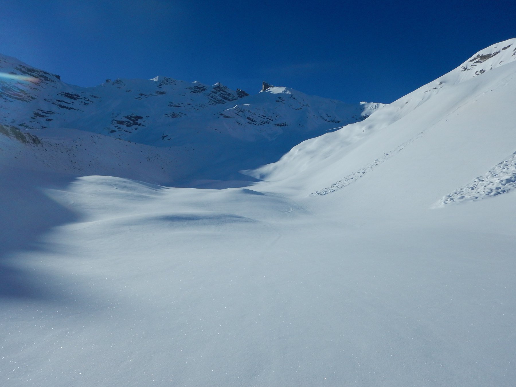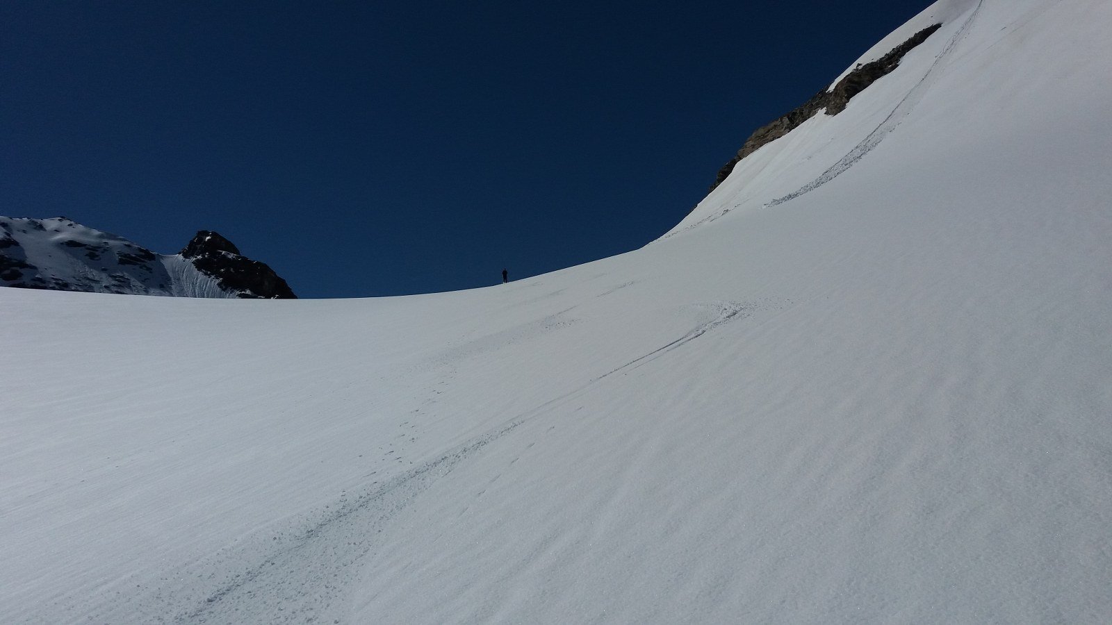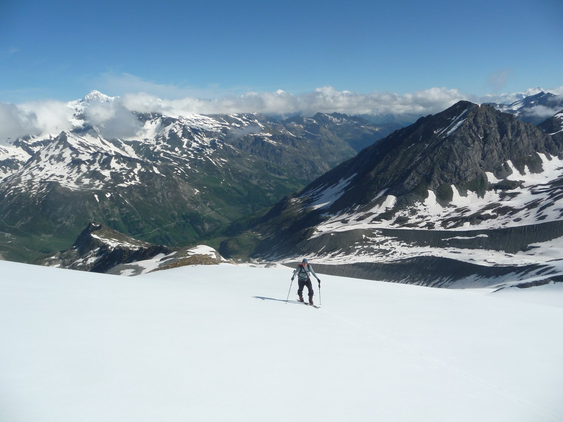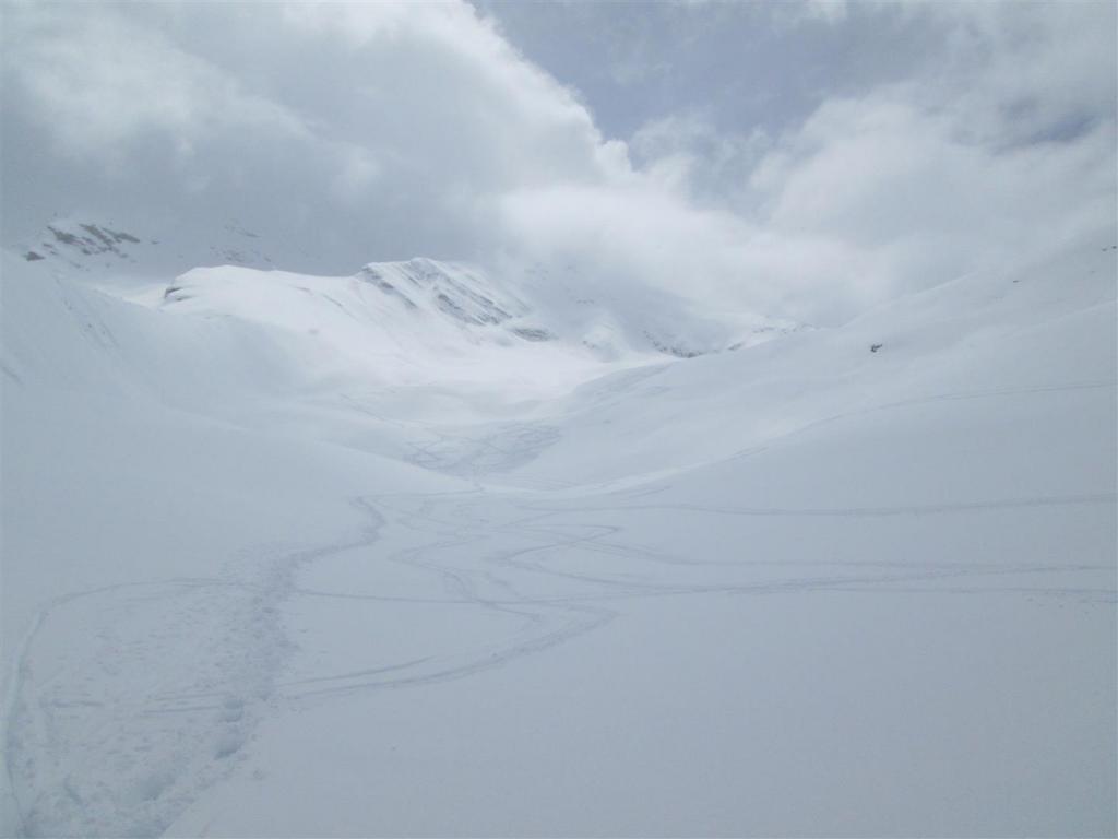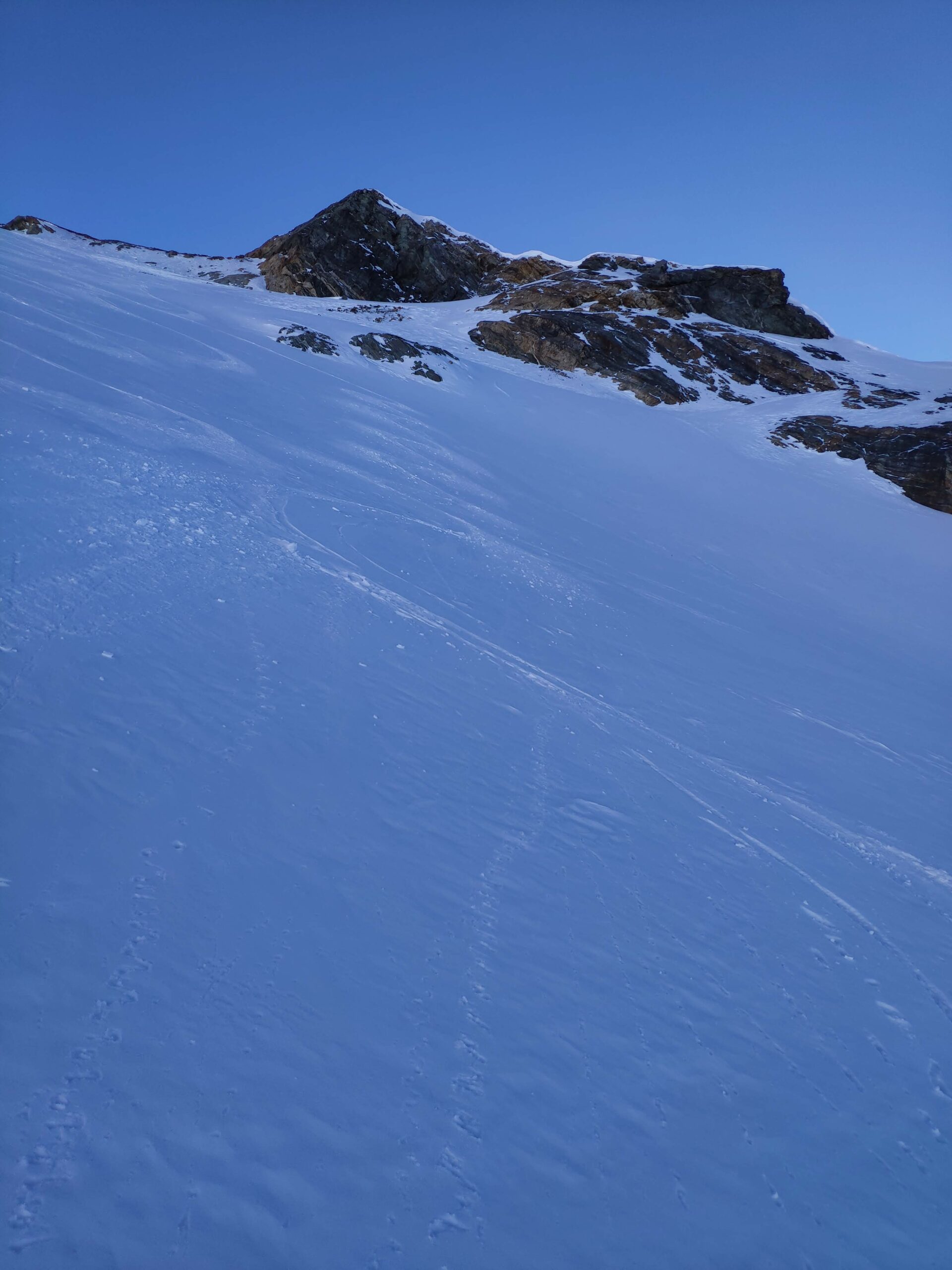 Superati questi dossi ci si sposta comodamente a destra per un ampio pendio, e quindi una nuova risalita più ripida ora verso sinistra conduce al dolce pendio che precede il Colle Giasson. Poco prima del colle ci si sposta a destra, e si prosegue con un traverso un po’ scomodo per giungere alla dorsale a breve distanza dalla cima. In alternativa dal colle è possibile seguire direttamente la dorsale nevosa che è facilmente percorribile fino in cima, contraddistinta da un paletto (attenzione alle cornici sul versante del vallone di salita).