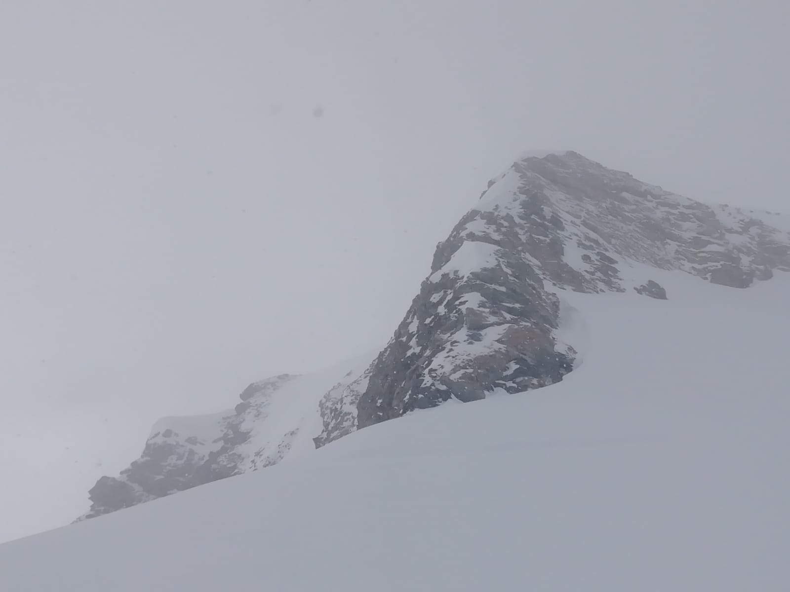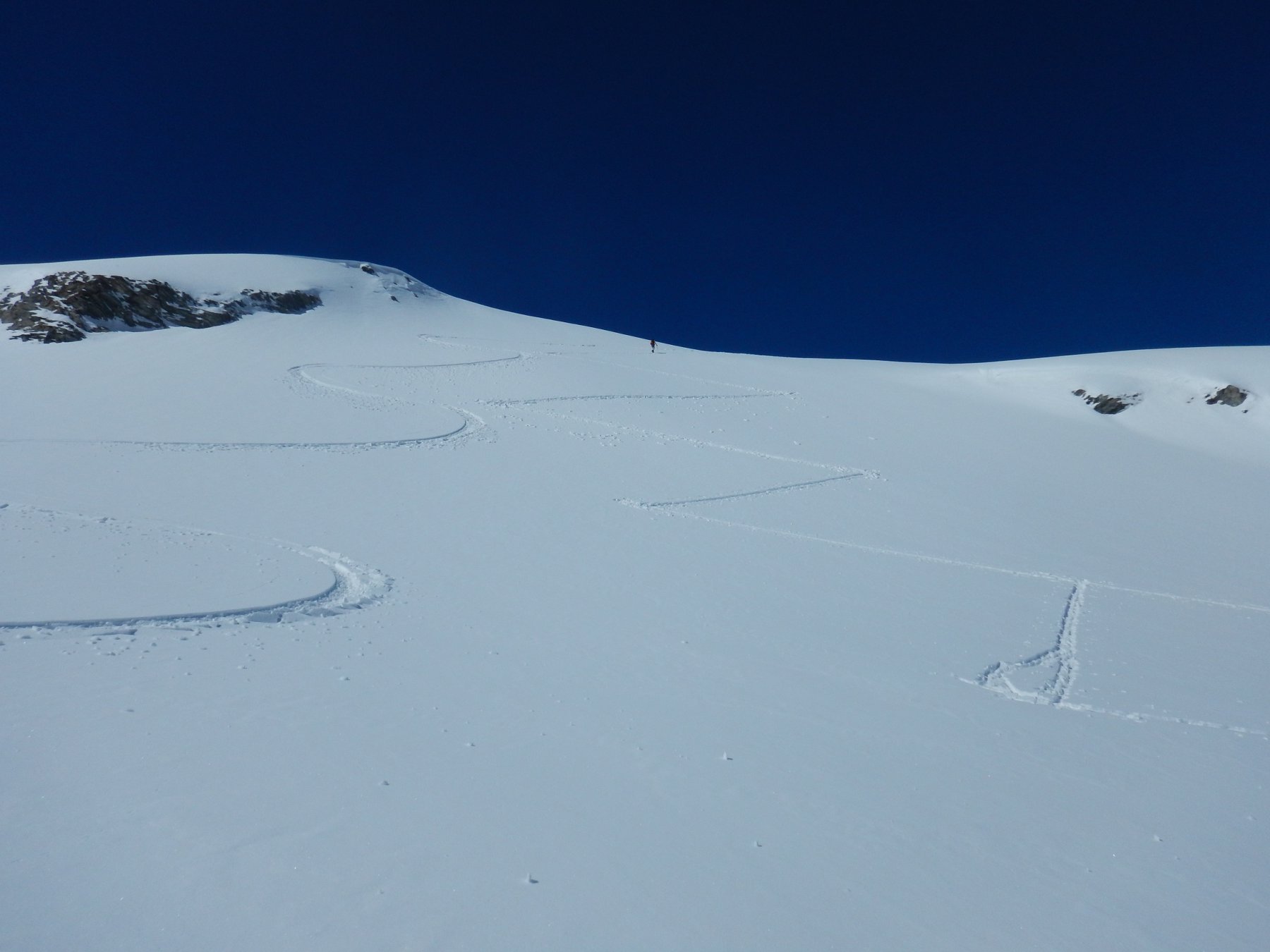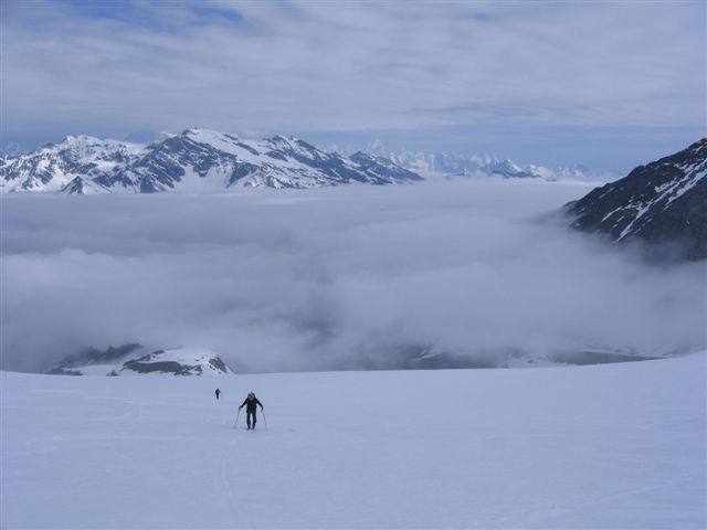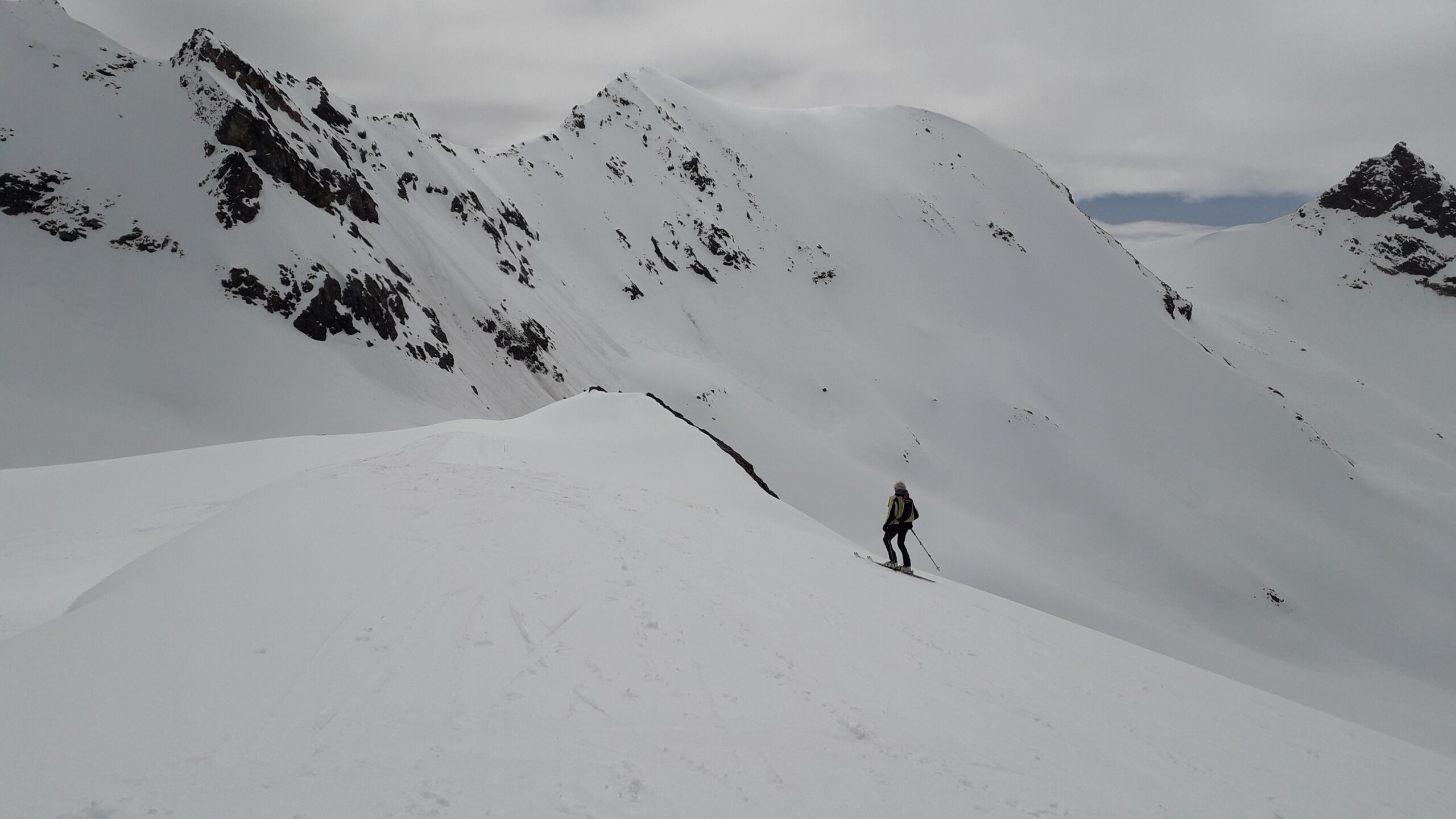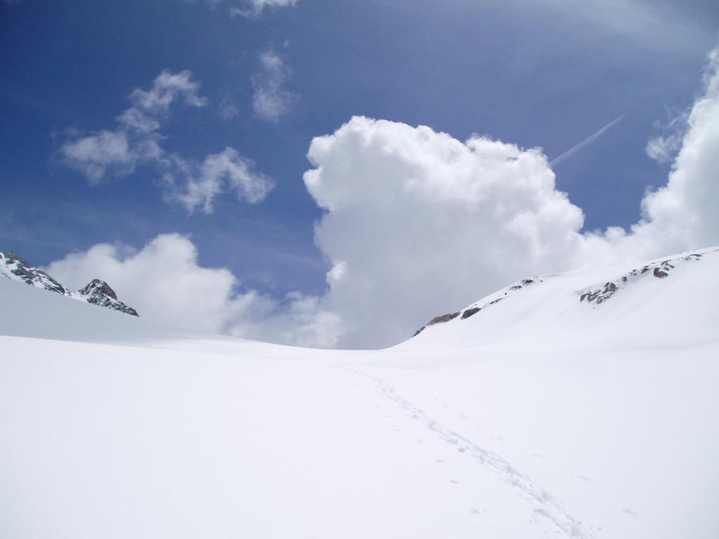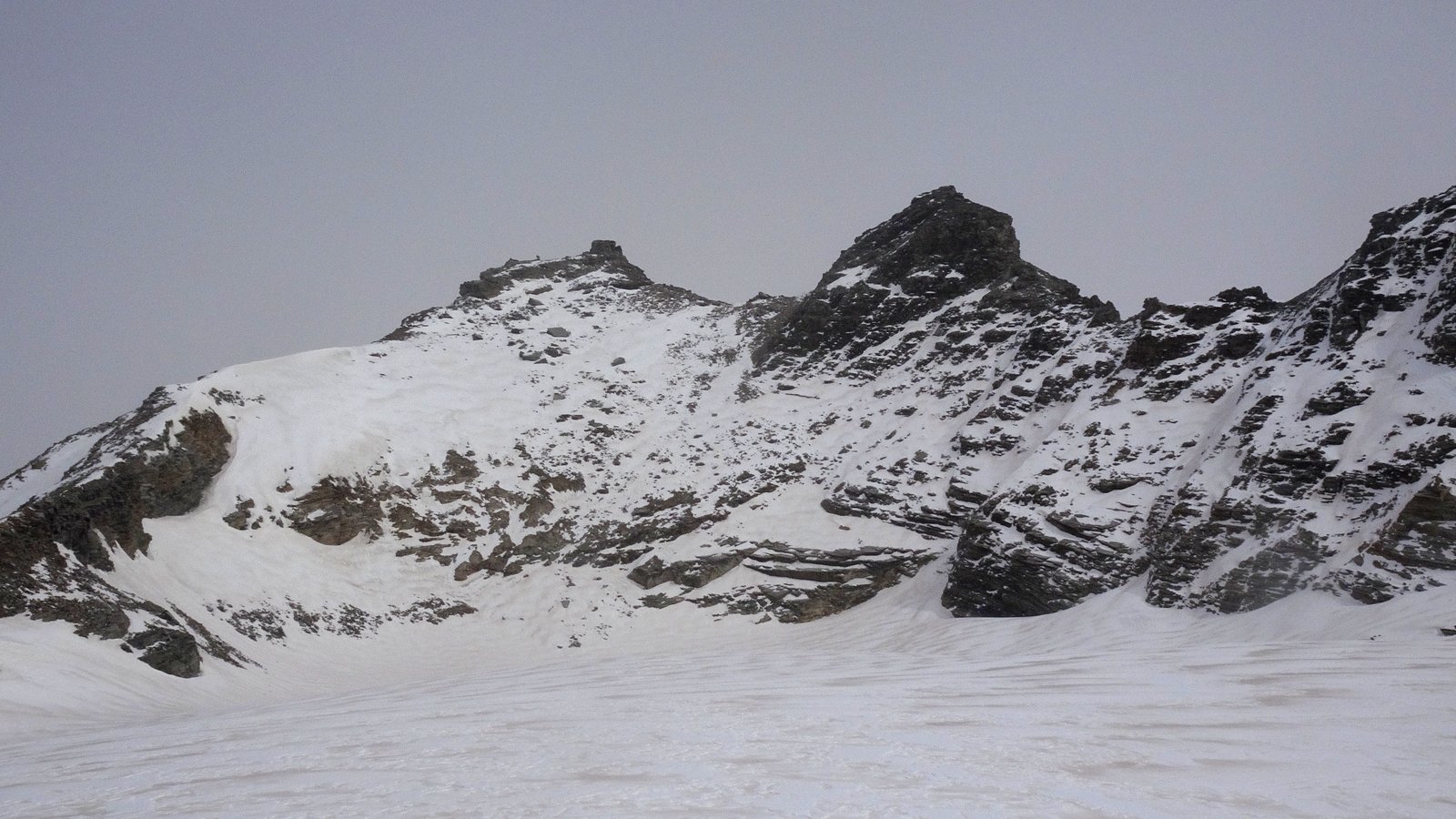 Superati questi dossi ci si sposta comodamente a destra per un ampio pendio, e quindi una nuova risalita più ripida ora verso sinistra conduce al dolce pendio che precede il Colle Giasson. Poco prima del colle ci si sposta a destra, e si prosegue con un traverso un po’ scomodo per giungere alla dorsale a breve distanza dalla cima. In alternativa dal colle è possibile seguire direttamente la dorsale nevosa che è facilmente percorribile fino in cima, contraddistinta da un paletto (attenzione alle cornici sul versante del vallone di salita).