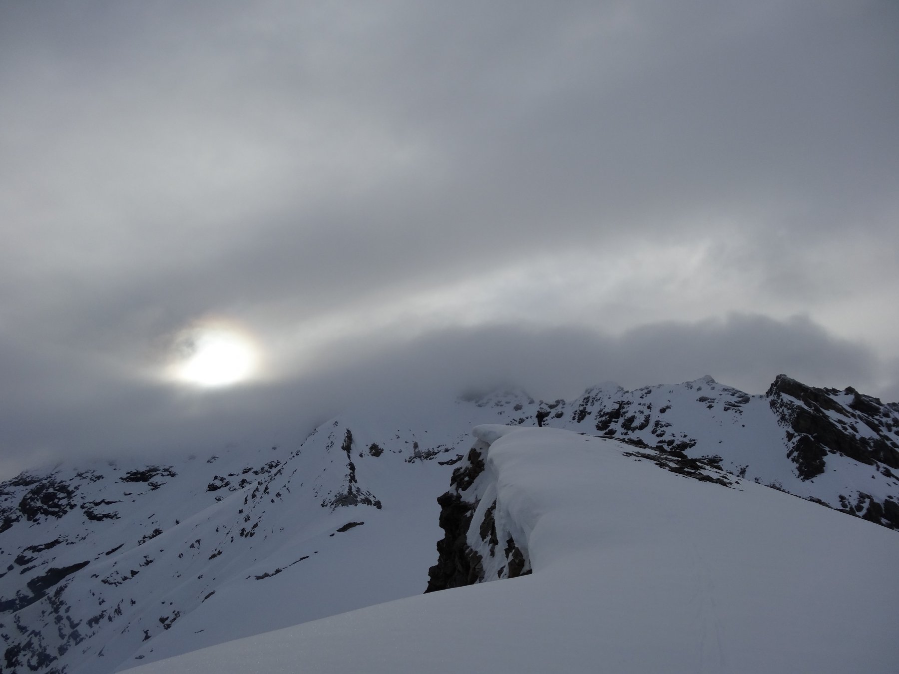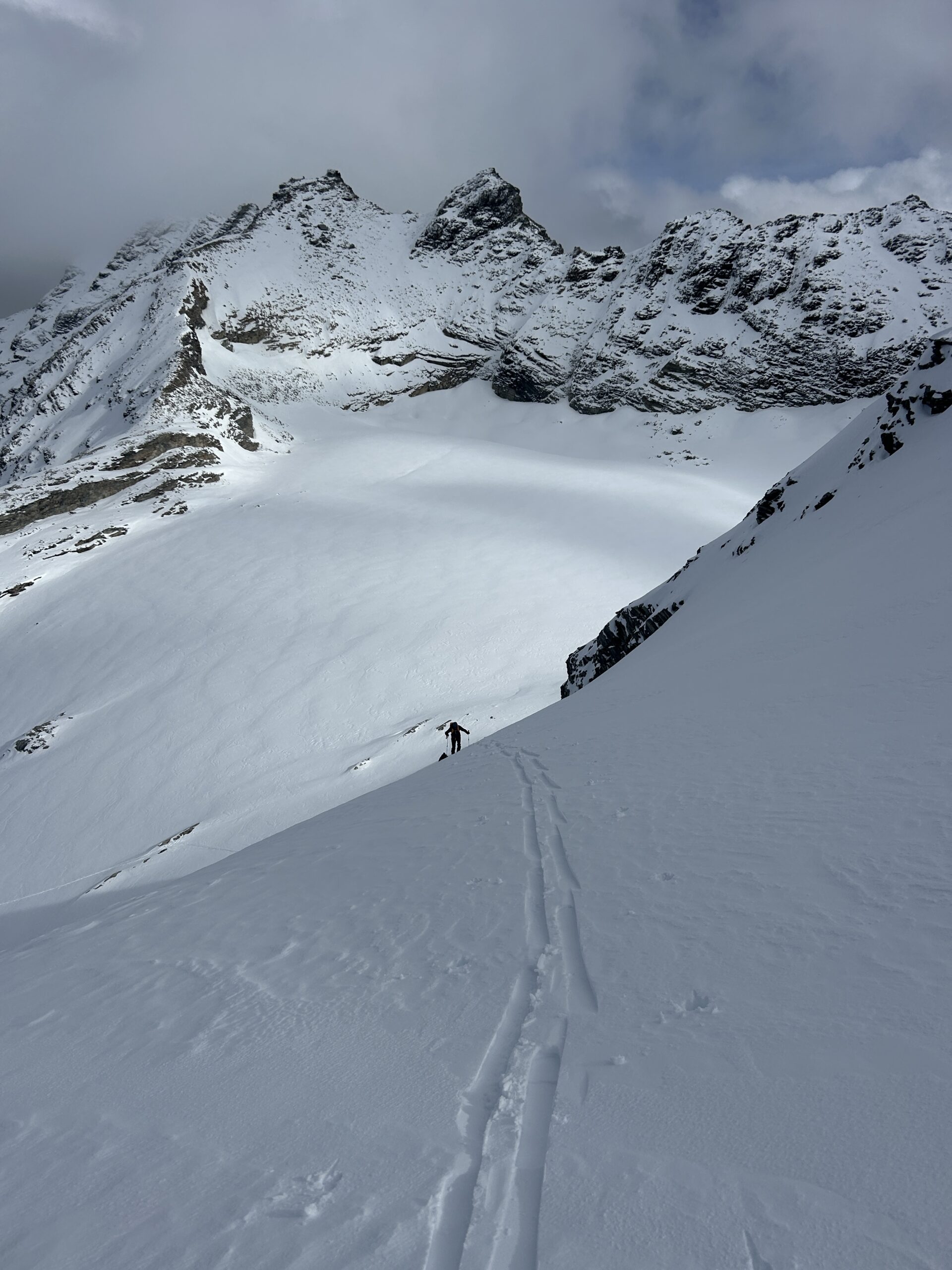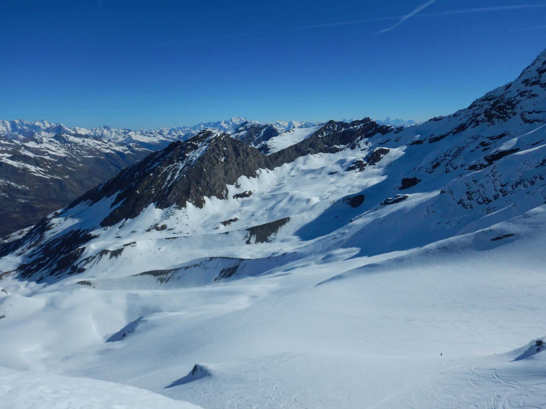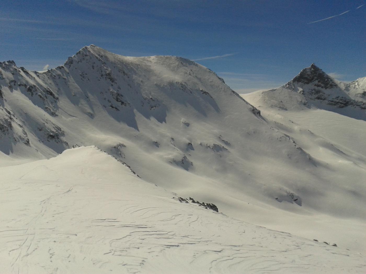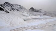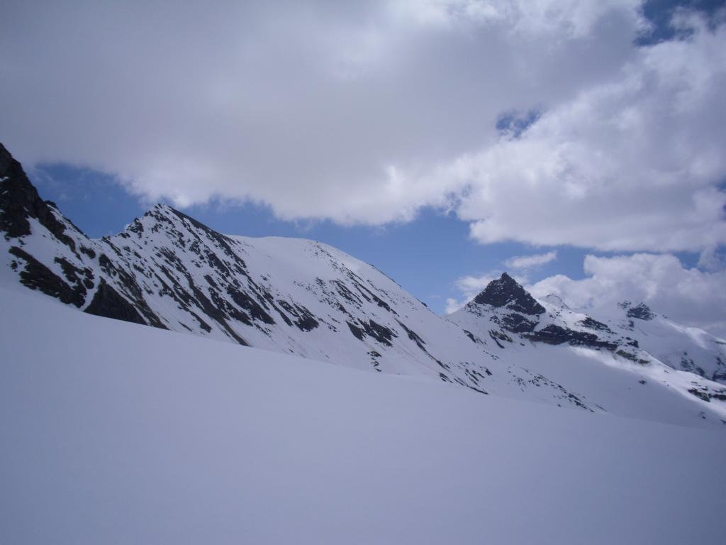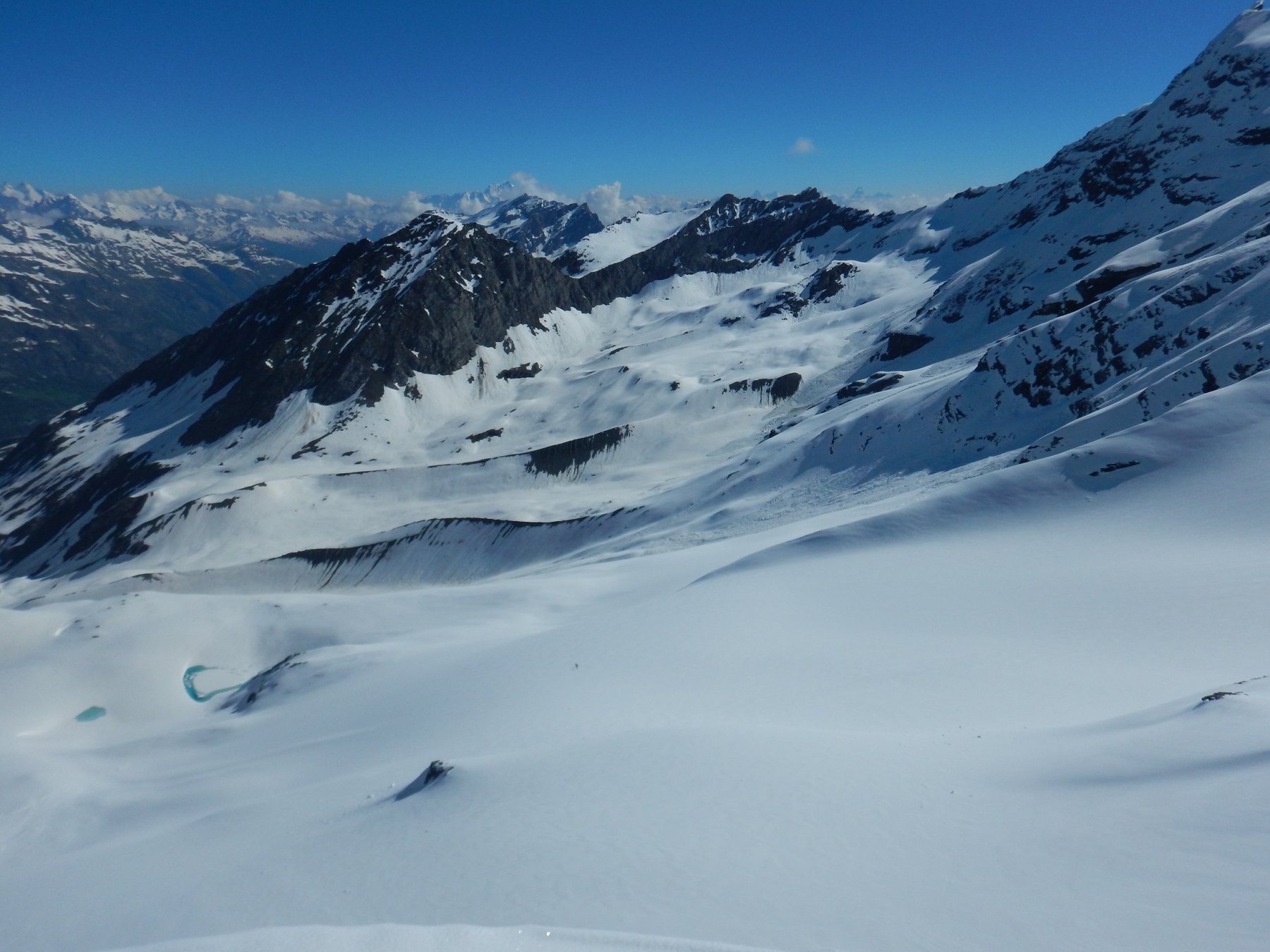 Superati questi dossi ci si sposta comodamente a destra per un ampio pendio, e quindi una nuova risalita più ripida ora verso sinistra conduce al dolce pendio che precede il Colle Giasson. Poco prima del colle ci si sposta a destra, e si prosegue con un traverso un po’ scomodo per giungere alla dorsale a breve distanza dalla cima. In alternativa dal colle è possibile seguire direttamente la dorsale nevosa che è facilmente percorribile fino in cima, contraddistinta da un paletto (attenzione alle cornici sul versante del vallone di salita).
