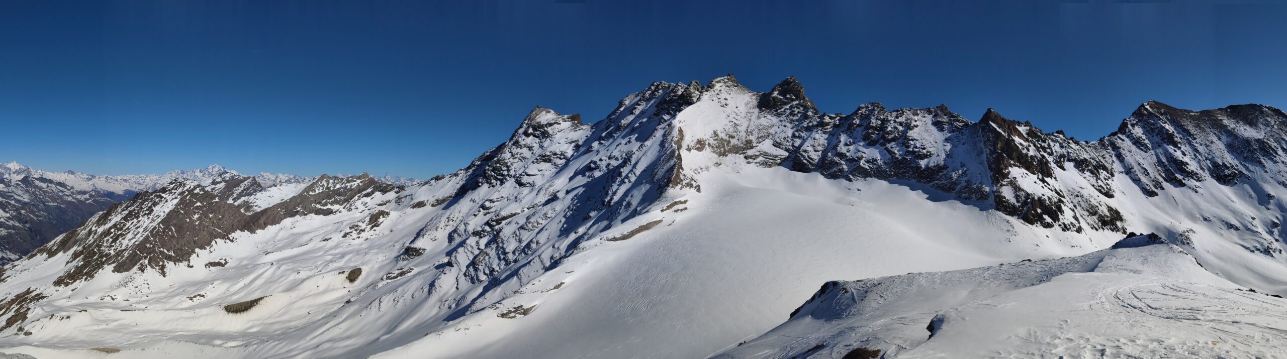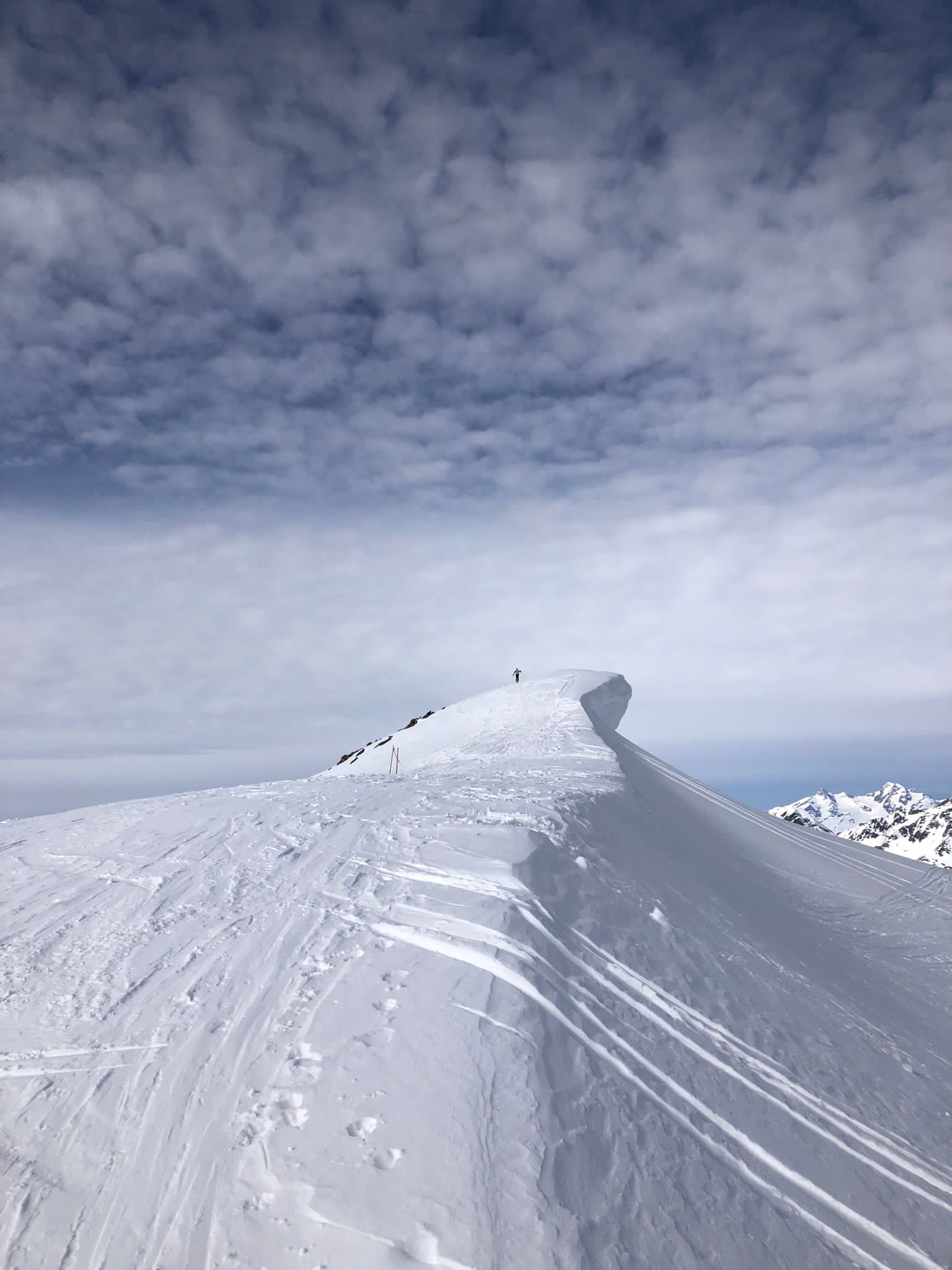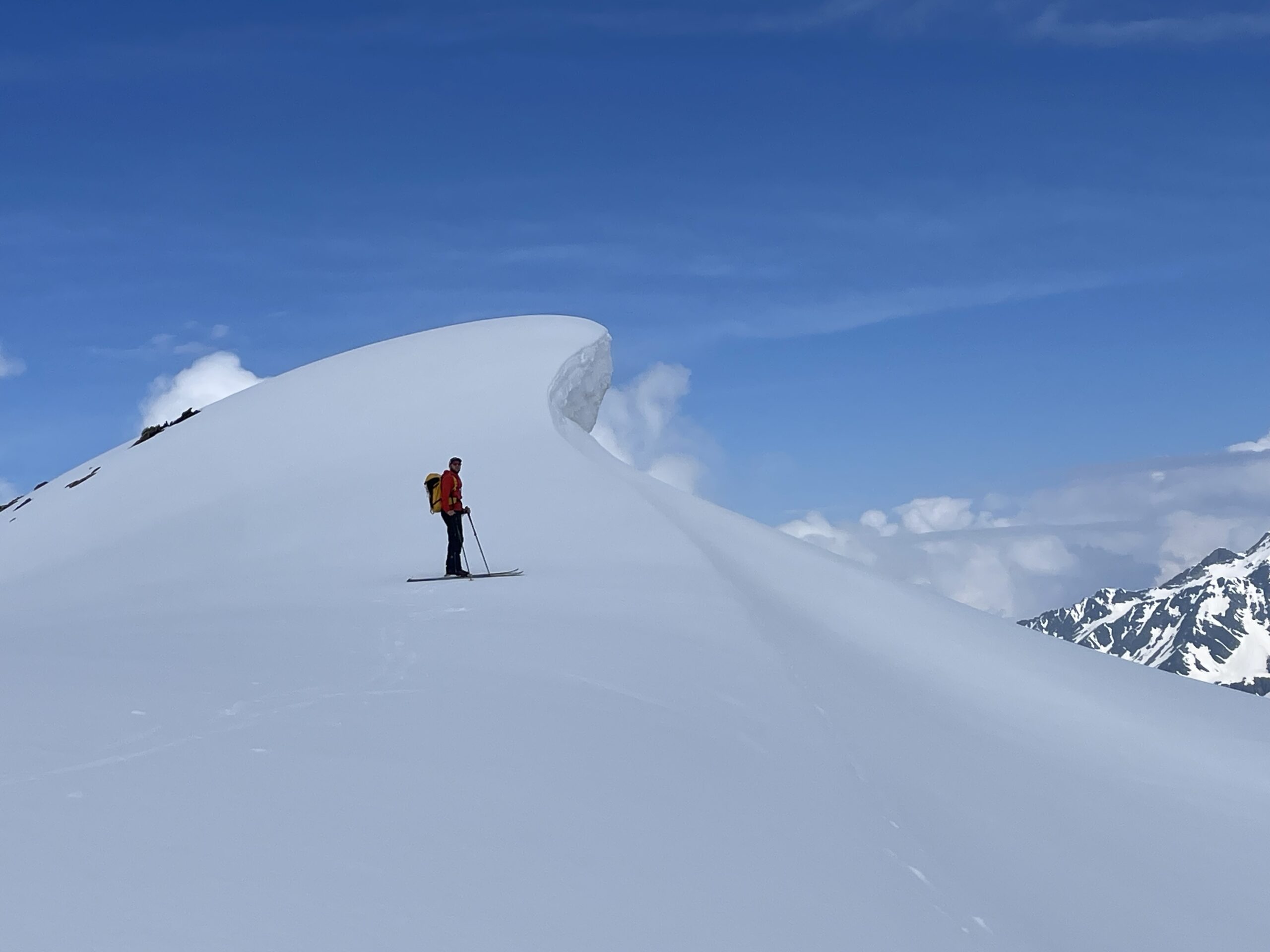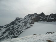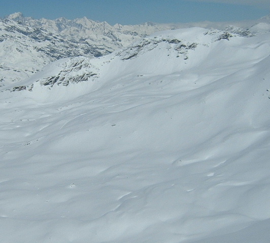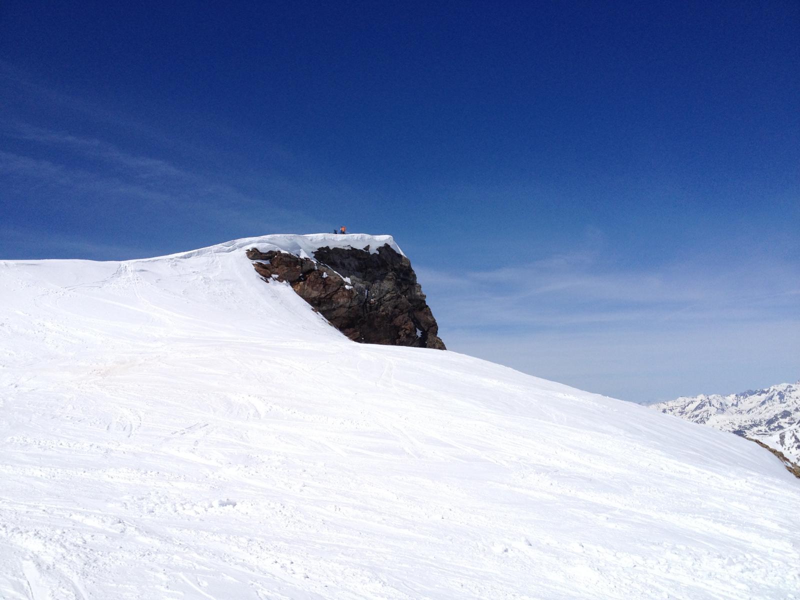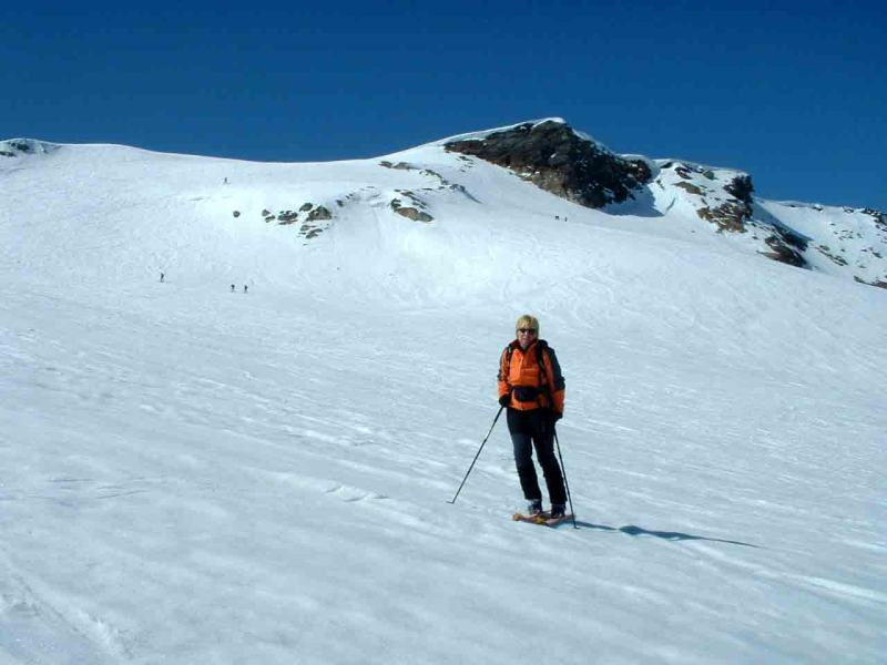Superati questi dossi ci si sposta comodamente a destra per un ampio pendio, e quindi una nuova risalita più ripida ora verso sinistra conduce al dolce pendio che precede il Colle Giasson. Poco prima del colle ci si sposta a destra, e si prosegue con un traverso un po’ scomodo per giungere alla dorsale a breve distanza dalla cima. In alternativa dal colle è possibile seguire direttamente la dorsale nevosa che è facilmente percorribile fino in cima, contraddistinta da un paletto (attenzione alle cornici sul versante del vallone di salita).