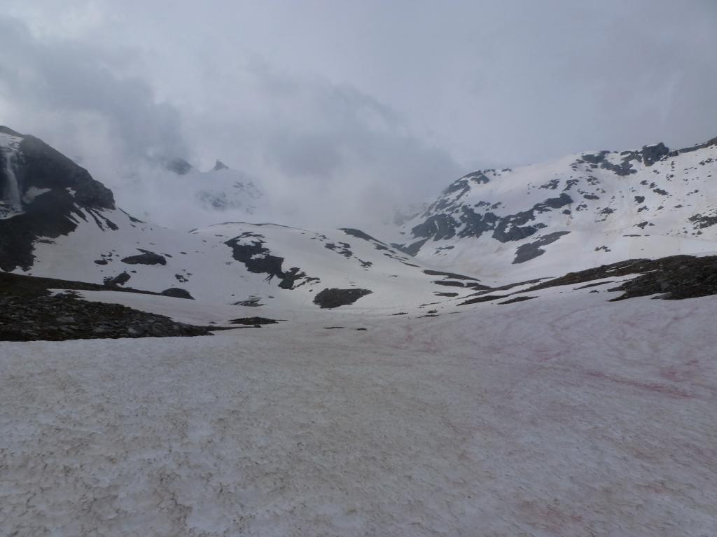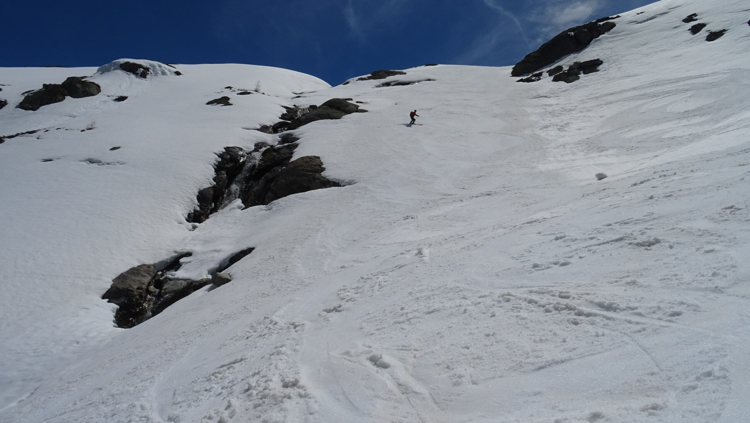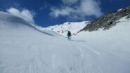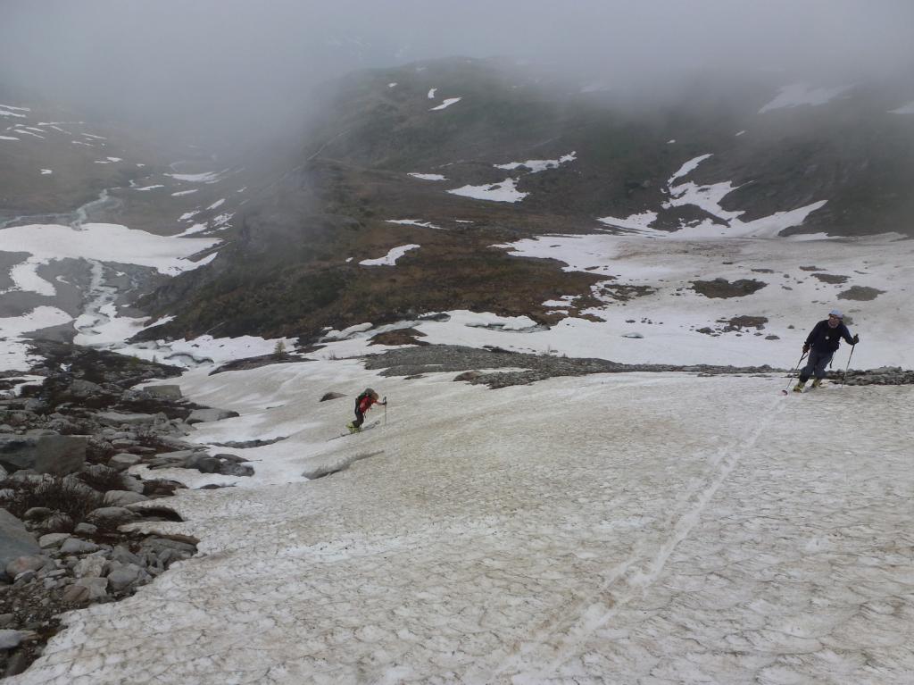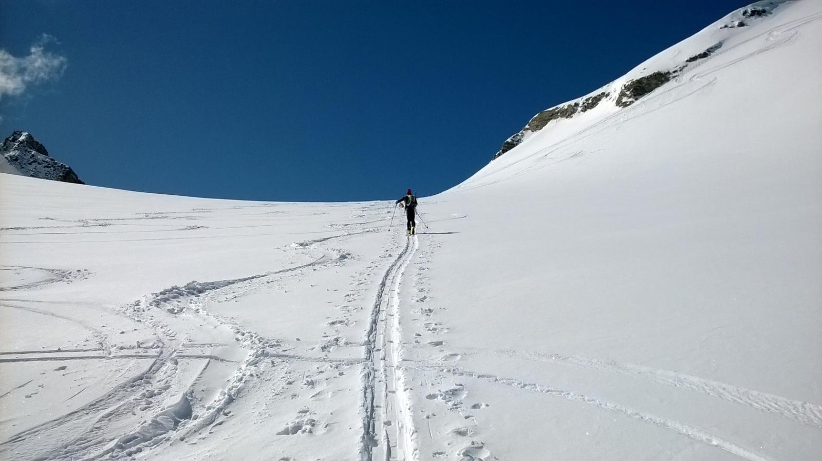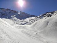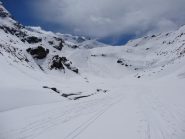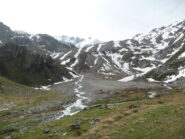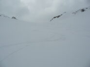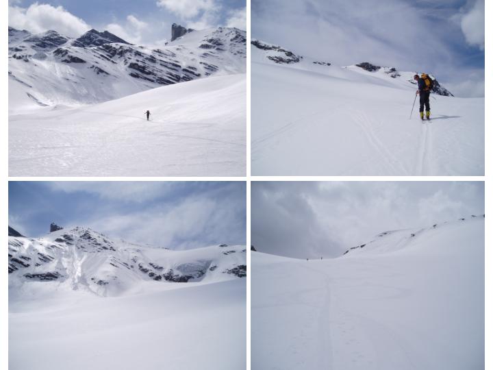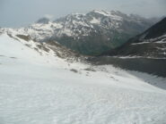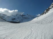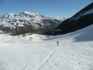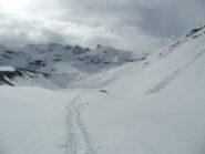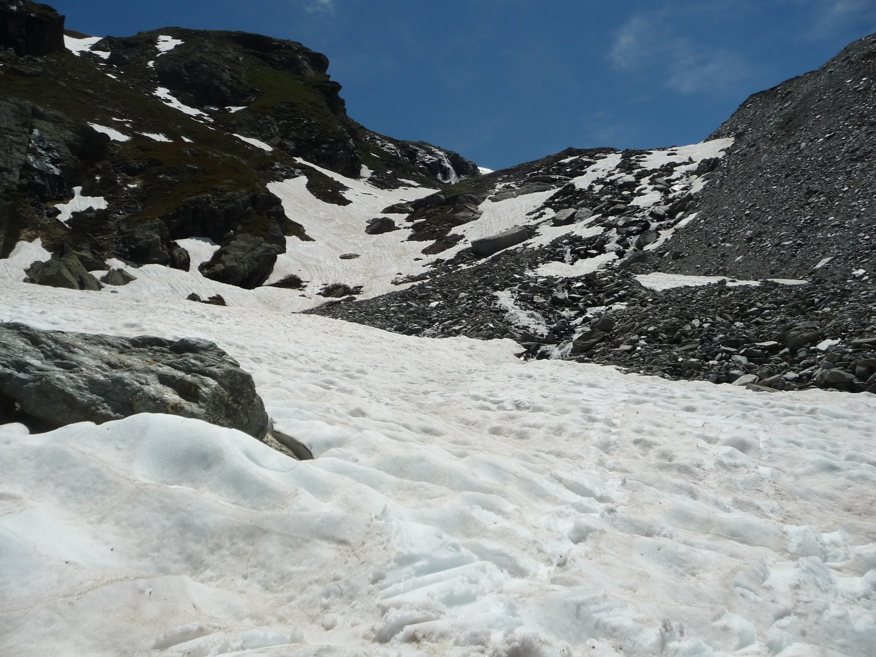 Ci si sposta a destra, percorrendo la valletta del Giasson quasi pianeggiante e lasciandosi il costone della morena che separa il ghiacciaio di Giasson da quello di Invergnan sulla sinistra. Superato un pianoro incassato, si raggiungono dei pendii ora in salita più marcata, conviene salire sempre al centro su dossi e gobbe poco pronunciate, stando a debita distanza dai ripidi pendii sotto la Punta di Barmaverin.