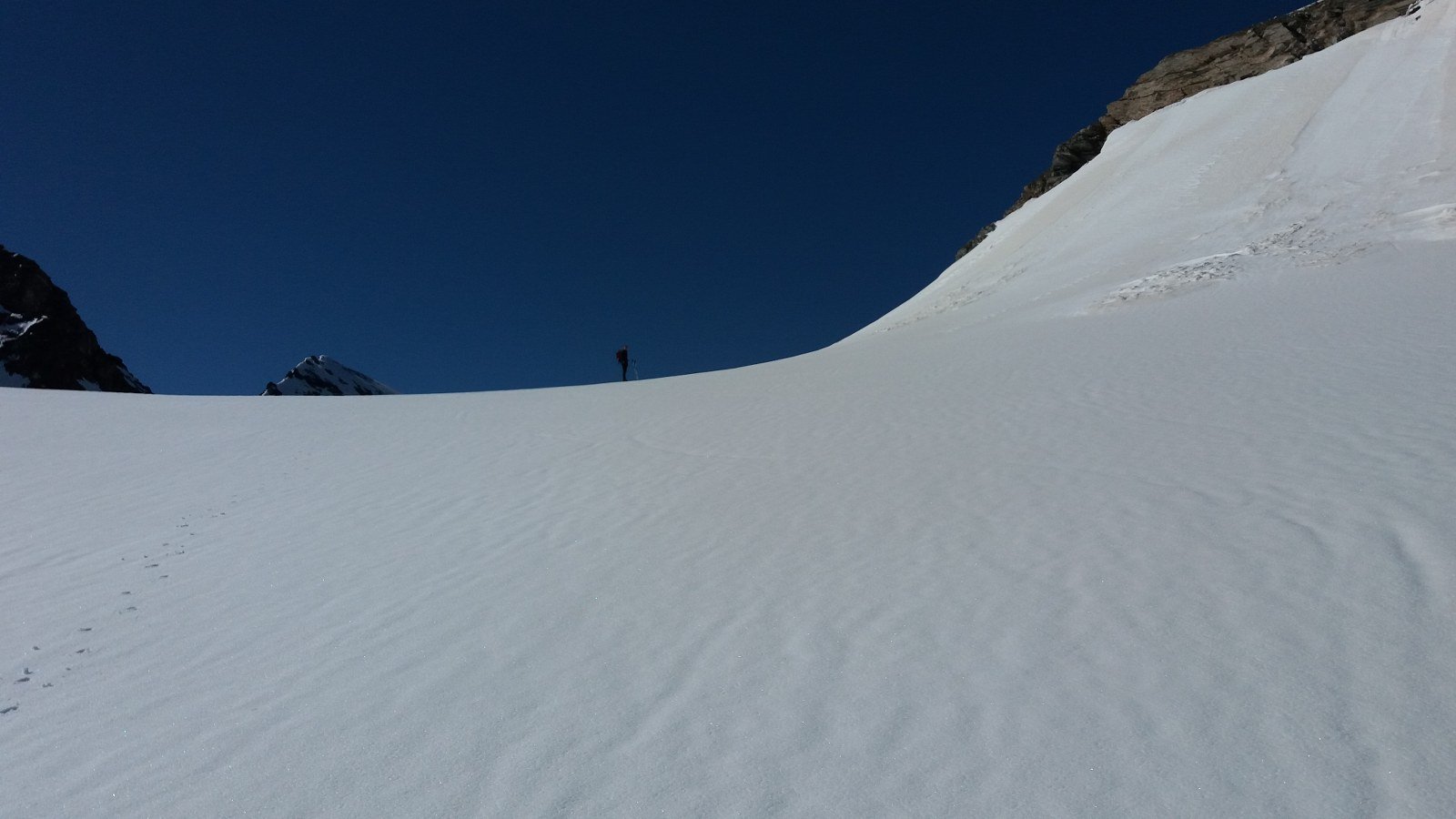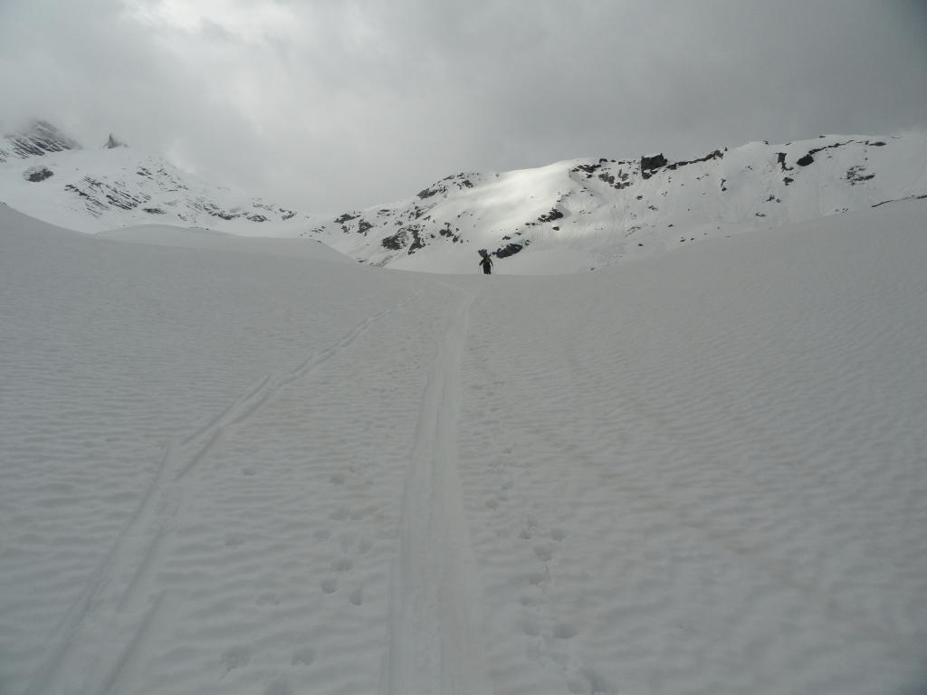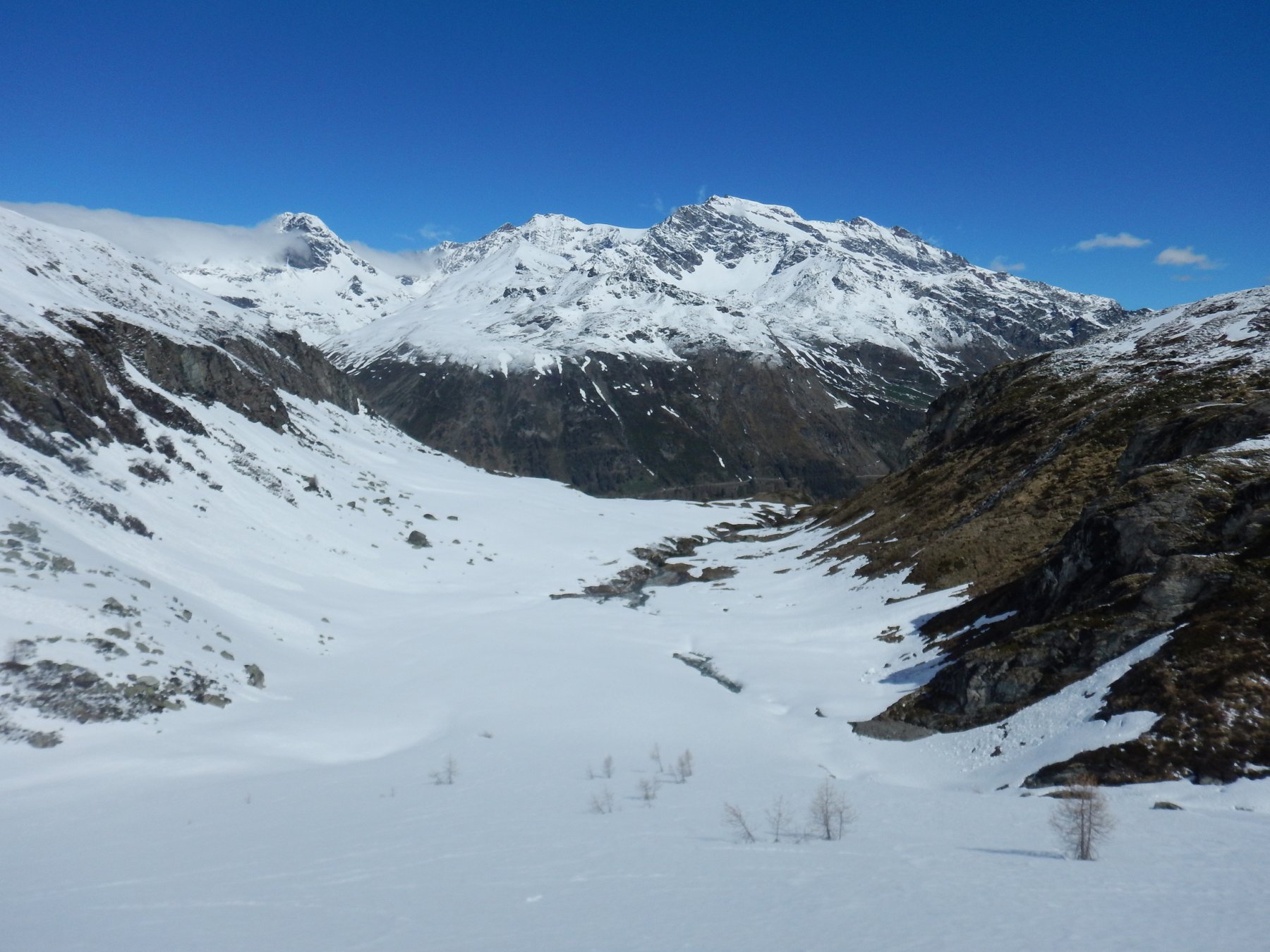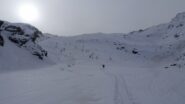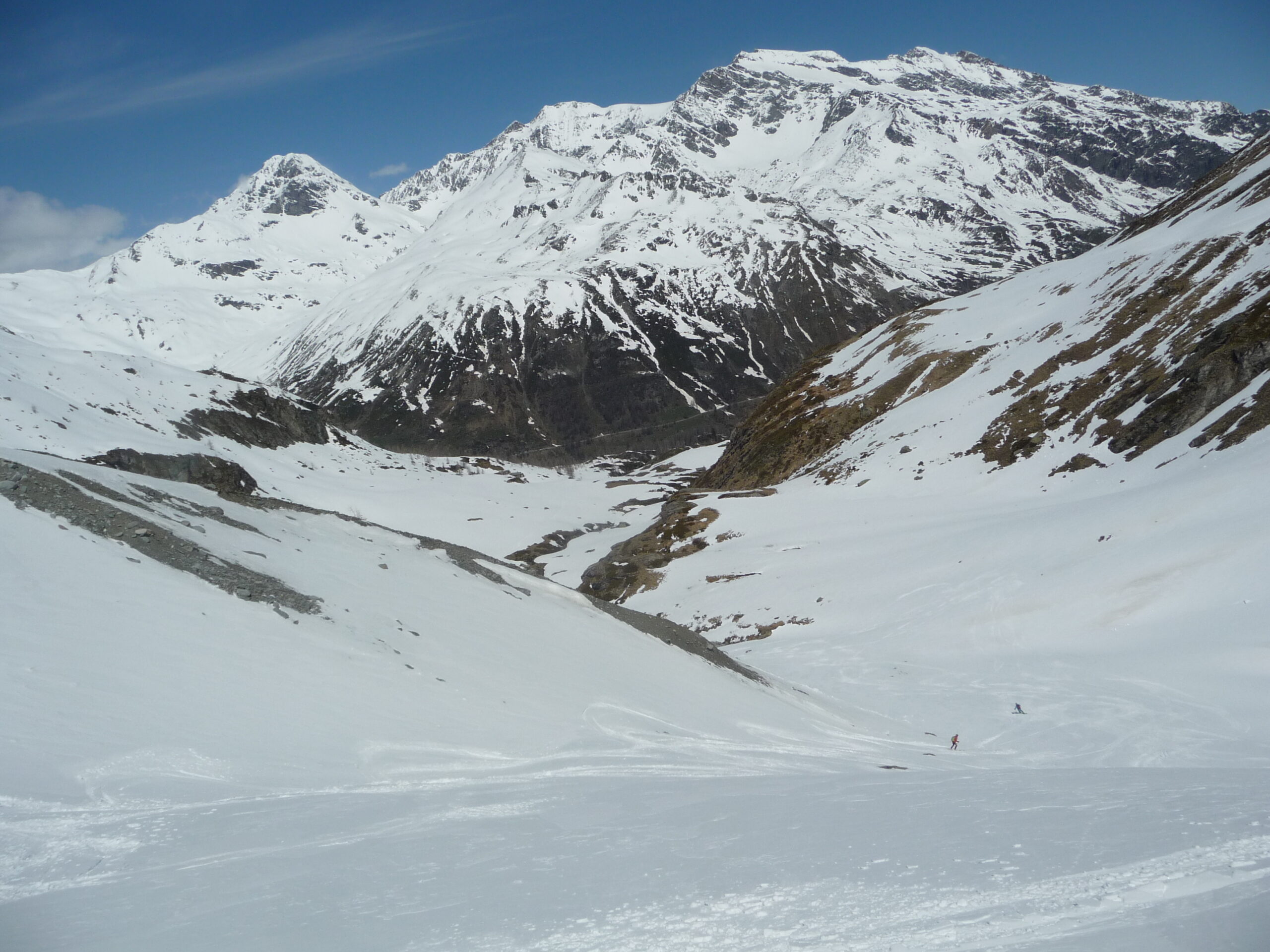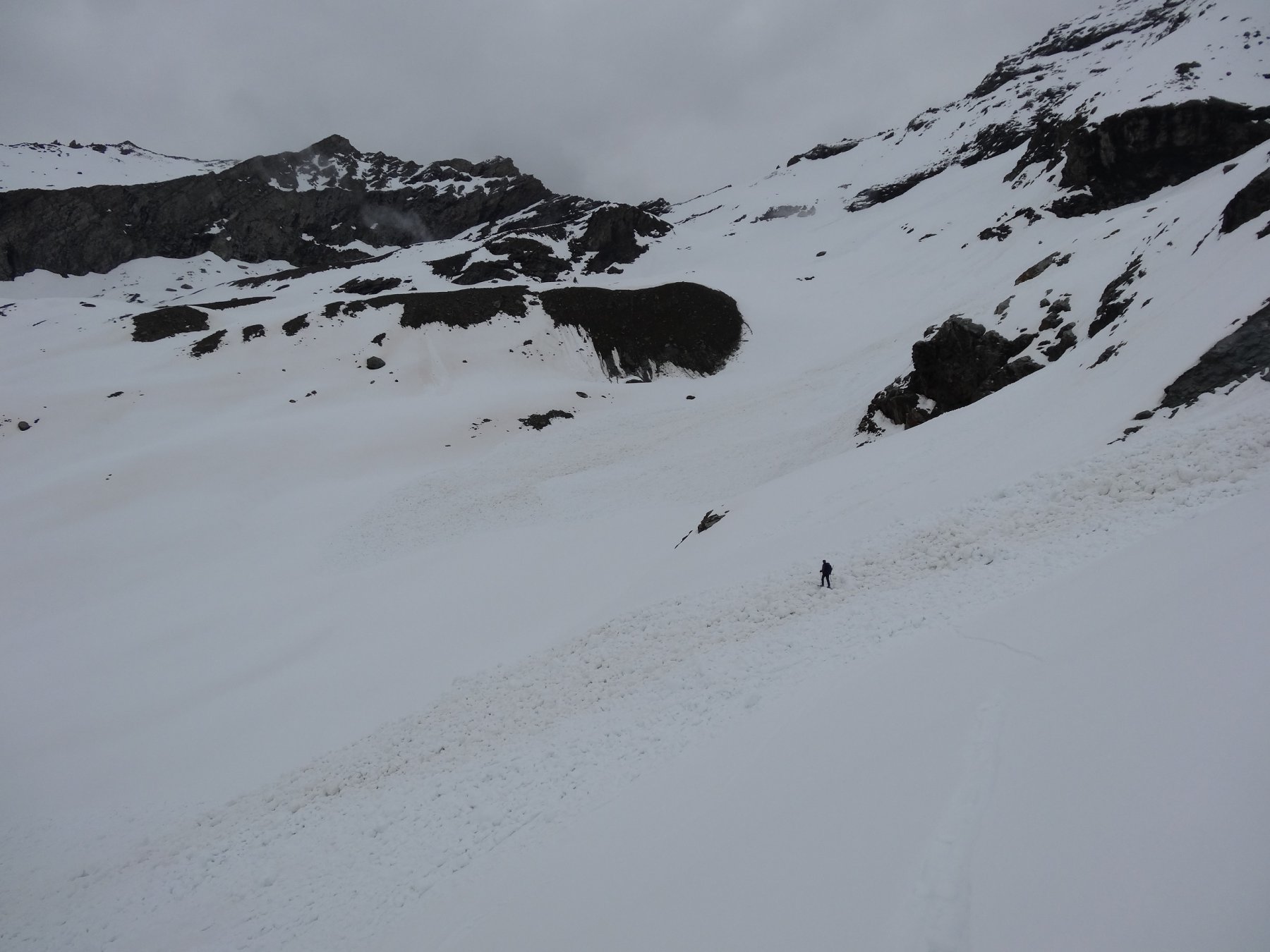 Ci si sposta a destra, percorrendo la valletta del Giasson quasi pianeggiante e lasciandosi il costone della morena che separa il ghiacciaio di Giasson da quello di Invergnan sulla sinistra. Superato un pianoro incassato, si raggiungono dei pendii ora in salita più marcata, conviene salire sempre al centro su dossi e gobbe poco pronunciate, stando a debita distanza dai ripidi pendii sotto la Punta di Barmaverin.