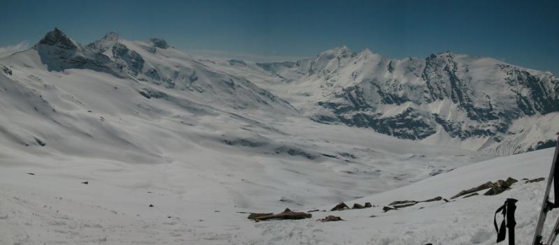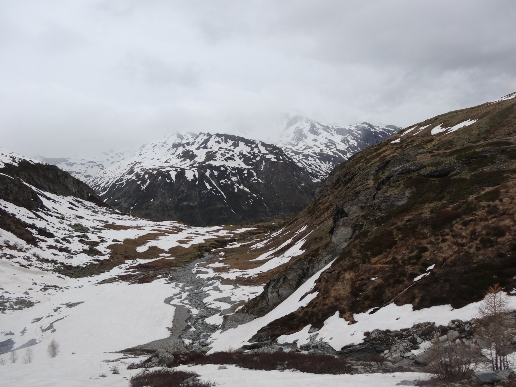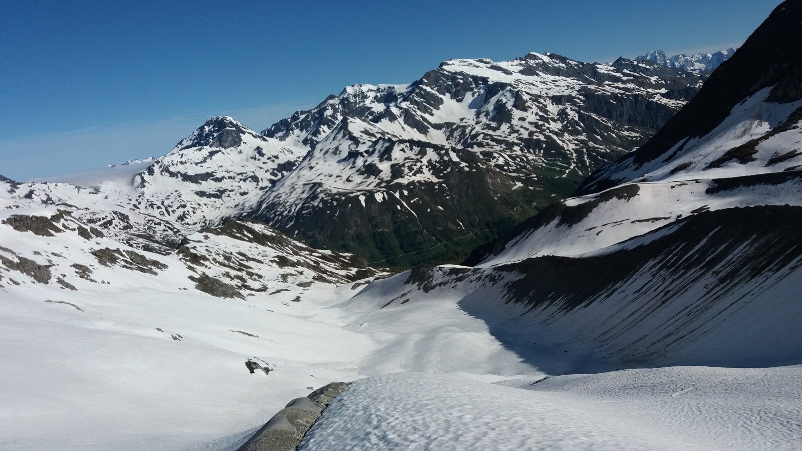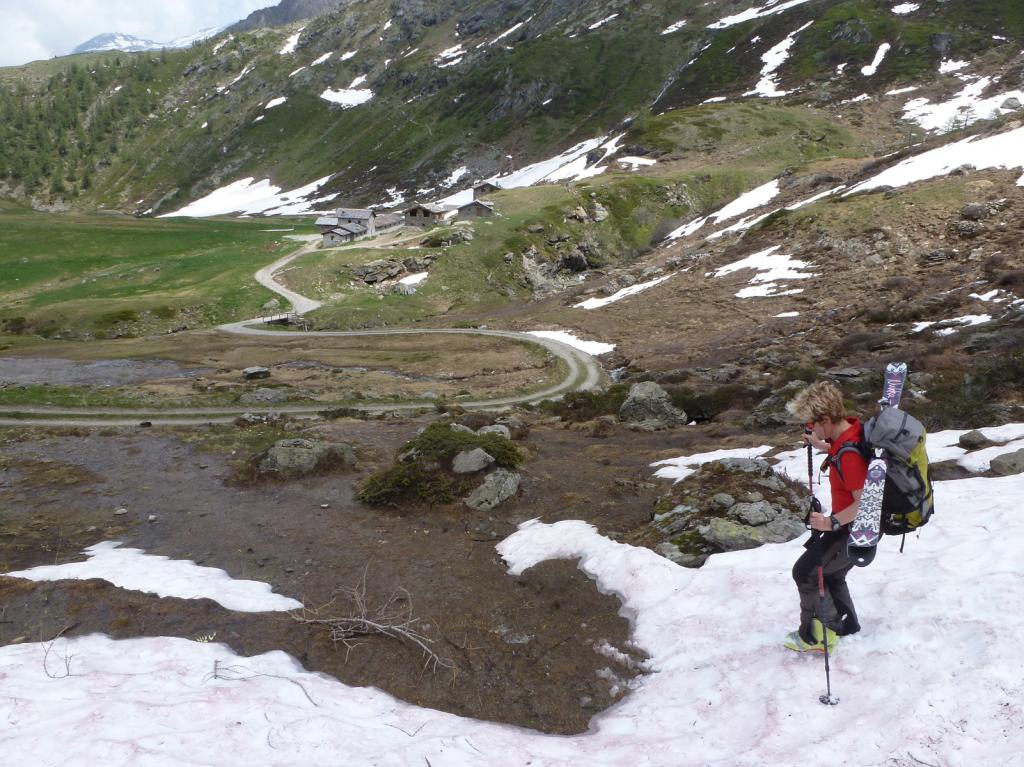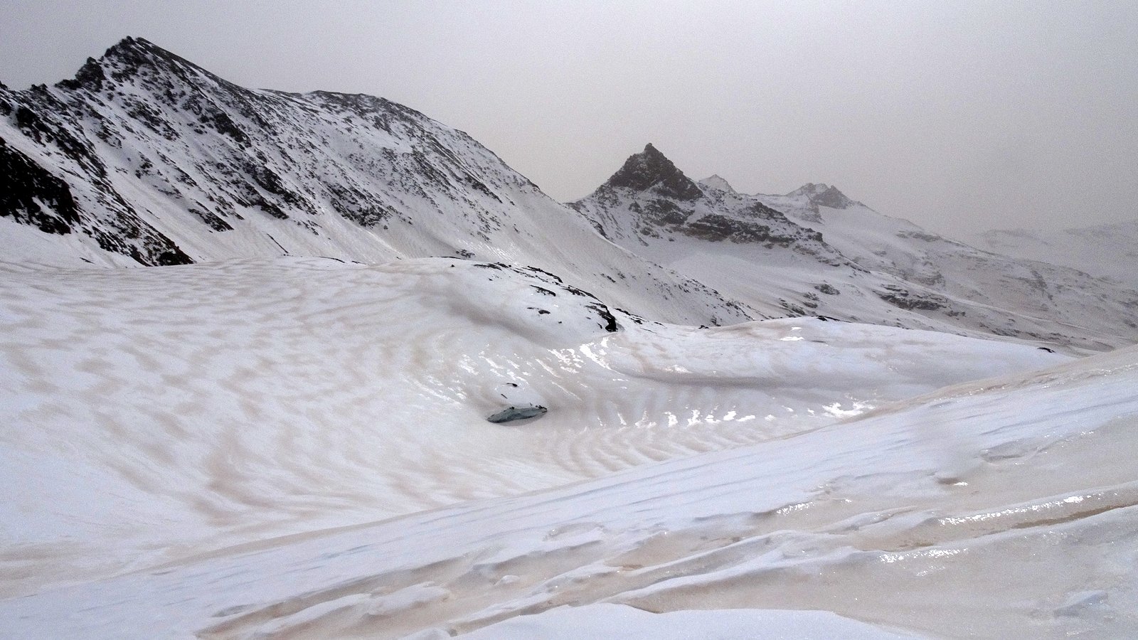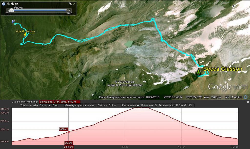 Ci si sposta a destra, percorrendo la valletta del Giasson quasi pianeggiante e lasciandosi il costone della morena che separa il ghiacciaio di Giasson da quello di Invergnan sulla sinistra. Superato un pianoro incassato, si raggiungono dei pendii ora in salita più marcata, conviene salire sempre al centro su dossi e gobbe poco pronunciate, stando a debita distanza dai ripidi pendii sotto la Punta di Barmaverin.