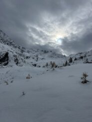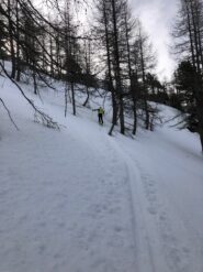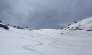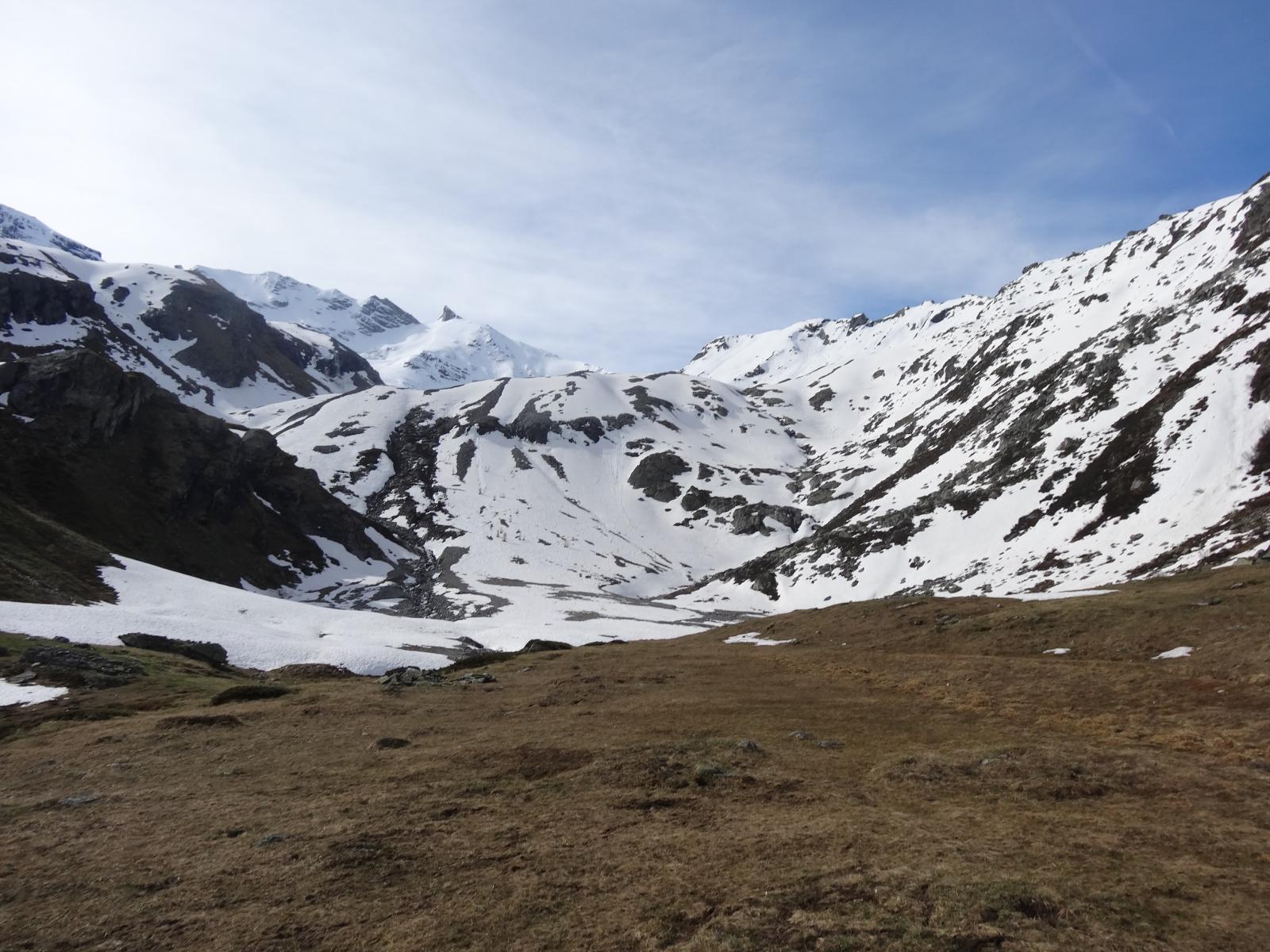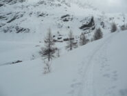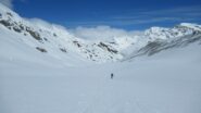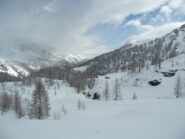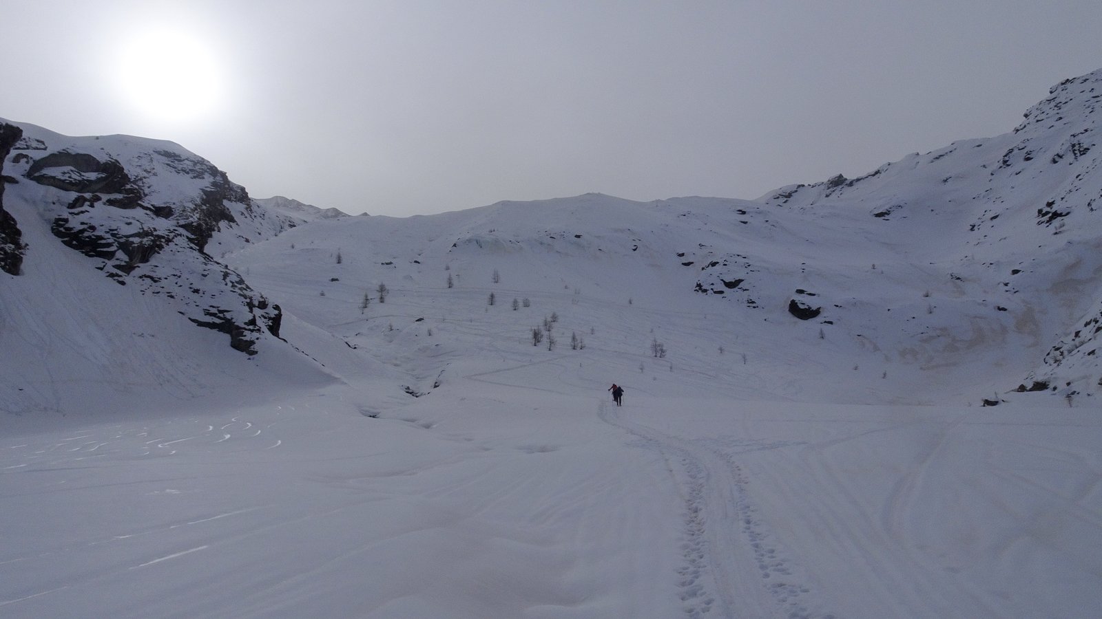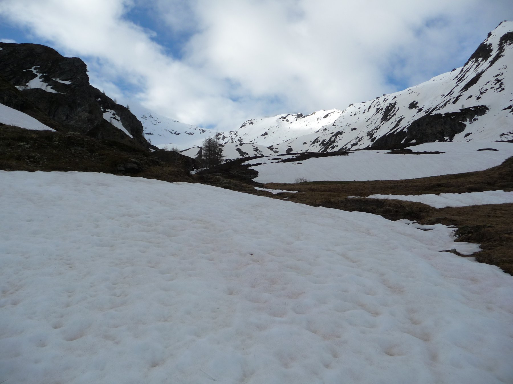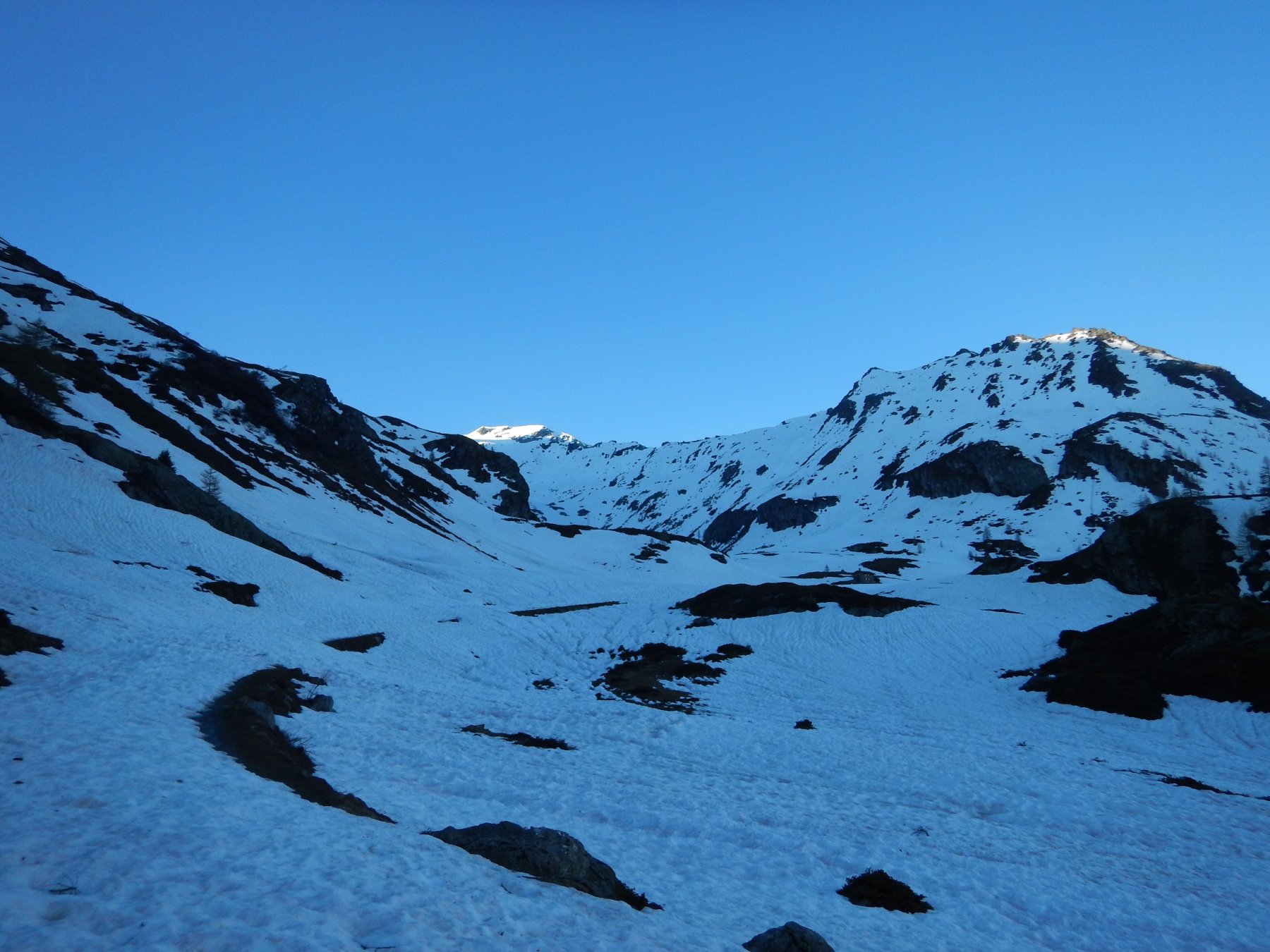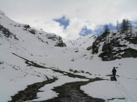 Oltre gli ultimi alpeggi, si attraversa il ponticello sul torrente, e si sale il primo dosso che conduce ad una bella conca. Raggiunto il termine del pianoro, si risale un dosso più ripido, con percorso a piacere, o in una specie di canalino a destra, oppure su un pendio a al centro, o ancora per un’avvallamento laterale a sinistra (percorso meno ripido). In ogni caso si perviene ad un secondo ripiano, dal quale si vede quasi tutta la parte alta del percorso.