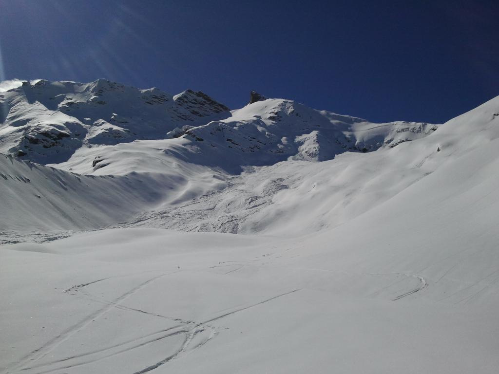 Splendida gita. Partenza sci ai piedi da Usellieres. Ravanato un po nel bosco in salita. La neve comunque è abbondante. Incontrato poi all’inizio dei pianori superiori altro scialpinista della Valsesia con il quale ho condiviso la gita (ha tracciato solo lui in salita). In zona sono cadute molte valanghe tra cui una molto grossa che ha interessato tutto il versante sotto la punta di Barmaverein. In quota c’è ancora molta neve. Inziato al discesa alle 12. Prima parte fino al bosco 5 stelle non bastavano (splendida discesa). Poi nel bosco neve sfondosa. Un saluto allo skialp che ha condiviso parte della salita e discesa.