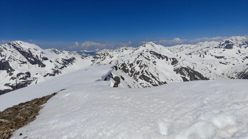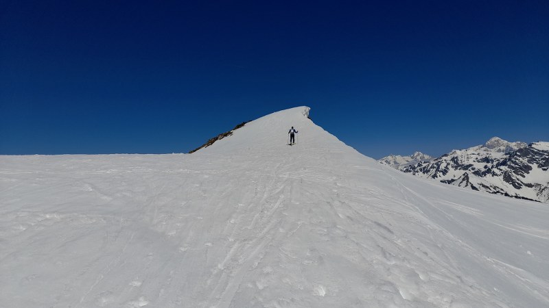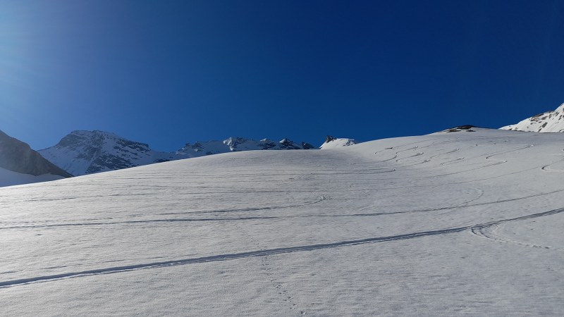Gli altri itinerari skialp in zona sono in ottime condizioni, qui 8 persone più altri verso Ormelune e Rabuigne in una giornata con cielo blu cobalto.