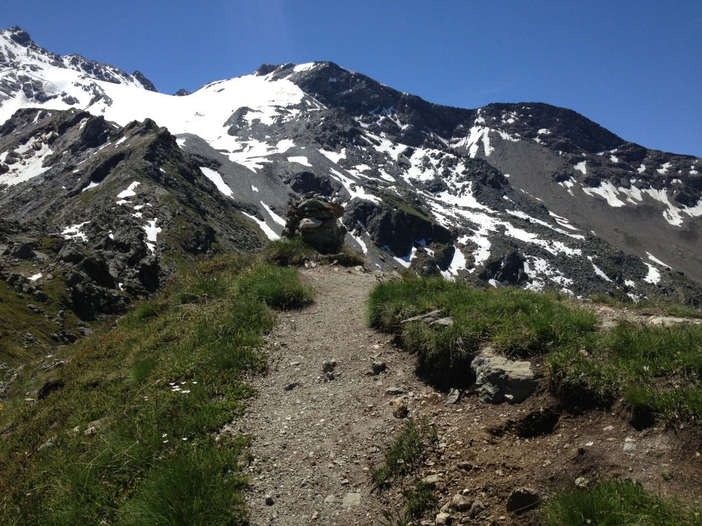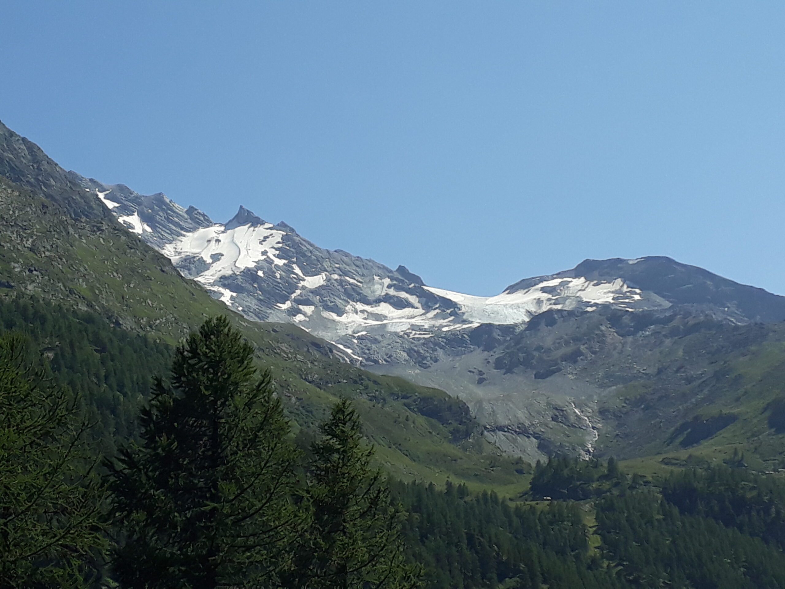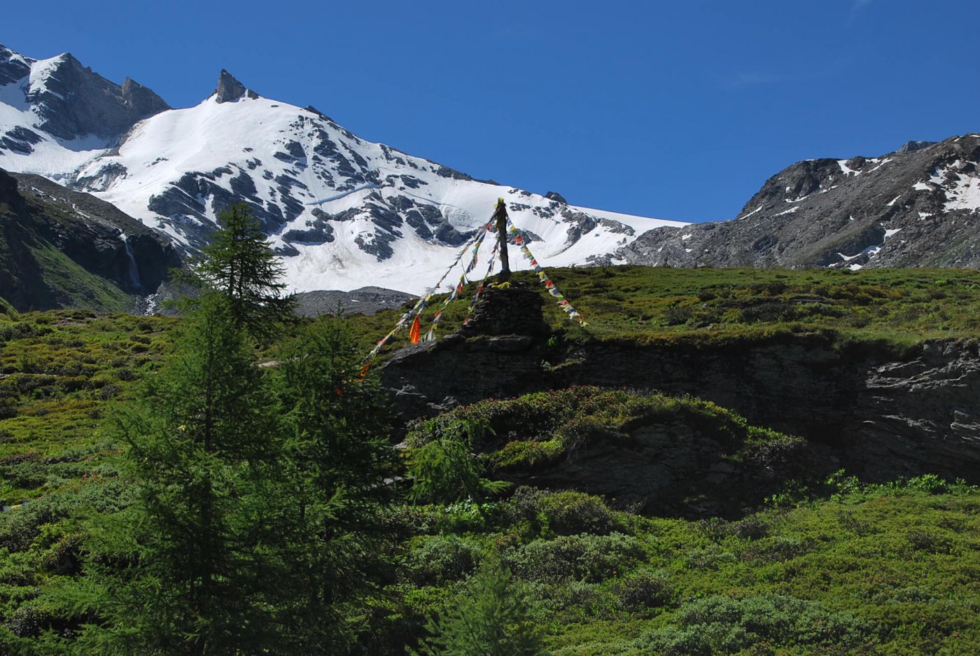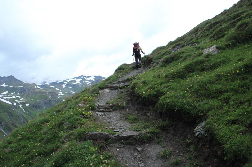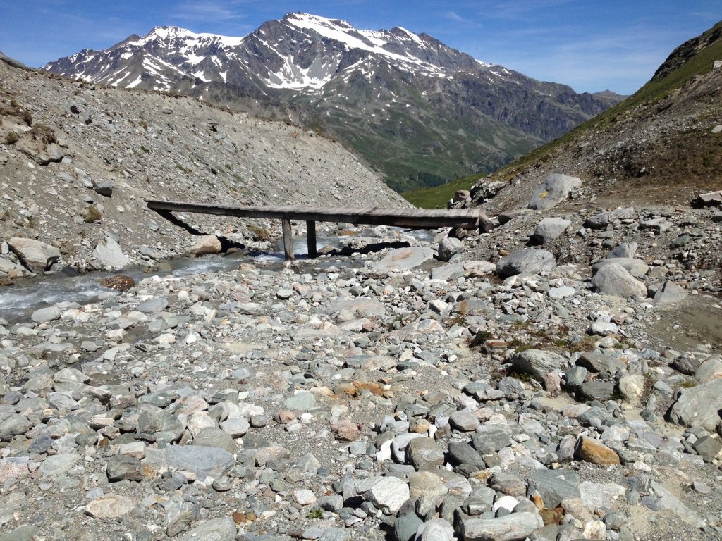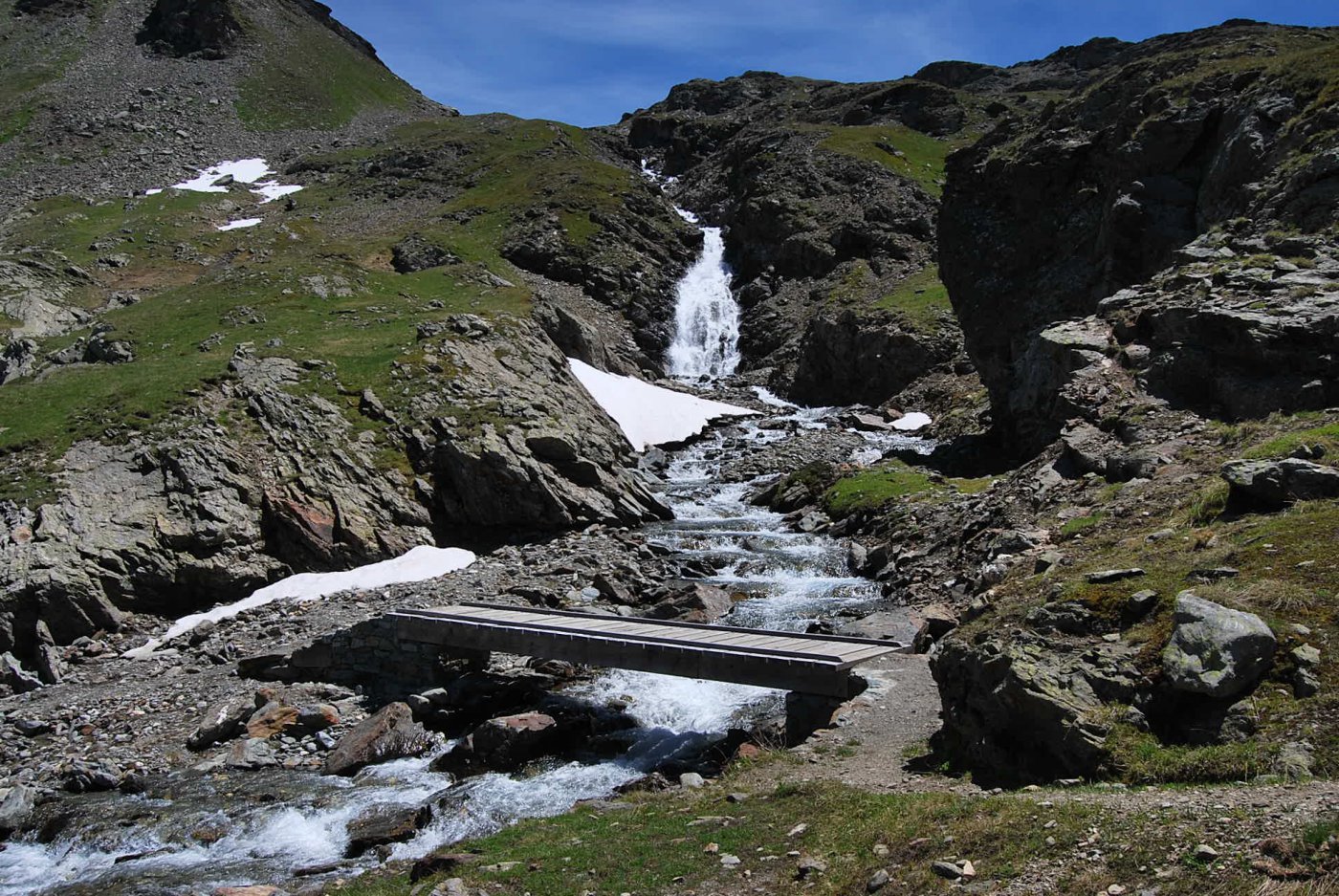 Da Usellières si supera il ponte e si prosegue lungo la strada sterrata interpoderale (vietata al traffico) che sale sulla destra. Si trascura un primo bivio sulla sinistra (è la via di accesso al Rifugio Chalet de l’Epèe) e si prosegue a destra (indicazioni per il Rifugio Bezzi). Si sale tenendosi sul lato sinistro del vallone, raggiungendo prima l’Alpeggio Le Challet m. 1926, poi si supera un torrentello su un ponte di legno fino a raggiungere le malghe diroccate note come Montagna Saxe de Savoie m. 2036, punto dove termina la strada sterrata. Si prosegue ora lungo un ottimo sentiero segnalato che prima prosegue con percorso quasi pianeggiante lungo il fondovalle, e poi sale un ripido pendio erboso con una serie di tornanti, superando una strettoia e raggiungendo uno spallone erboso cosparso di massi, fino ad individuare un ampio pianoro erboso dove si vedono le malghe delle Alpi del Vaudet e il Rifugio Bezzi m. 2284, che si raggiunge sempre su evidente e ottimo sentiero.