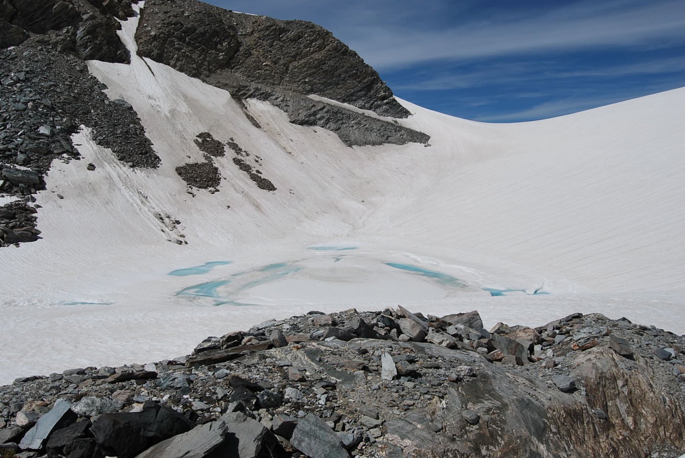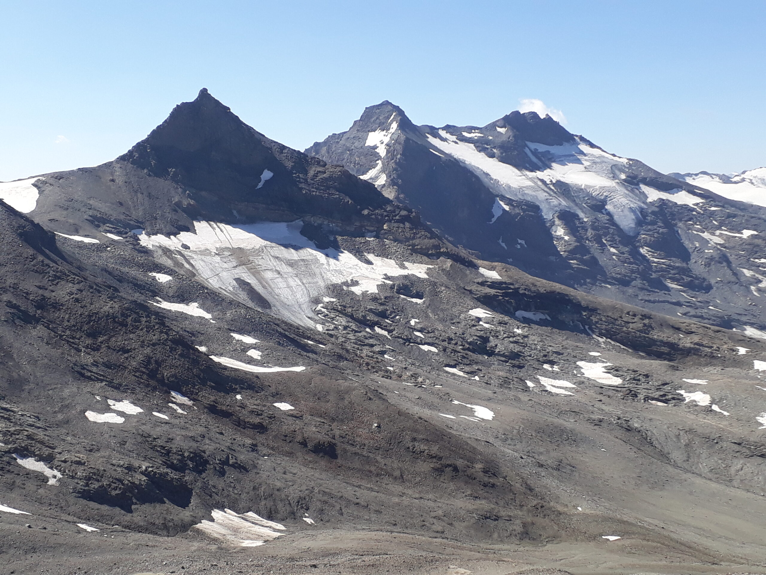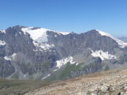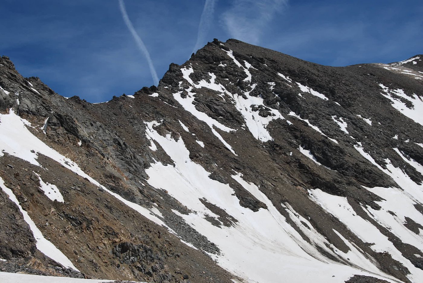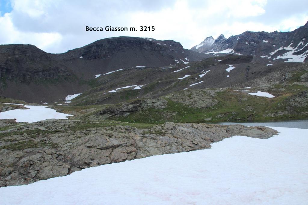 Dal rifugio si segue brevemente un sentiero a sinistra, raggiungendo alcuni cartelli indicatori. Qui si piega decisamente a sinistra (segnavia 12 e 12B indicazioni per il Colle Bassac) seguendo il sentiero che sale i ripidi pendii erbosi con una lunga serie di tornanti, prendendo rapidamente quota, fino a raggiungere il margine di un grande pianoro erboso (noto come Piano del Vaudet). Dopo un breve tratto pianeggiante verso sinistra si incrocia un bivio, dove ha inizio un sentiero che risale un dossone erboso (indicato da un ometto), si tralascia il sentiero che prosegue a destra verso il Colle Bassac, proseguendo in leggera salita fino ad incontrare un secondo bivio, qui si deve volgere a destra, verso il Lago di San Martino (cartello indicatore). Si sale superando valloncelli erbosi e detritici (ometti e segnavia) raggiungendo una conca di lastroni rocciosi che ospita il Lago di San Martino m. 2726. Si piega a sinistra, per attraversare il lago, e risalire lungo la sponda sinistra (ometti) in direzione del soprastante (e ben visibile !) Ghiacciaio di San Martino. Si risale la morena, senza raggiungere però il ghiacciaio, entrati nel valloncello sotto il Truc Blanc si piega decisamente a sinistra, e si procede a vista, sempre aiutati dagli ometti presenti sul posto, in direzione dell’ampia sella del Colle Giasson. Si supera un ripido pendio detritico che porta ad una larga insellatura, dove ha inizio il Ghiacciaio del Giasson, si supera una conca con un piccolo laghetto glaciale per raggiungere il Colle Giasson m. 3154. Dal colle si piega a sinistra per risalire in diagonale una ripida ma breve rampa nevosa che porta sull’ampio crestone sommitale, piegando a destra si raggiunge la cima, indicata da un ometto di pietre e un paletto in legno (ore 3,30 dal Rifugio Bezzi). In discesa si segue a ritroso lo stesso itinerario di salita.