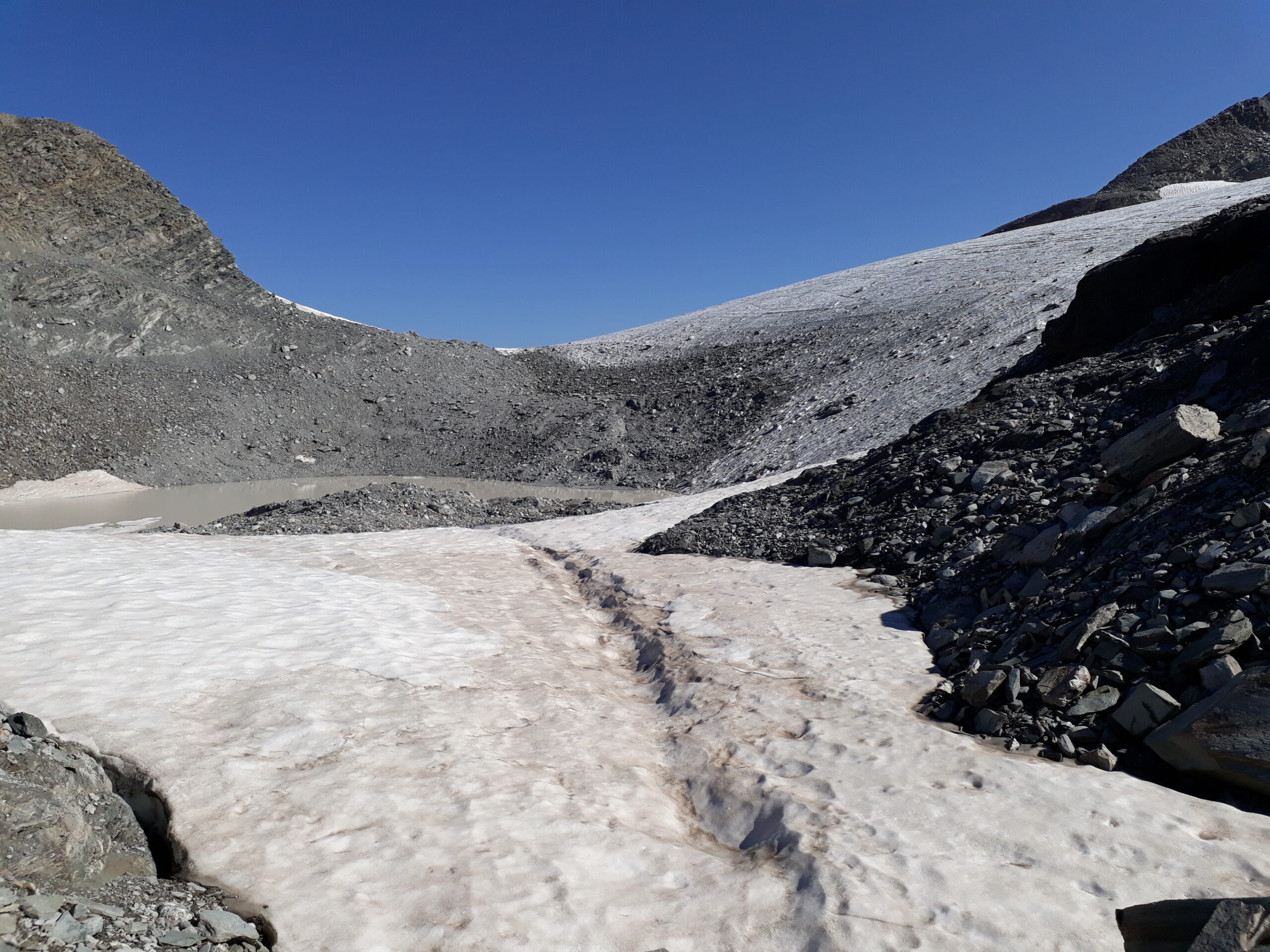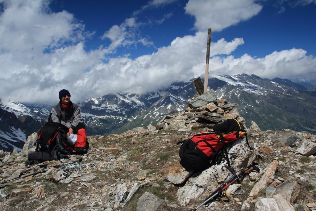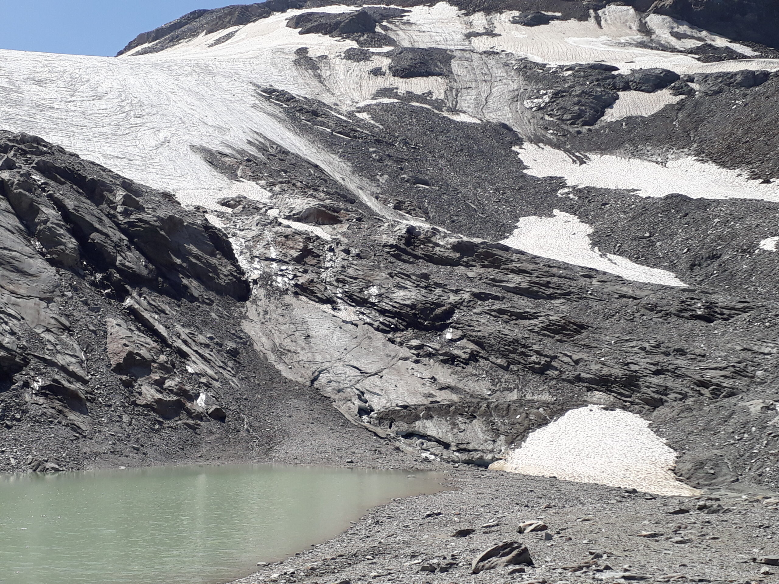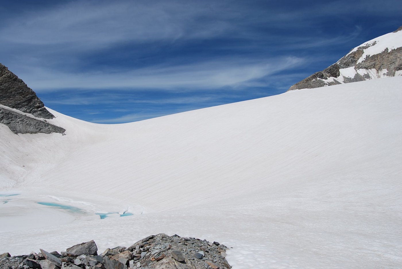 Dal rifugio si segue brevemente un sentiero a sinistra, raggiungendo alcuni cartelli indicatori. Qui si piega decisamente a sinistra (segnavia 12 e 12B indicazioni per il Colle Bassac) seguendo il sentiero che sale i ripidi pendii erbosi con una lunga serie di tornanti, prendendo rapidamente quota, fino a raggiungere il margine di un grande pianoro erboso (noto come Piano del Vaudet). Dopo un breve tratto pianeggiante verso sinistra si incrocia un bivio, dove ha inizio un sentiero che risale un dossone erboso (indicato da un ometto), si tralascia il sentiero che prosegue a destra verso il Colle Bassac, proseguendo in leggera salita fino ad incontrare un secondo bivio, qui si deve volgere a destra, verso il Lago di San Martino (cartello indicatore). Si sale superando valloncelli erbosi e detritici (ometti e segnavia) raggiungendo una conca di lastroni rocciosi che ospita il Lago di San Martino m. 2726. Si piega a sinistra, per attraversare il lago, e risalire lungo la sponda sinistra (ometti) in direzione del soprastante (e ben visibile !) Ghiacciaio di San Martino. Si risale la morena, senza raggiungere però il ghiacciaio, entrati nel valloncello sotto il Truc Blanc si piega decisamente a sinistra, e si procede a vista, sempre aiutati dagli ometti presenti sul posto, in direzione dell’ampia sella del Colle Giasson. Si supera un ripido pendio detritico che porta ad una larga insellatura, dove ha inizio il Ghiacciaio del Giasson, si supera una conca con un piccolo laghetto glaciale per raggiungere il Colle Giasson m. 3154. Dal colle si piega a sinistra per risalire in diagonale una ripida ma breve rampa nevosa che porta sull’ampio crestone sommitale, piegando a destra si raggiunge la cima, indicata da un ometto di pietre e un paletto in legno (ore 3,30 dal Rifugio Bezzi). In discesa si segue a ritroso lo stesso itinerario di salita.