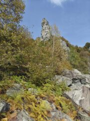 L3: con un passo tornare dalla foglia alla struttura centrale del monolito (passaggio ben protetto a spit). iniziali facili gradinamenti che si tramutano in fessura molto ripida (passaggio chiave, sinceramente trovata di 5c, poi magari l’ho interpretata male io). Sosta sulla grande cengia. 25m 4b di cui 3m di 5c spittati lunghi ma proteggibili nella fessura.