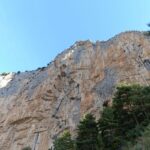 Suggerisco di invertire le quotazioni date dalla guida, nel senso che il secondo tiro è un ottimo 6a/b verticale e su appigli assai stondi e non un 6a come sul disegno, mentre il settimo tiro, dato 6a+, è un bellissimo 5c/6a.