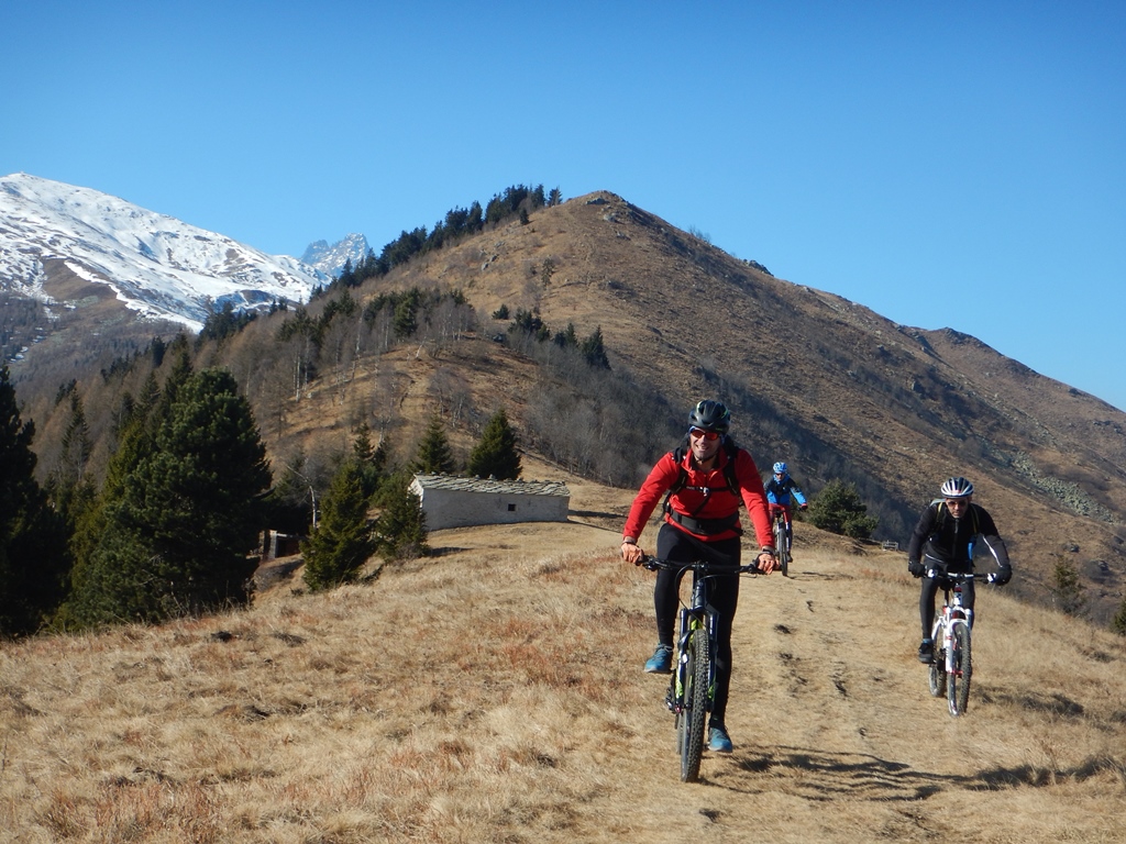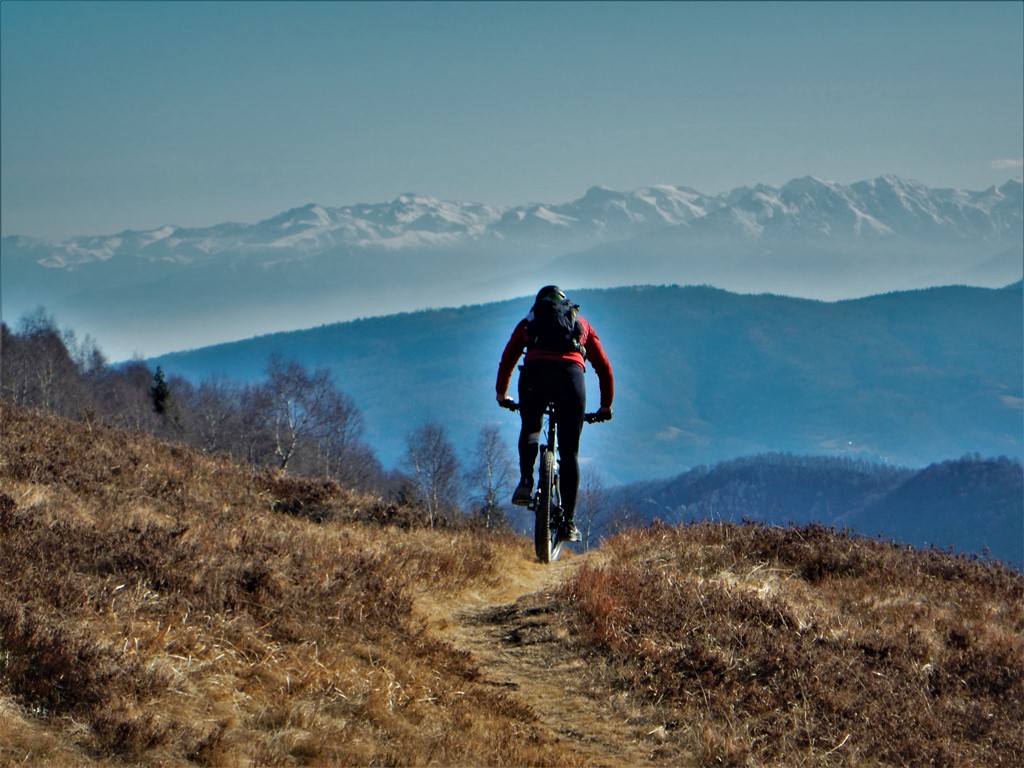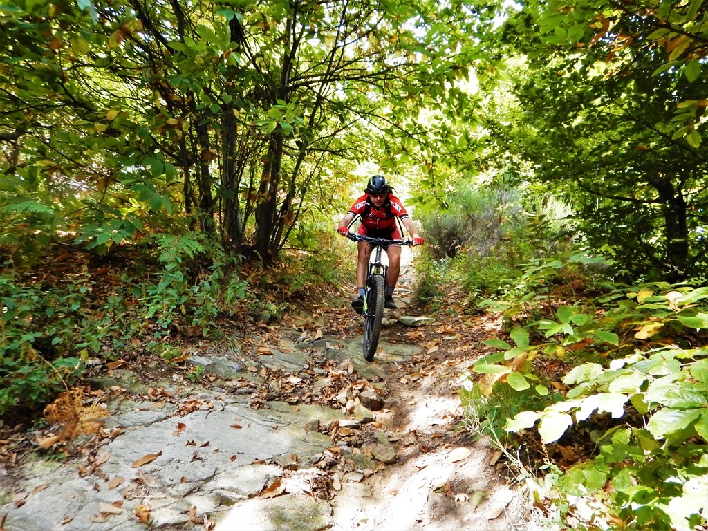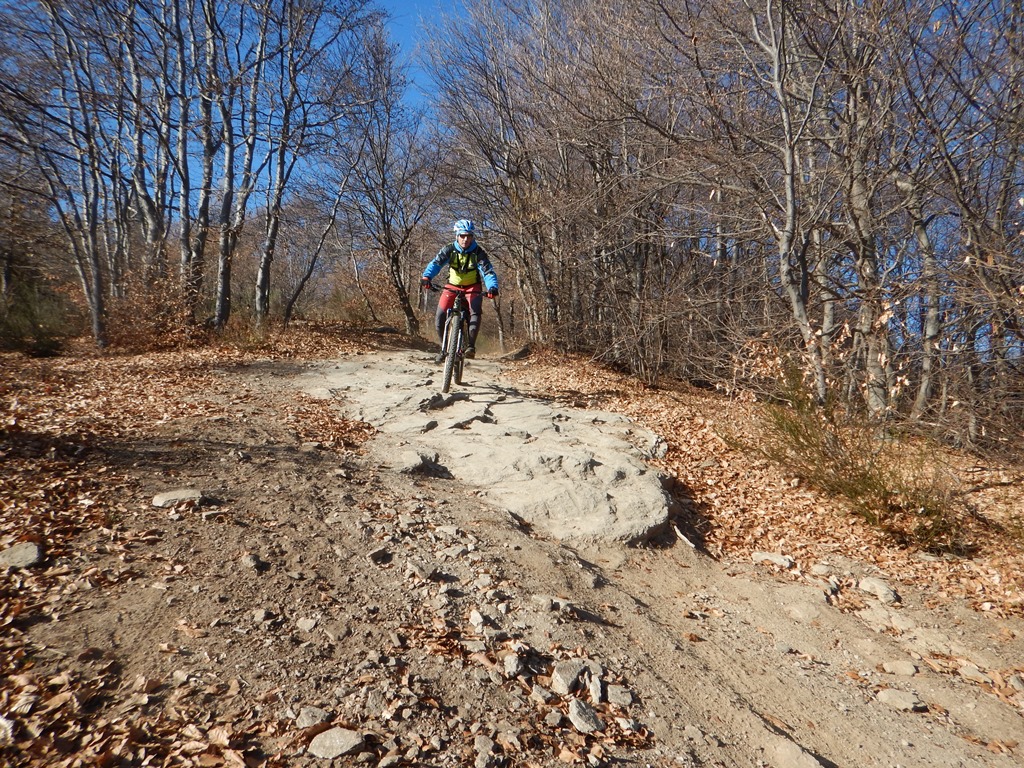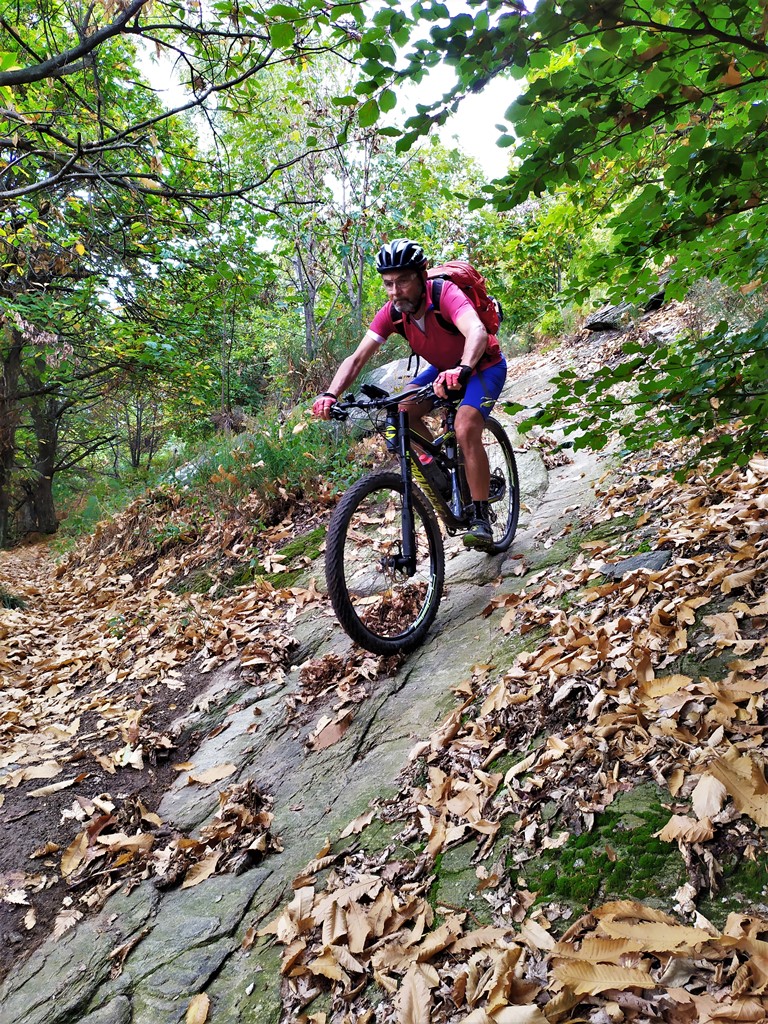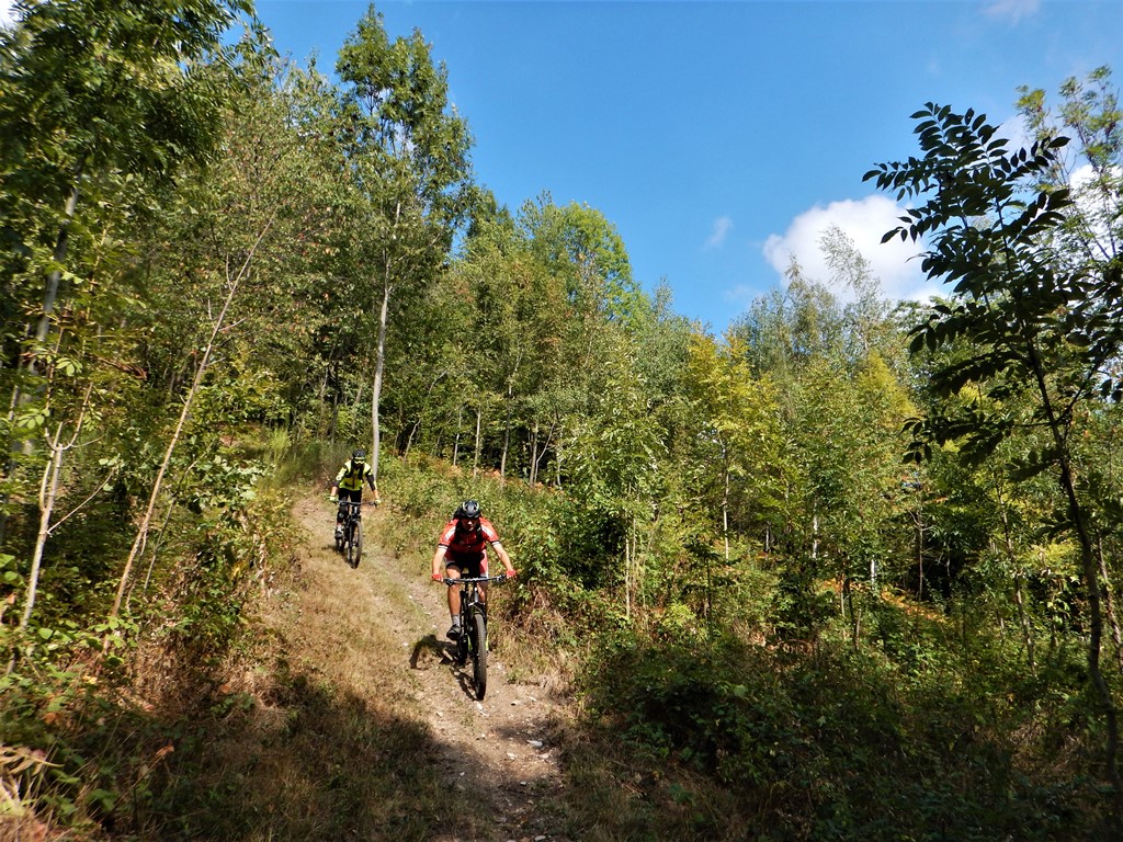 Tralasciata sulla dx una traccia che scende a Martiniana e superata la località Pra la Tampa si deve abbandonare la sterrata che dopo pochi metri comincerebbe a scendere per seguire sulla dx un sentiero ben segnalato inizialmente in forte salita. Il sentiero non è ciclabile nel primo tratto ma in breve diventa pressochè pianeggiante e ben ciclabile.